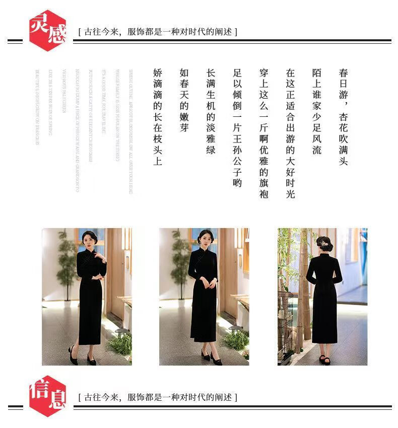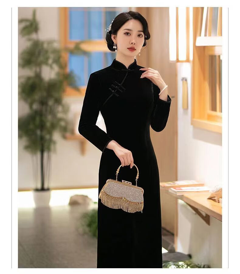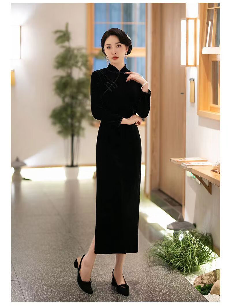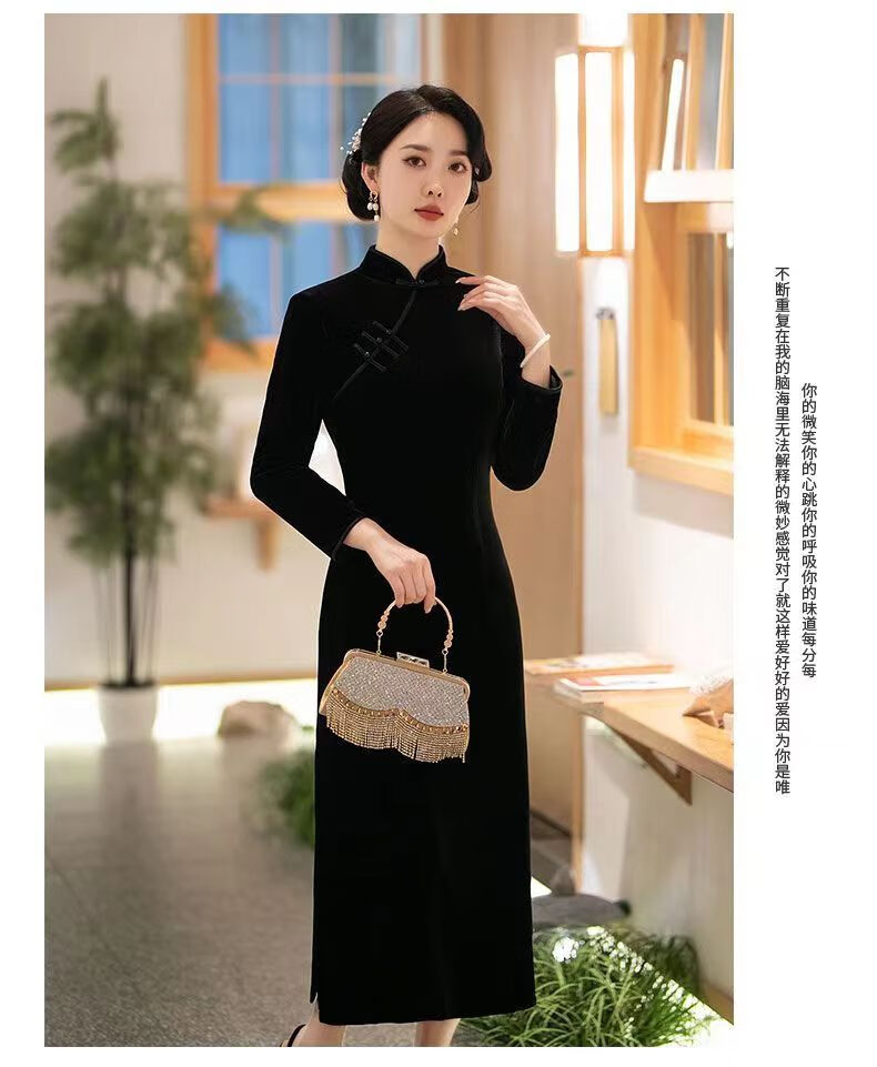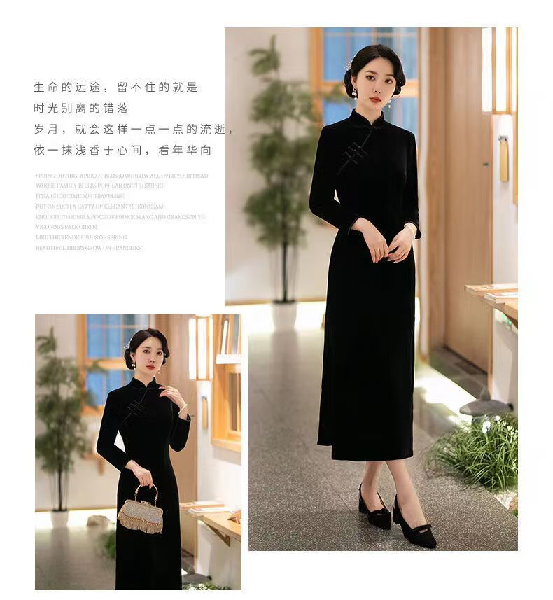 Pierre Cardin autumn and winter new velvet plus velvet cheongsam for women Chinese style retro slim slim long cheongsam dress for women black plus velvet thickened XL recommended 110-120Jin Jin equals 0.5 kg