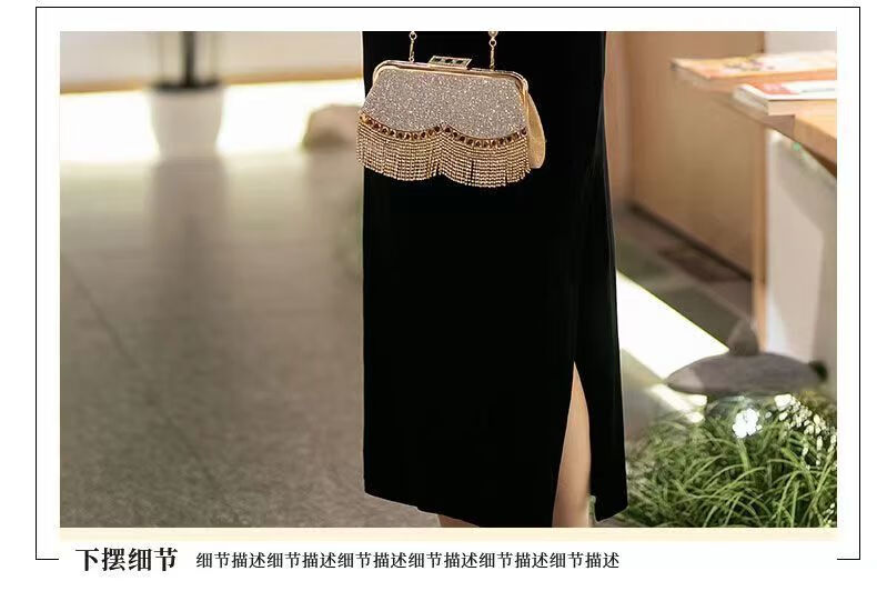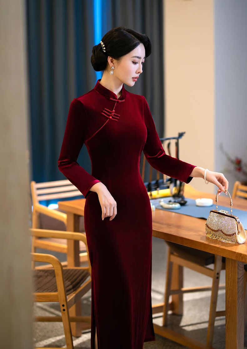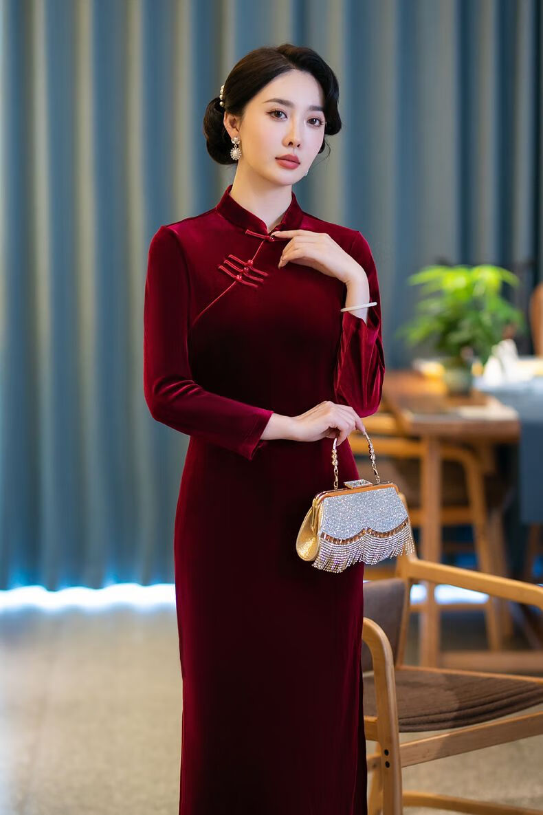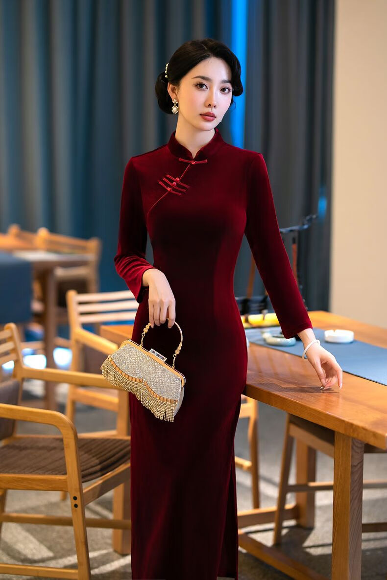 Pierre Cardin autumn and winter new velvet plus velvet cheongsam for women Chinese style retro slim slim long cheongsam dress for women black plus velvet thickened XL recommended 110-120Jin Jin equals 0.5 kg