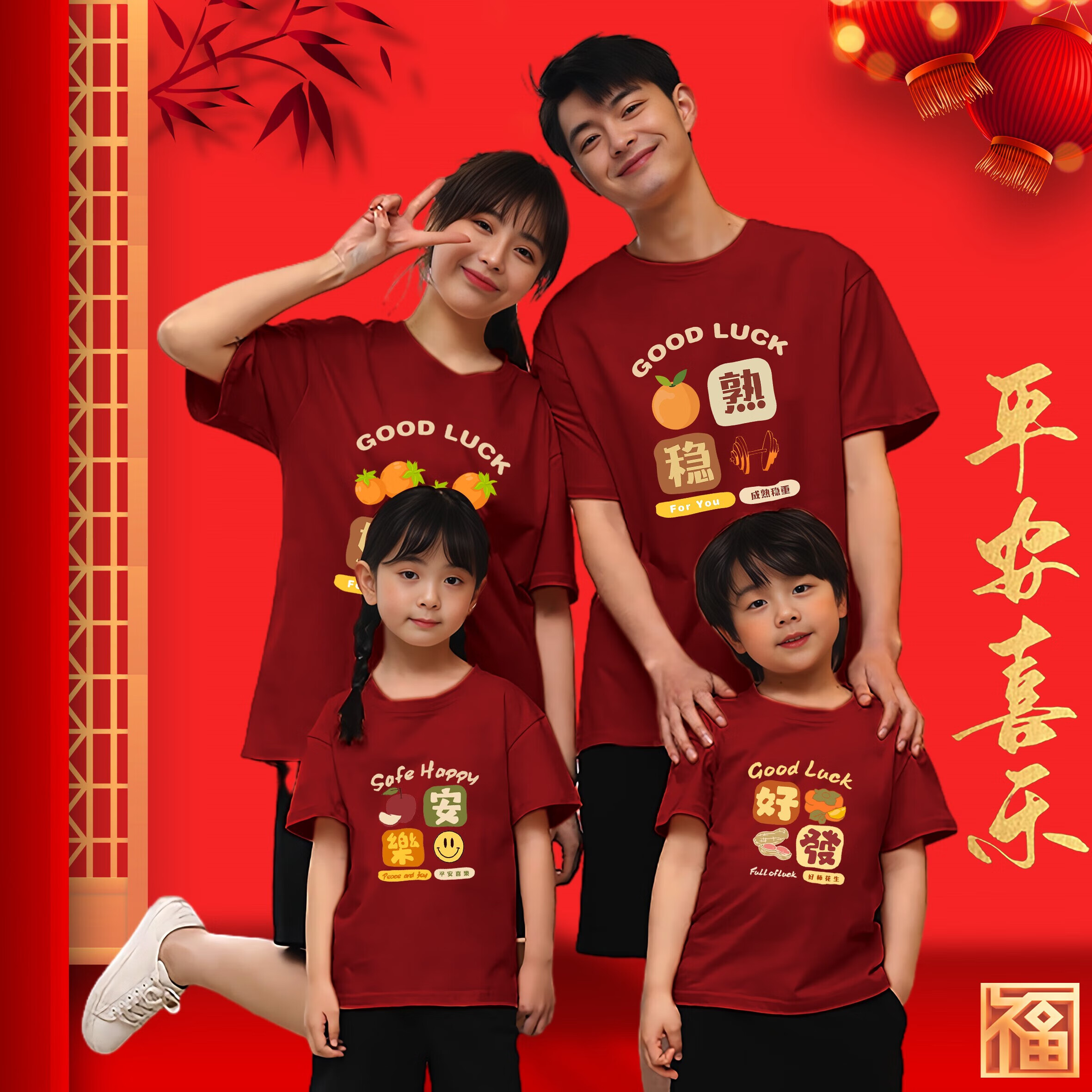2026 Year of the Horse, the zodiac year, peace, joy and good things happen. Red short-sleeved T-shirt customized happy new year parent-child wear. Wine red peace and joy chest label -001 170 L165-175CM125-140Jin Jin is equal to 0.5 kg