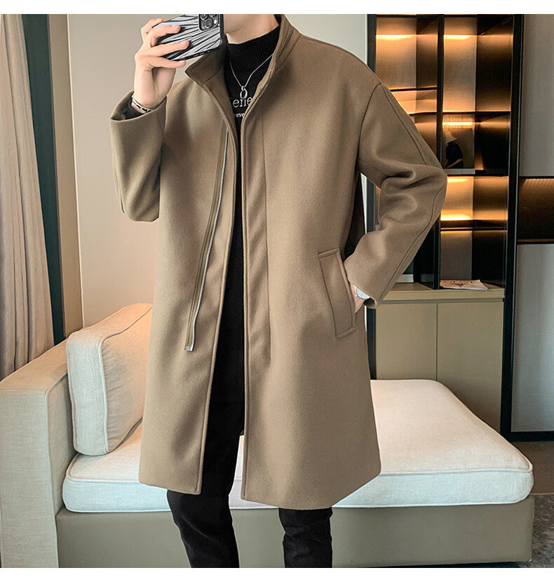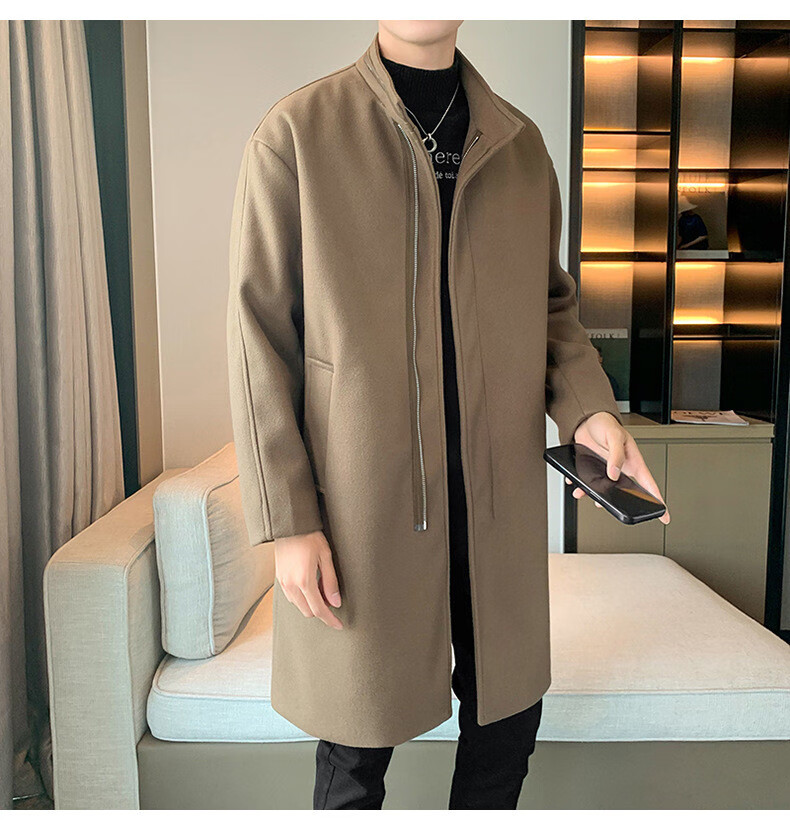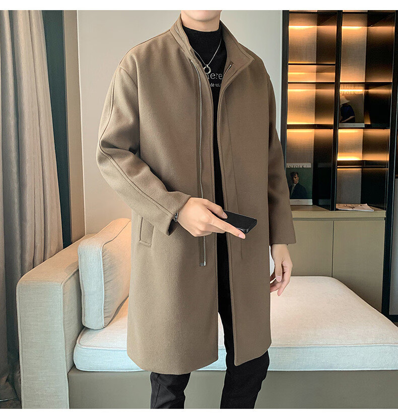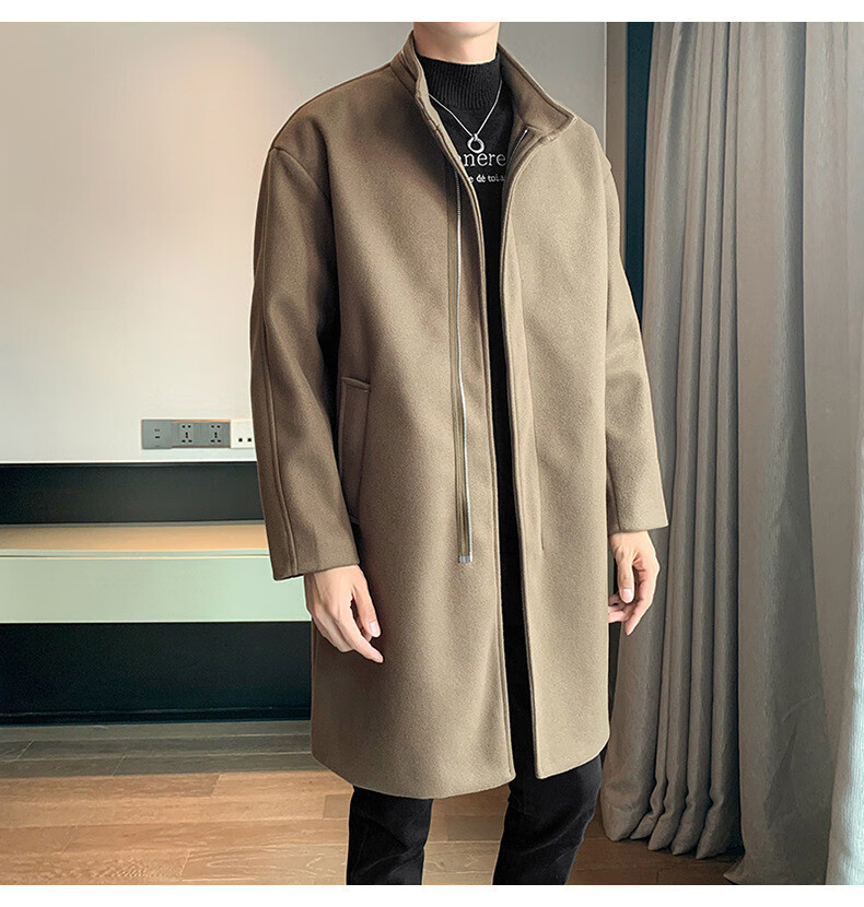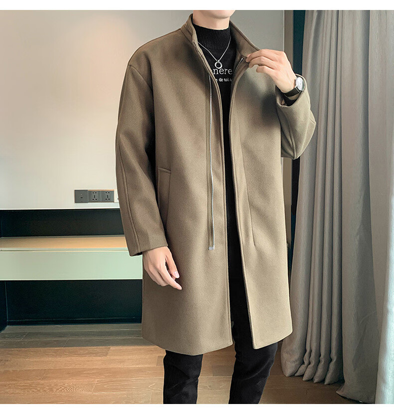 JEEP SPIRIT Spring and Autumn Zipper Design Stand Collar Woolen Windbreaker Men's Mid-Length Thick Casual Woolen Coat Jacket Trendy Coffee and Cotton 2XL