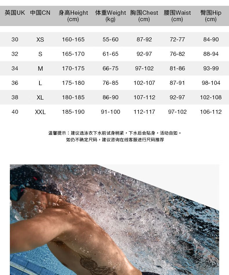 China (cm) 165 / 88-90 170 / 96-98 175 / 108-110 180 / 118-122 185 / 126-130
