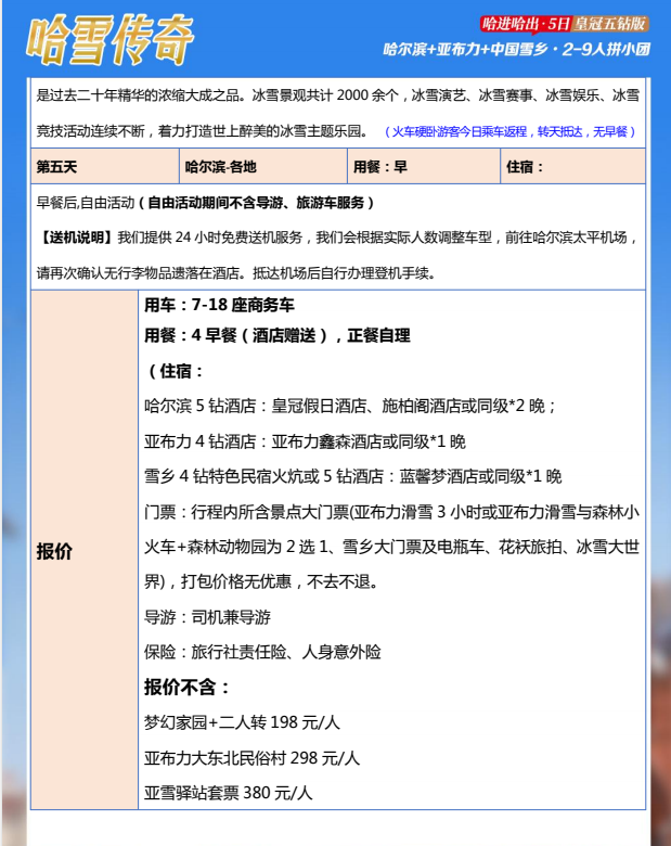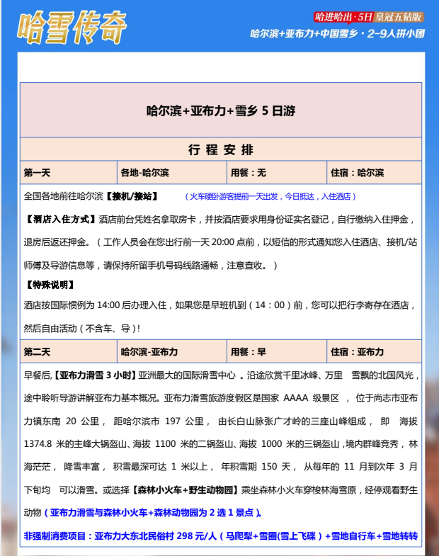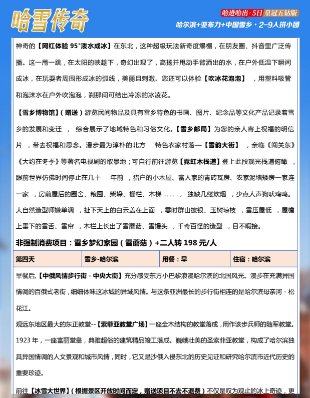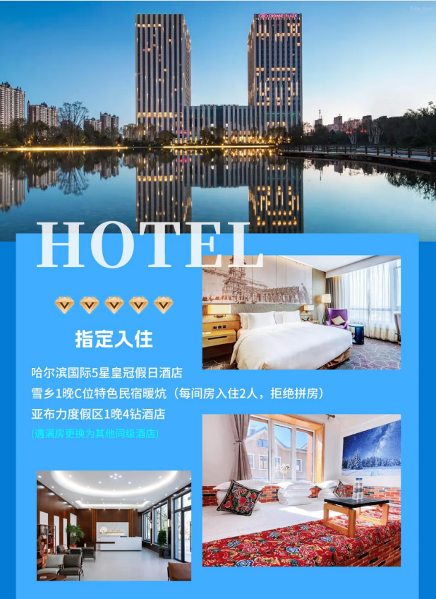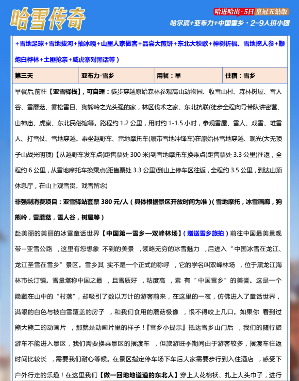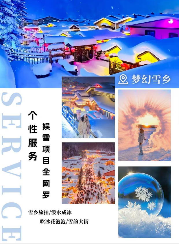 2-9 people in a small group Northeast Tourism Harbin Yabuli Snow Township 5 days and 4 nights group tour/Yabuli Skiing/Snow Township/Ice and Snow Gallery/Horse-drawn sledge/Splashing water into ice Join the group on the ground January 1st - February 16th If you need round-trip transportation, please contact customer service