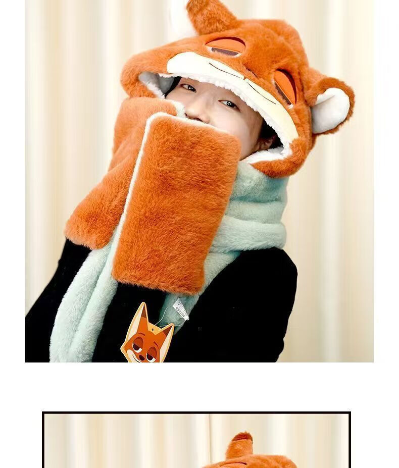 Huan Shuai Zootopia's same style hooded scarf. Three-in-one warm, soft and cute. Couple's best friend's movie star in autumn and winter. Fox Nick hooded scarf + gloves. High-end quality/fine workmanship.