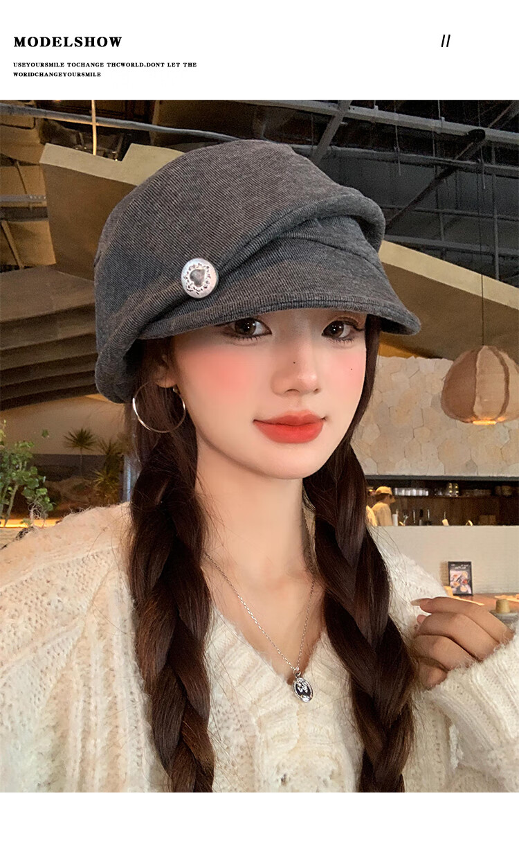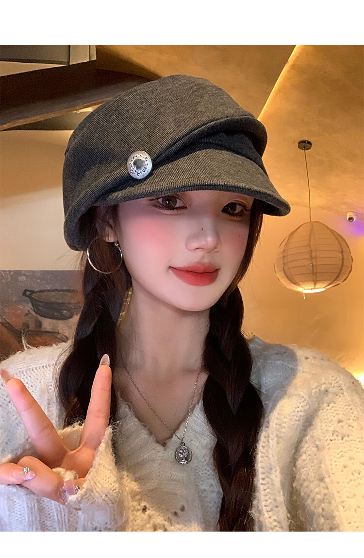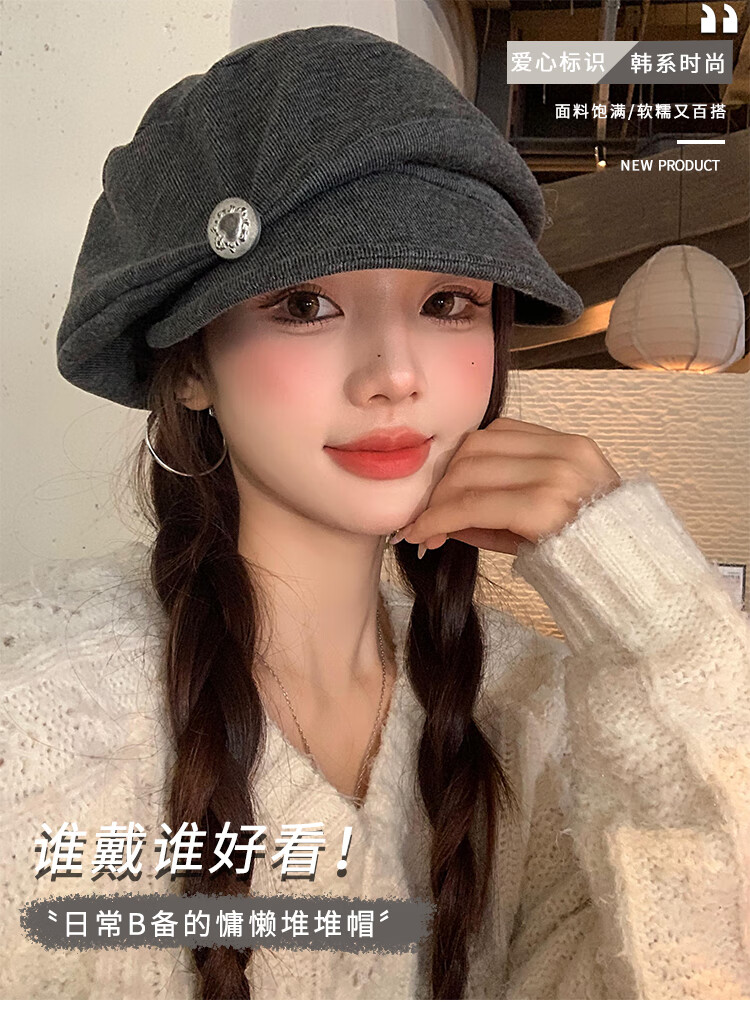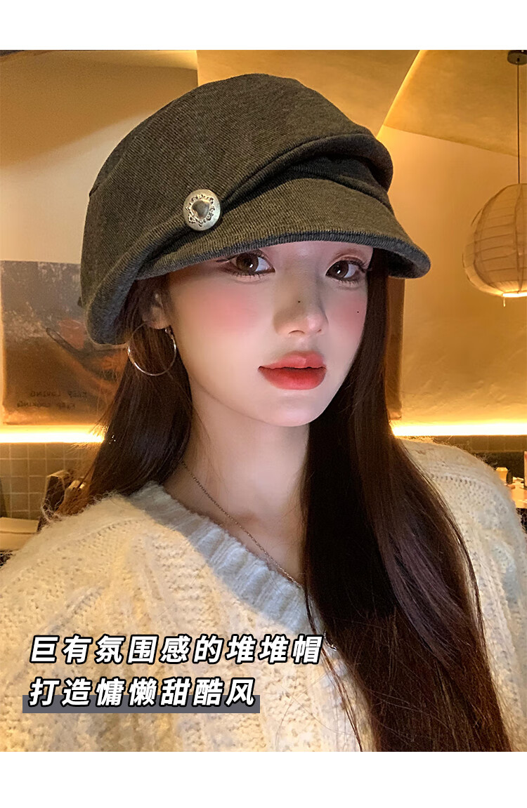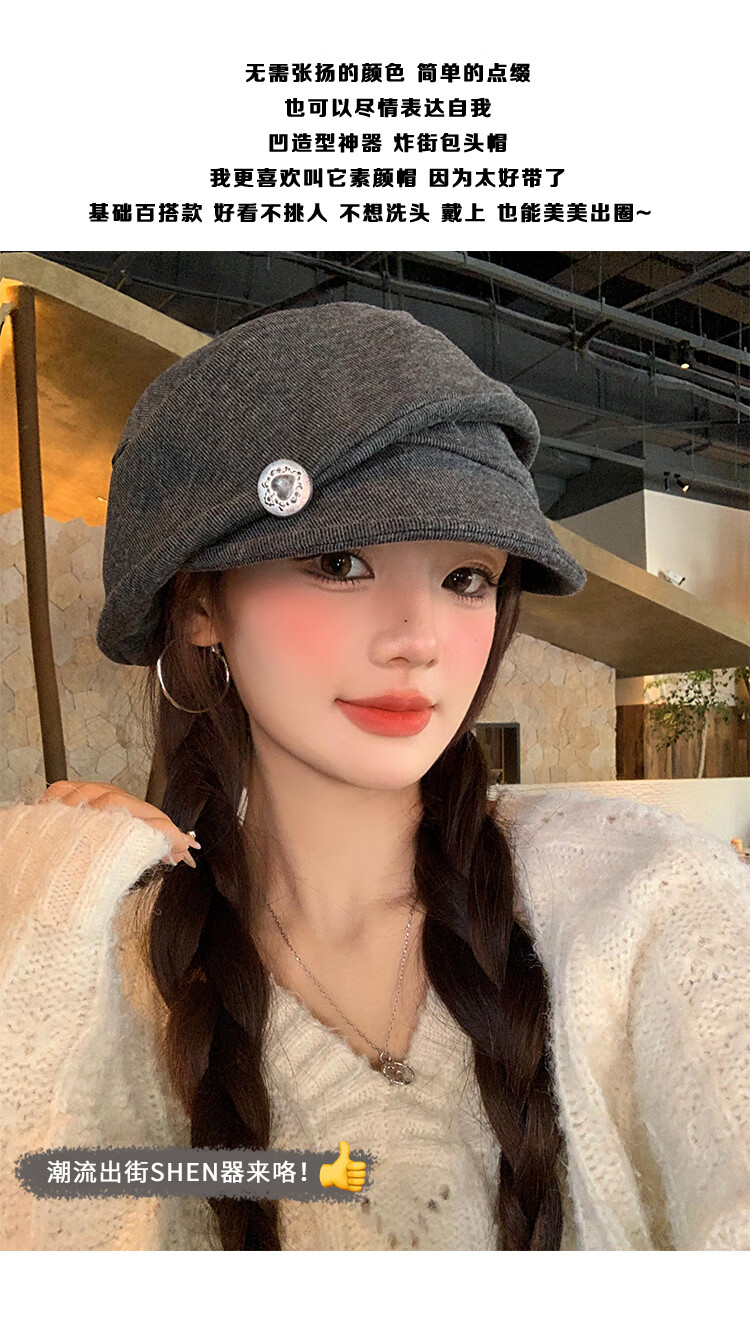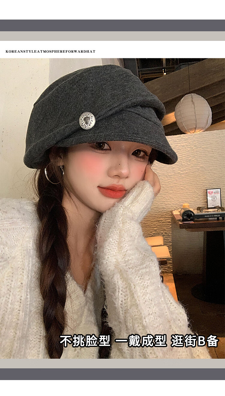 Shen Shi Yi Japanese retro pleated beret women's 2025 new versatile Baotou hat big head circumference showing face little painter hat trendy love button beret dark gray one size