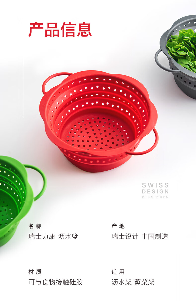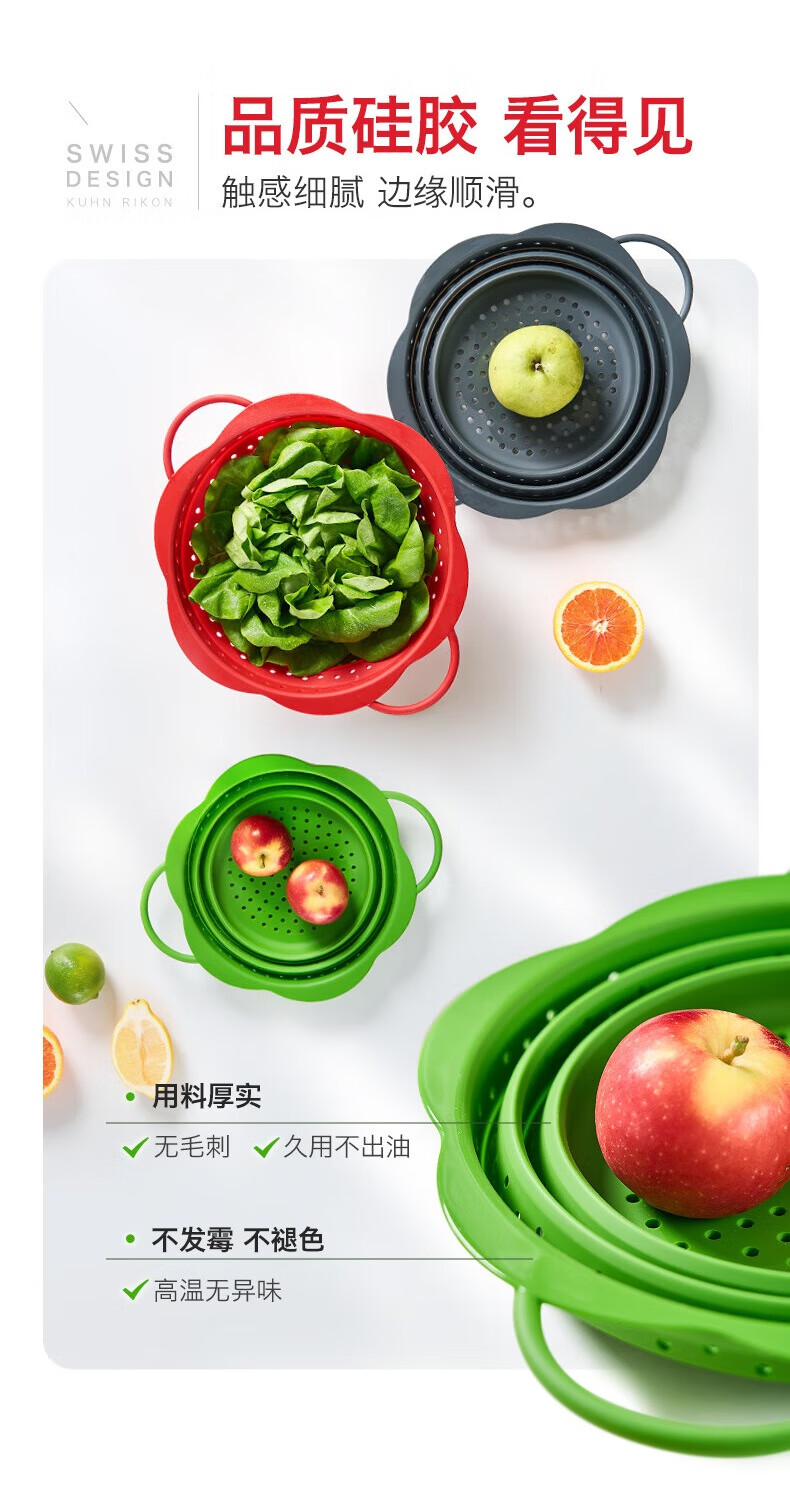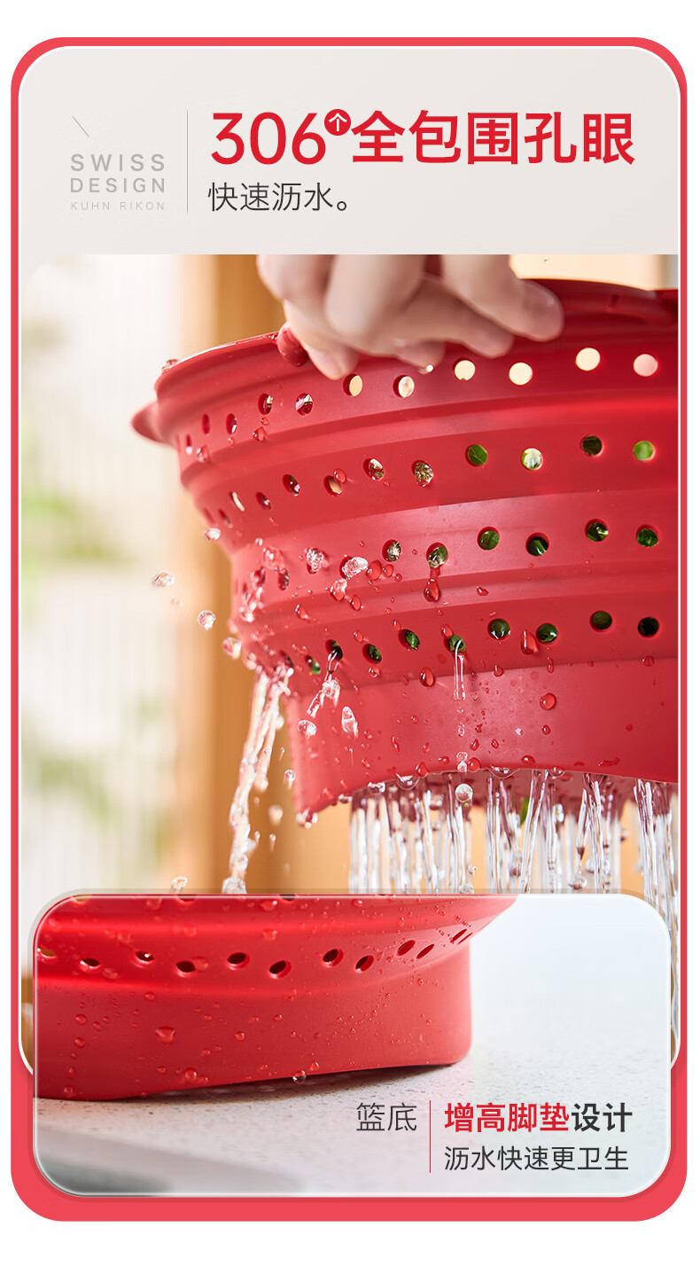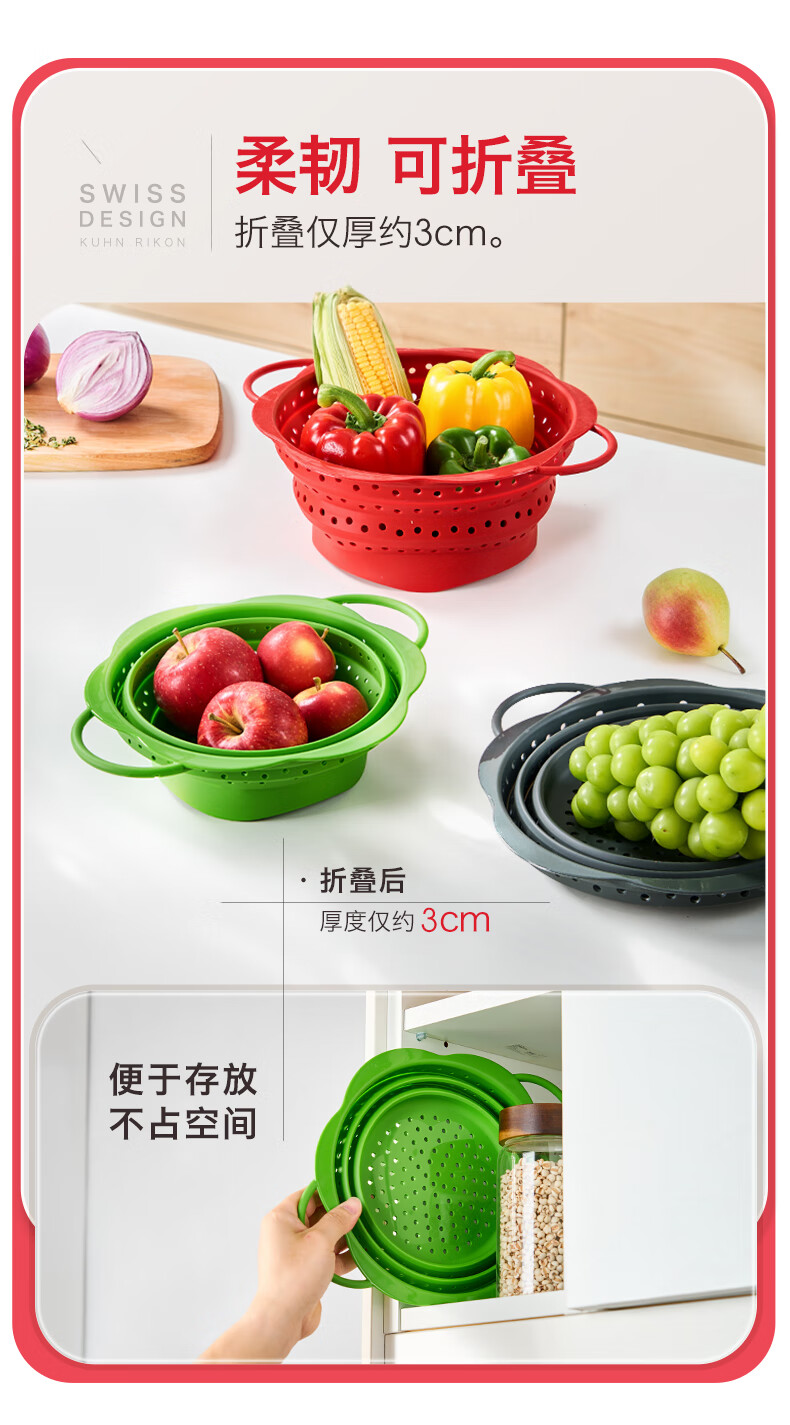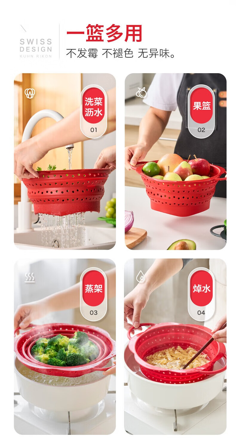 Swiss Likang folding silicone drain basket vegetable basket kitchen vegetable and fruit vegetable basin drain basket high temperature resistant food grade red large dishwasher