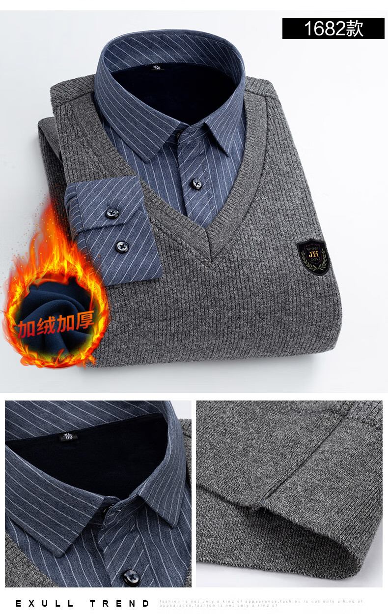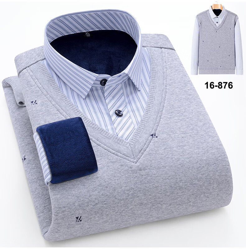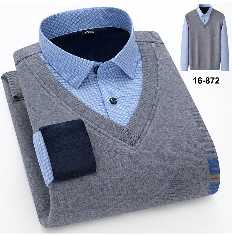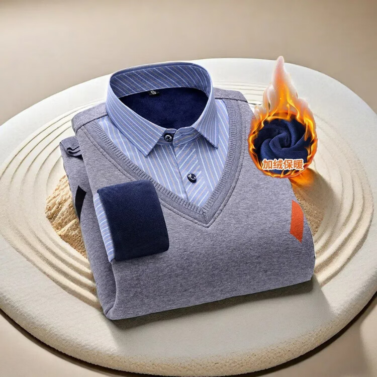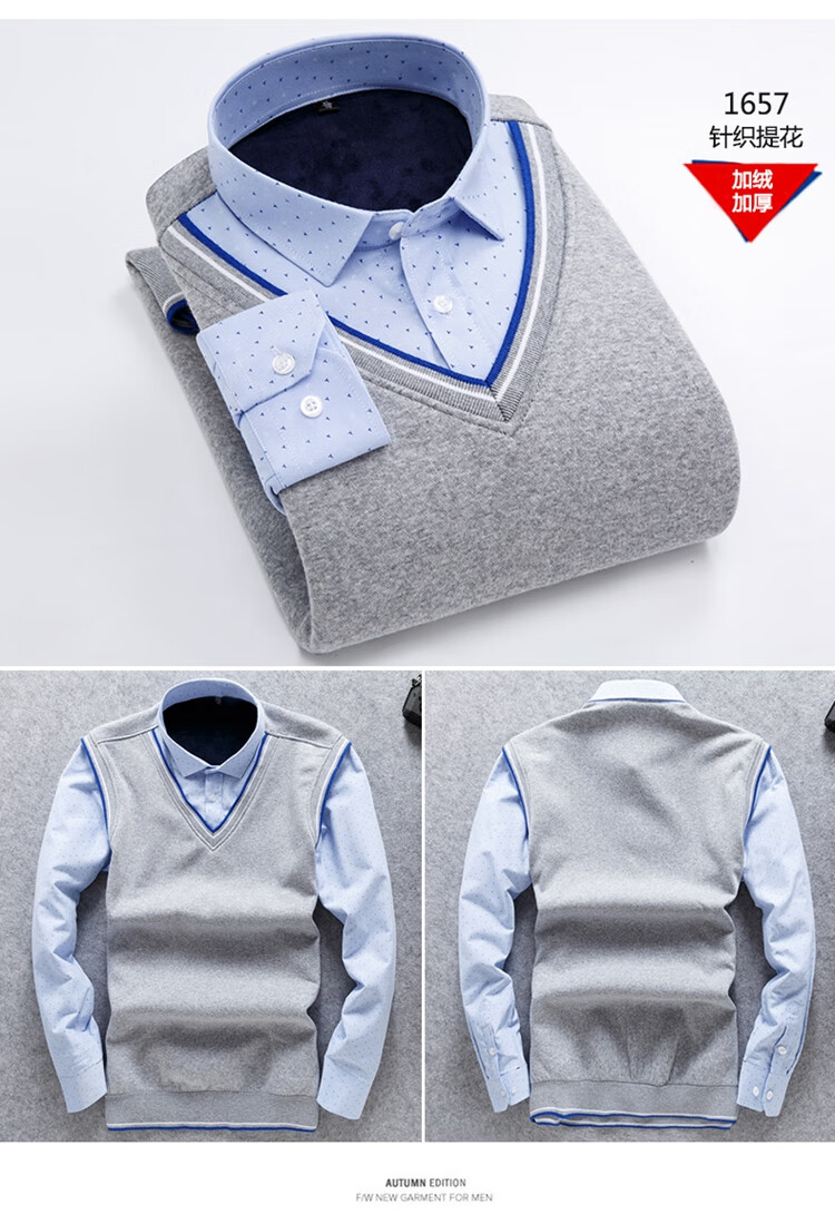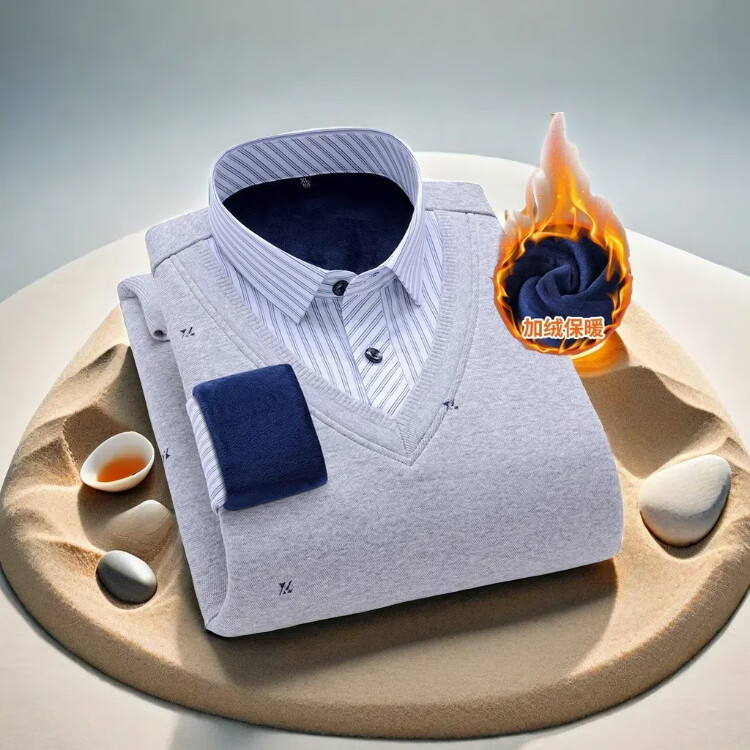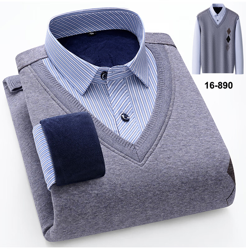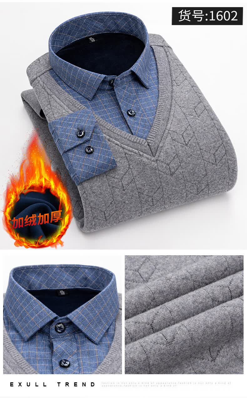 罗蒙(ROMON)冬季男士假两件套保暖衬衫领男长袖加厚加绒中年父亲装针织衫毛衣 灰色 1613 XL 【加绒加厚】