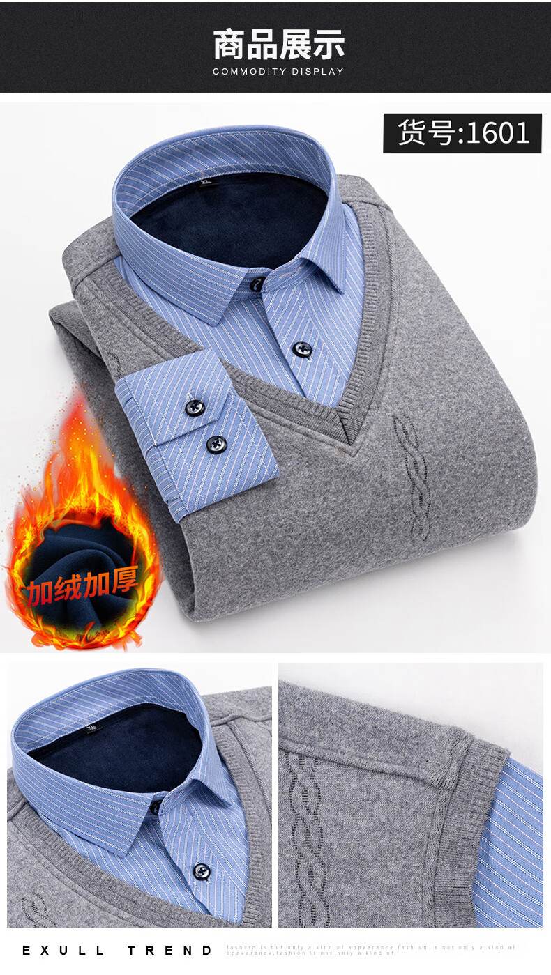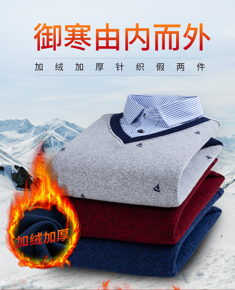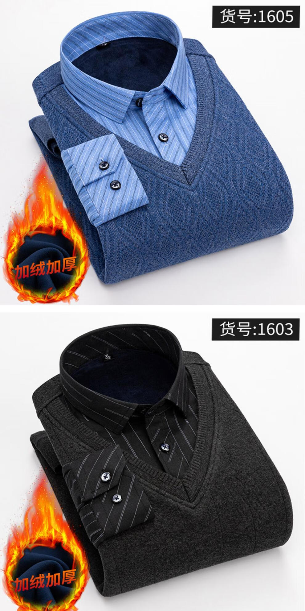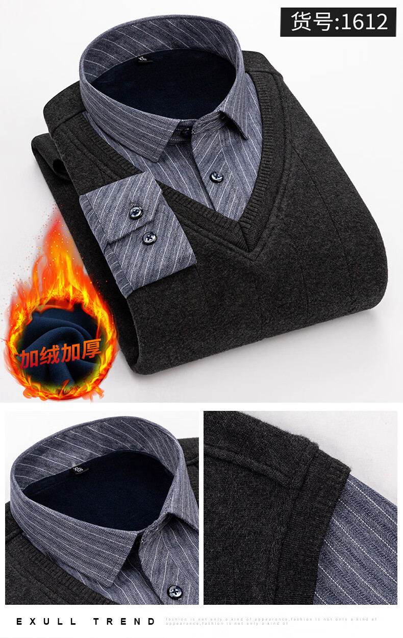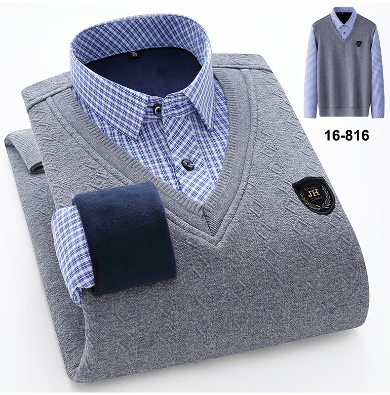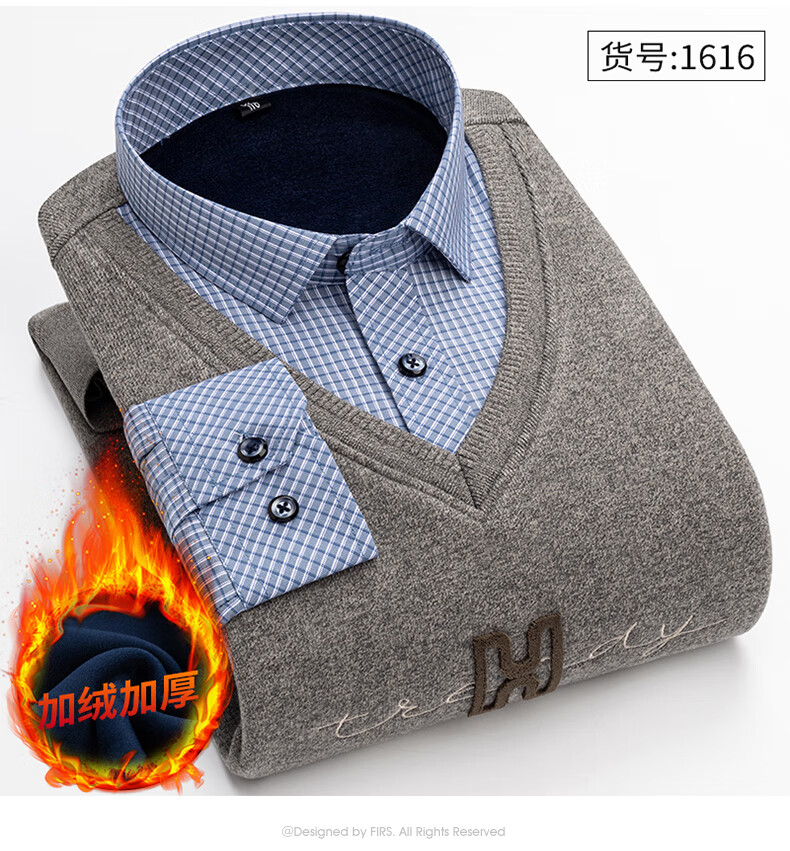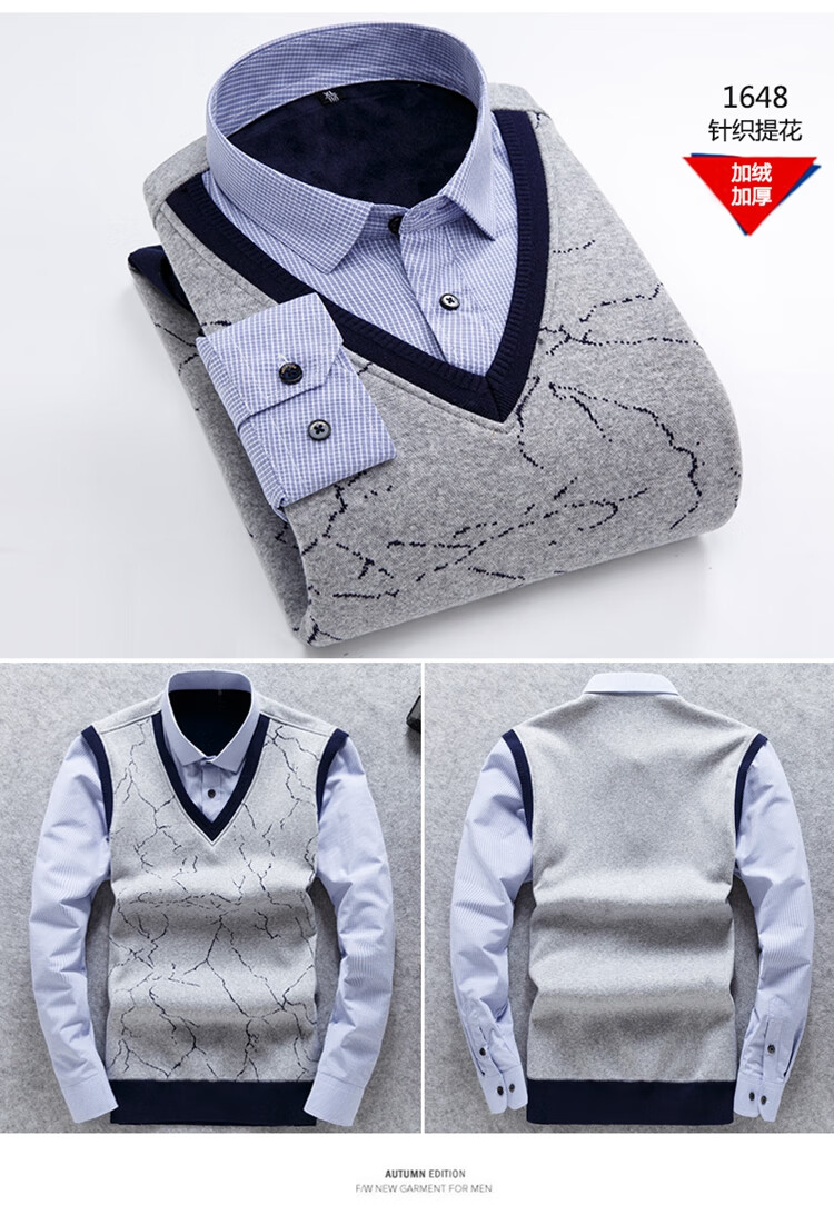 罗蒙(ROMON)冬季男士假两件套保暖衬衫领男长袖加厚加绒中年父亲装针织衫毛衣 灰色 1613 XL 【加绒加厚】