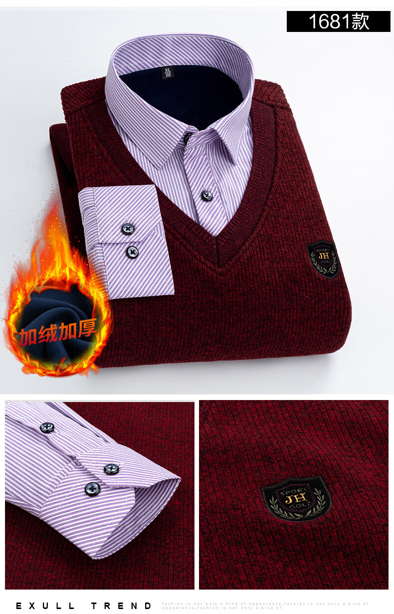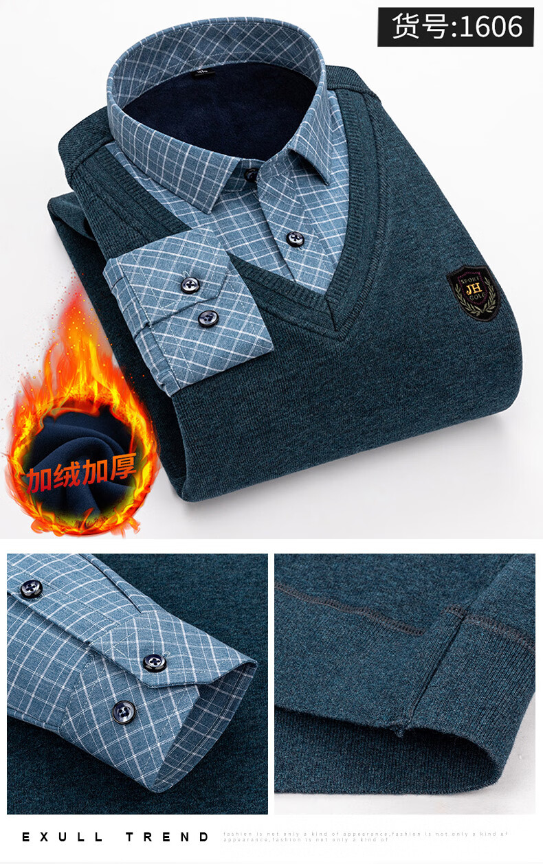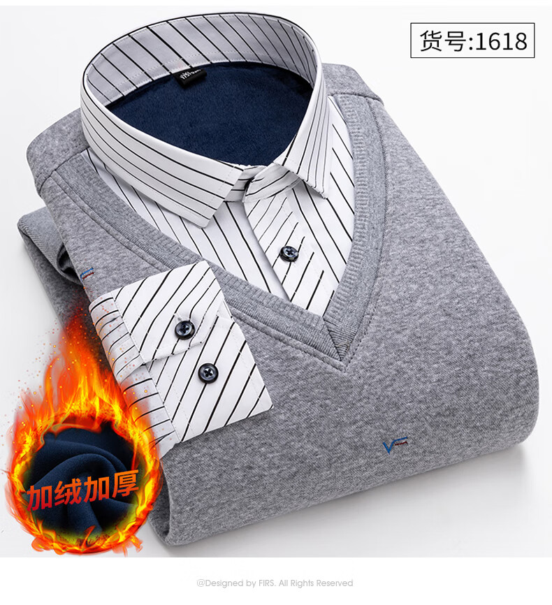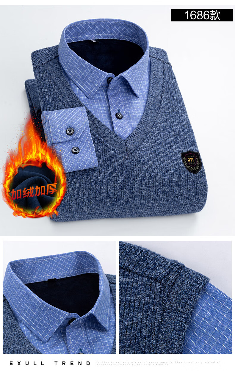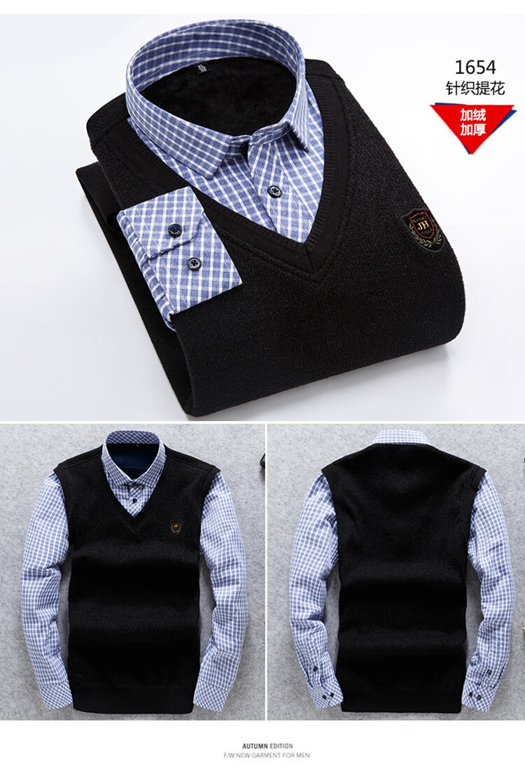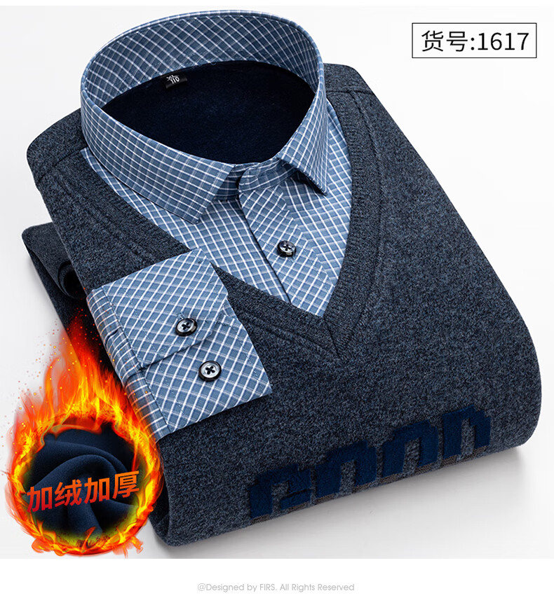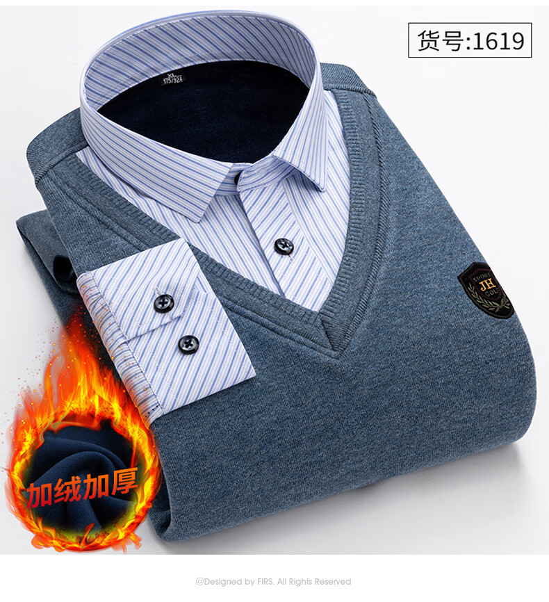 罗蒙(ROMON)冬季男士假两件套保暖衬衫领男长袖加厚加绒中年父亲装针织衫毛衣 灰色 1613 XL 【加绒加厚】