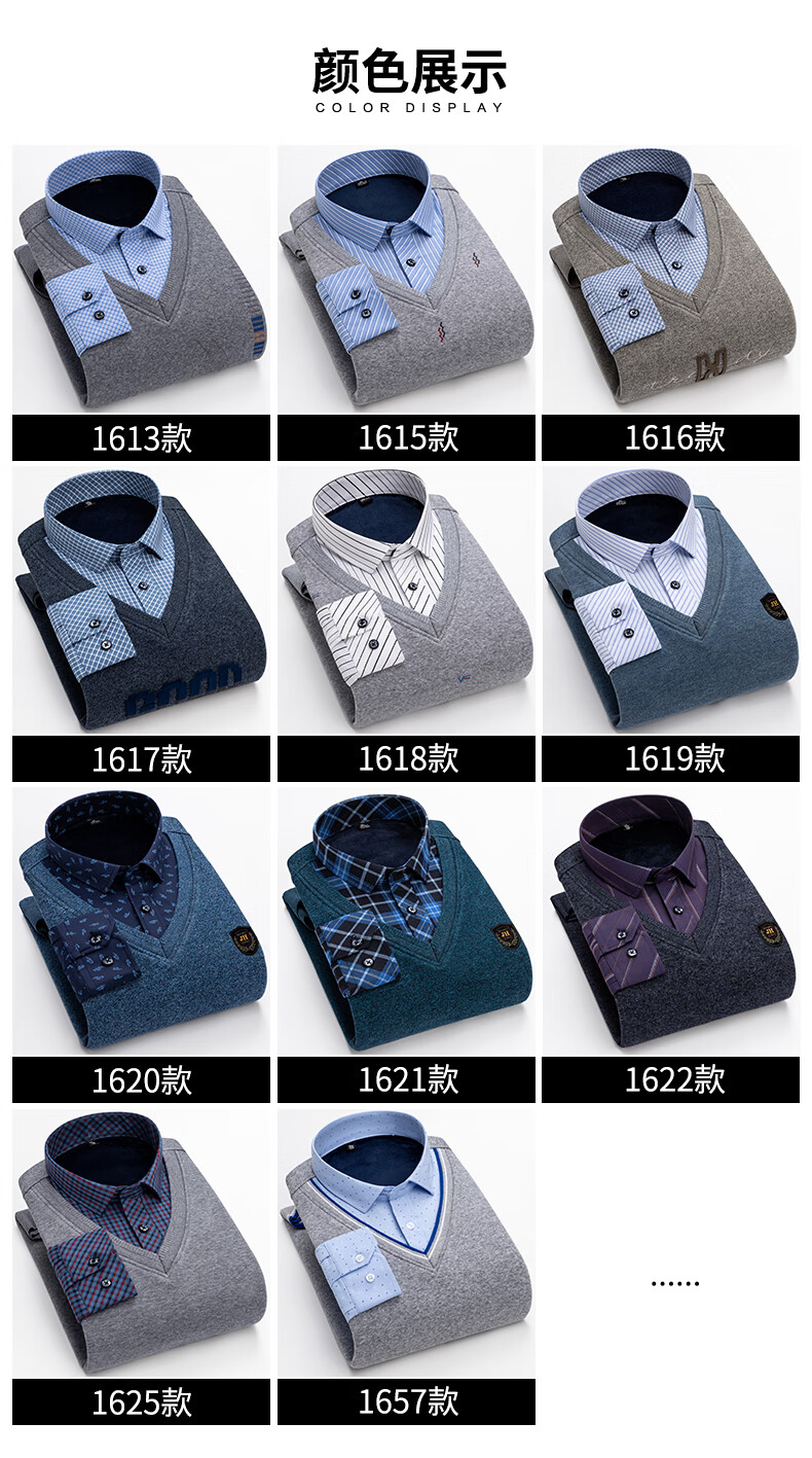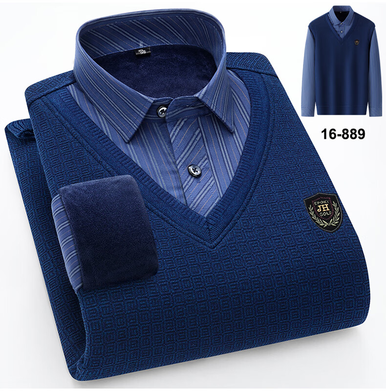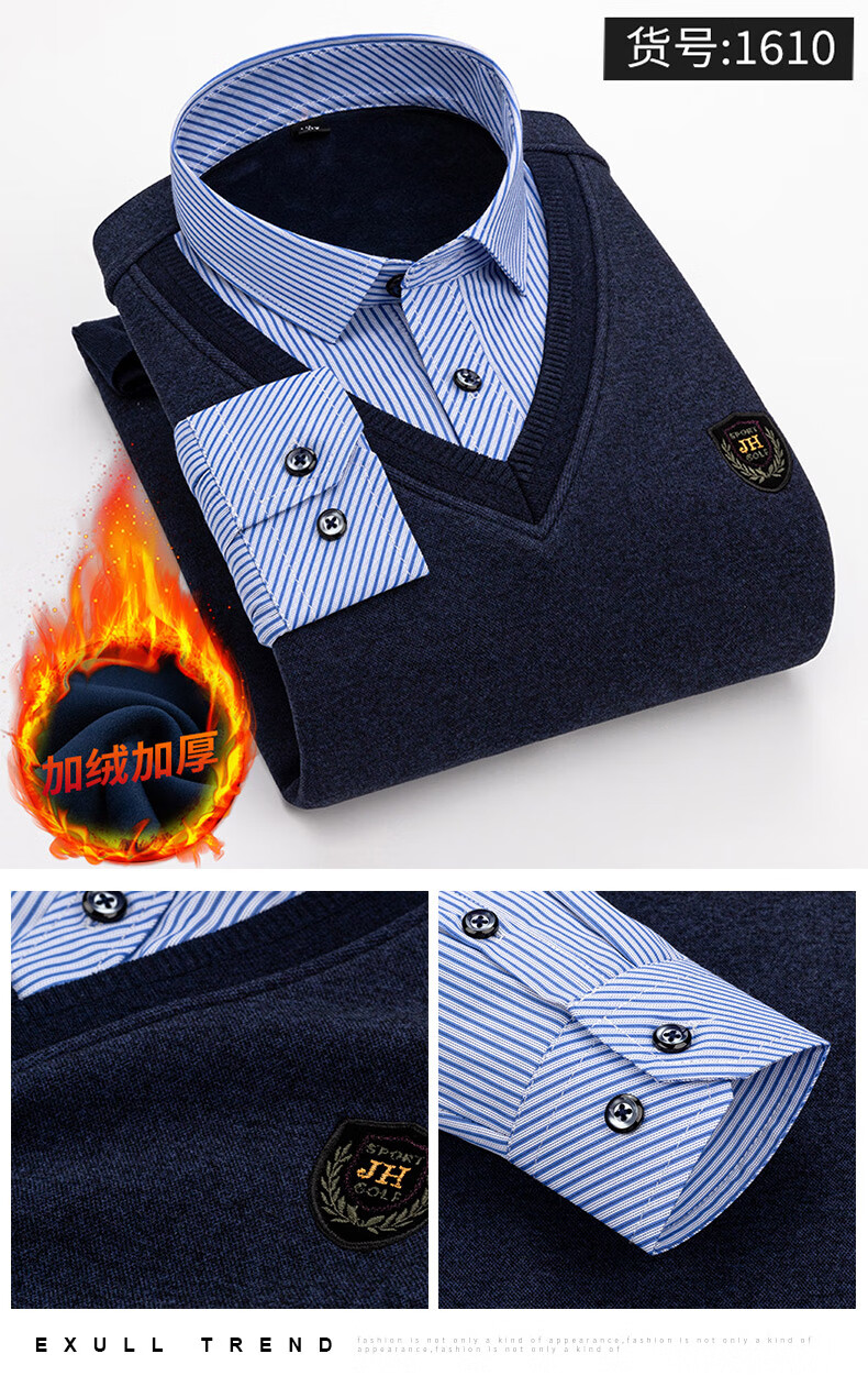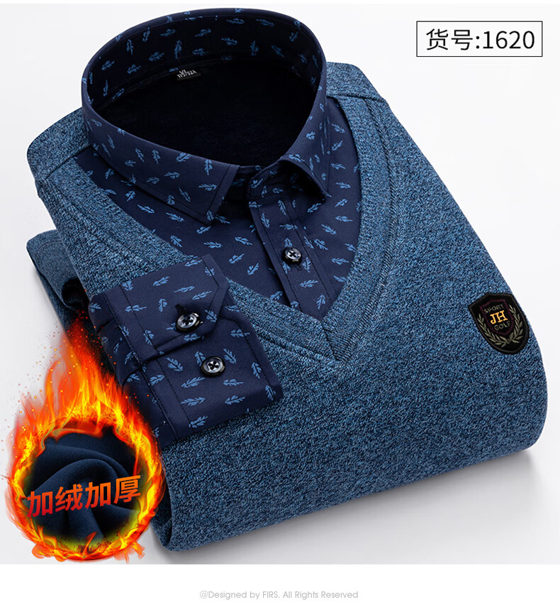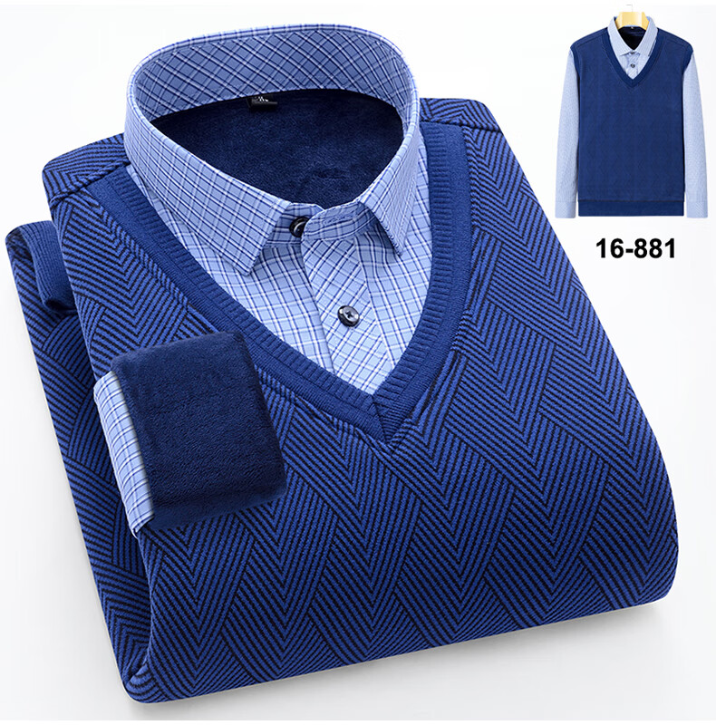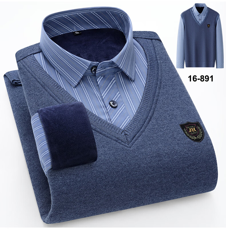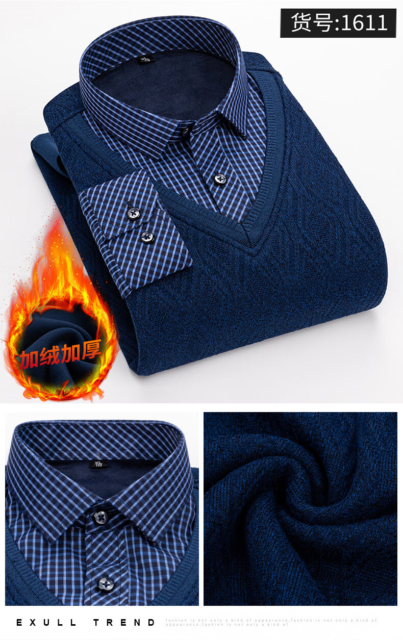 罗蒙(ROMON)冬季男士假两件套保暖衬衫领男长袖加厚加绒中年父亲装针织衫毛衣 灰色 1613 XL 【加绒加厚】