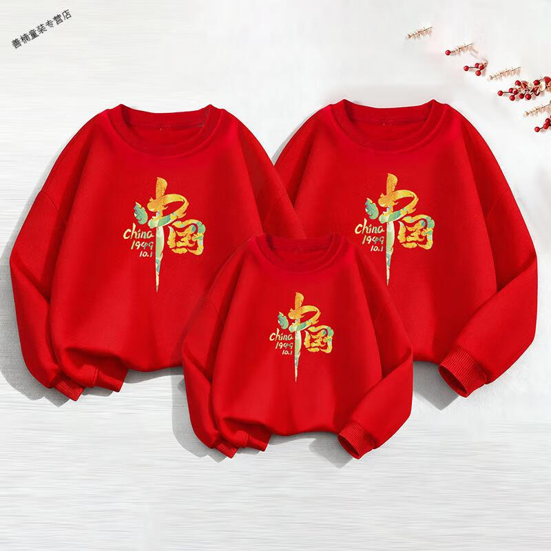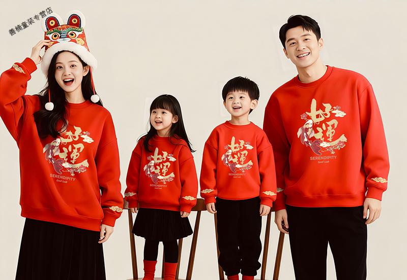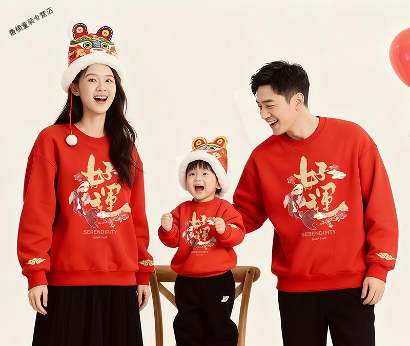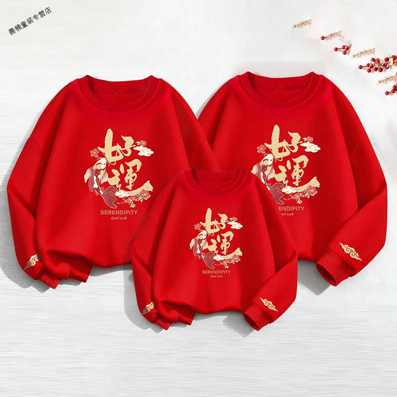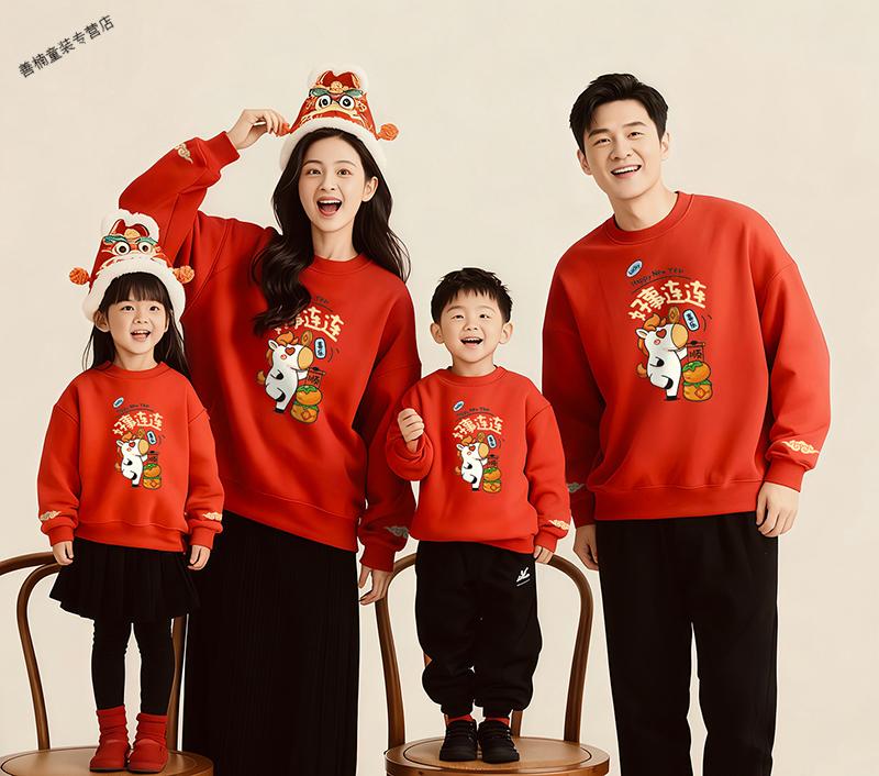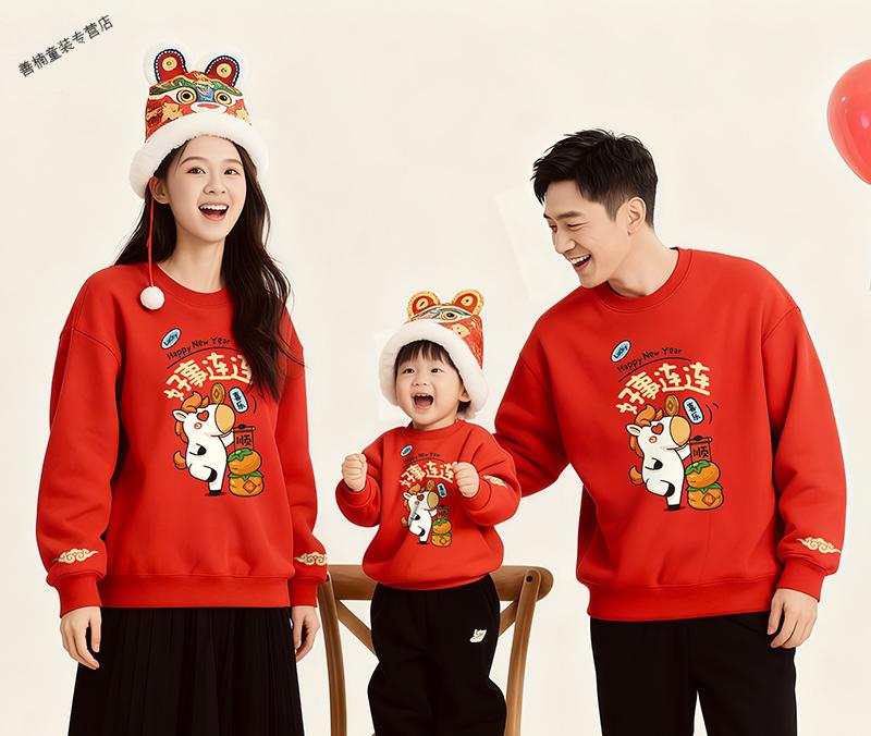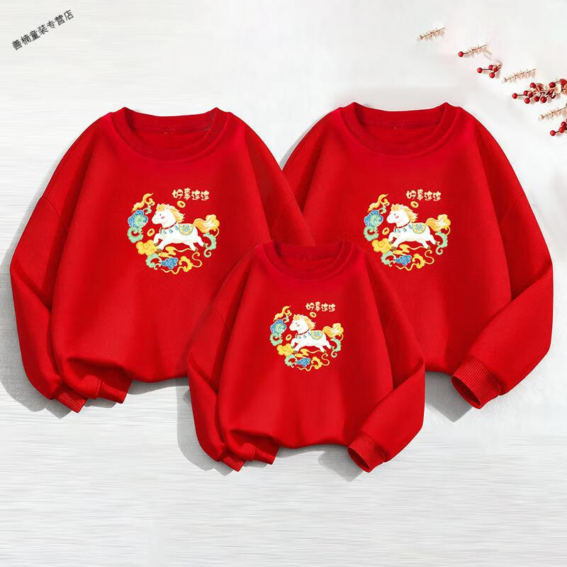 HAL.DUCK red Chinese New Year parent-child clothing, autumn and winter 2026 new style, family of four, three New Year's Day velvet sweatshirts, Year of the Horse New Year's greetings clothes, red without velvet (good luck horse) 90 sweatshirt