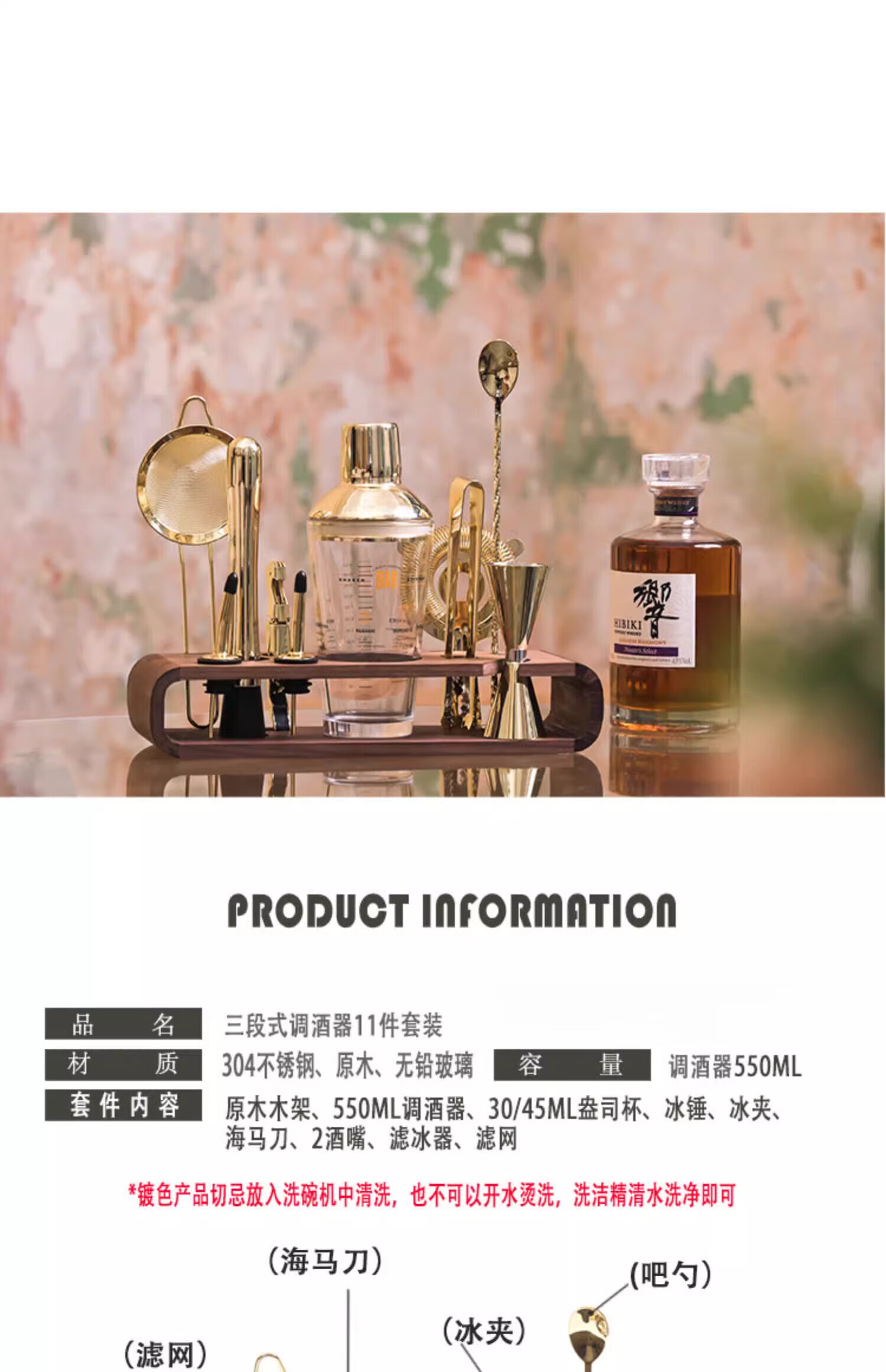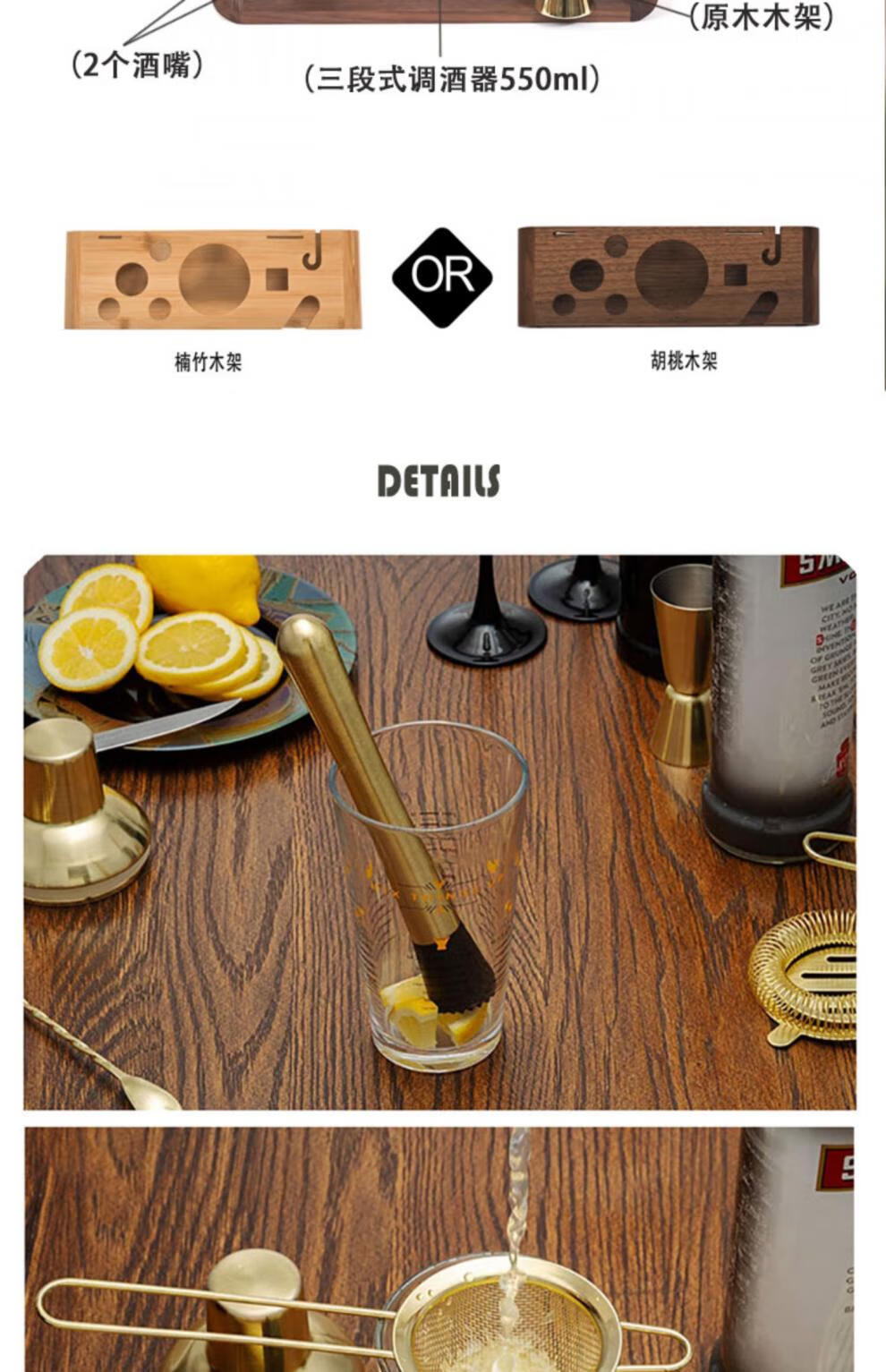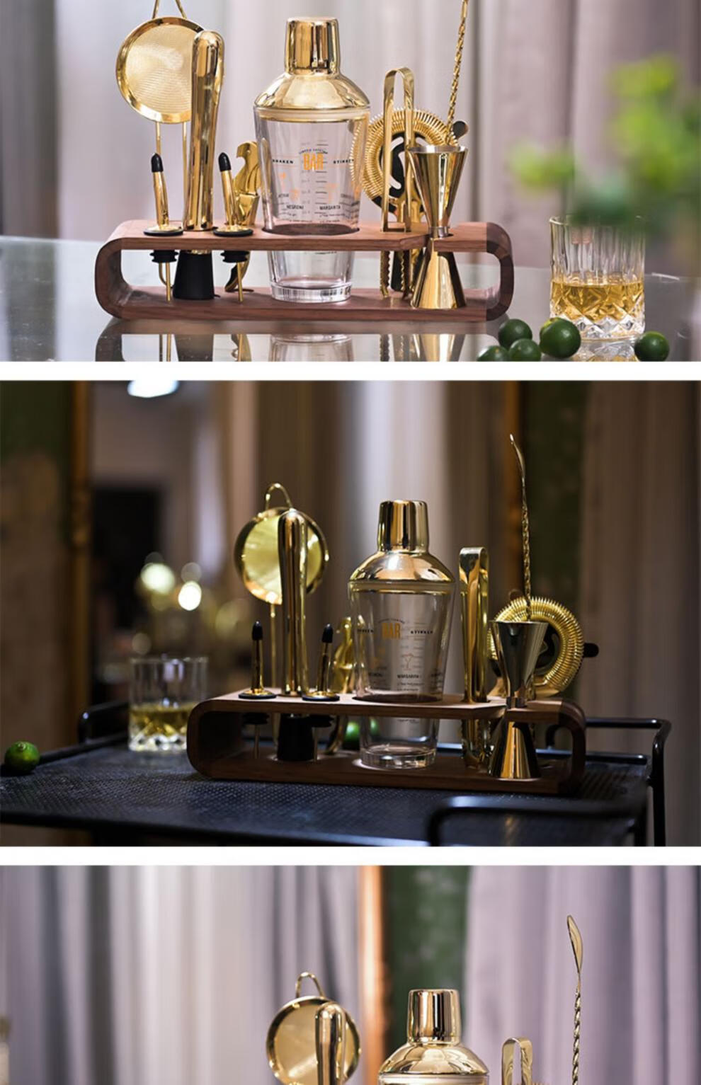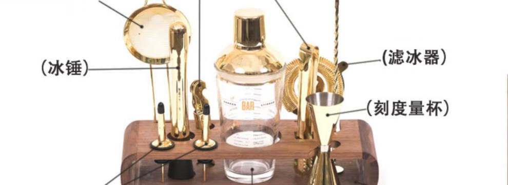 CLCEY cocktail shaker set gold 304 stainless steel glass scale gift box drink mixing tool shaker cup segmented glass set (bamboo and peach wood frame)