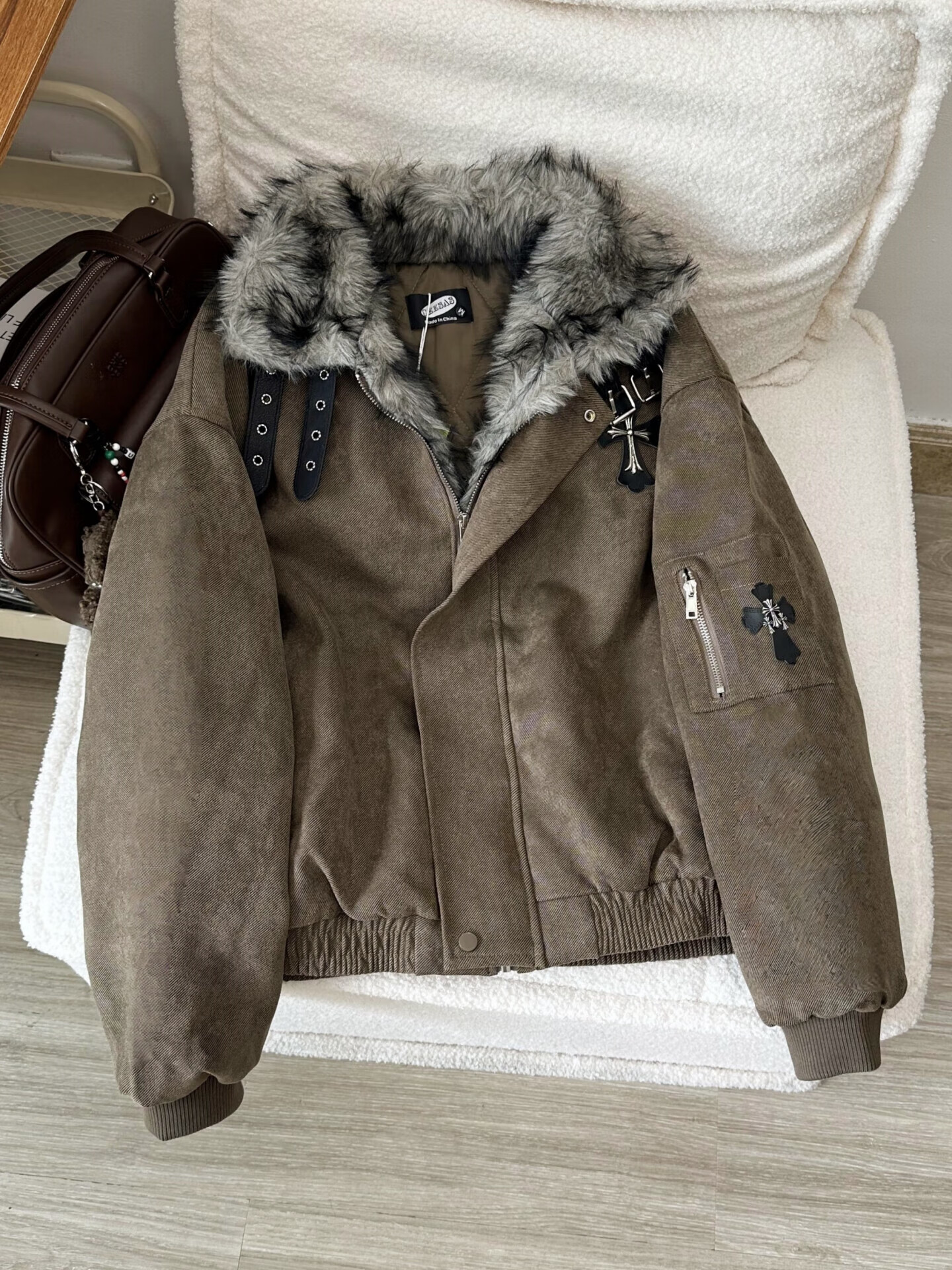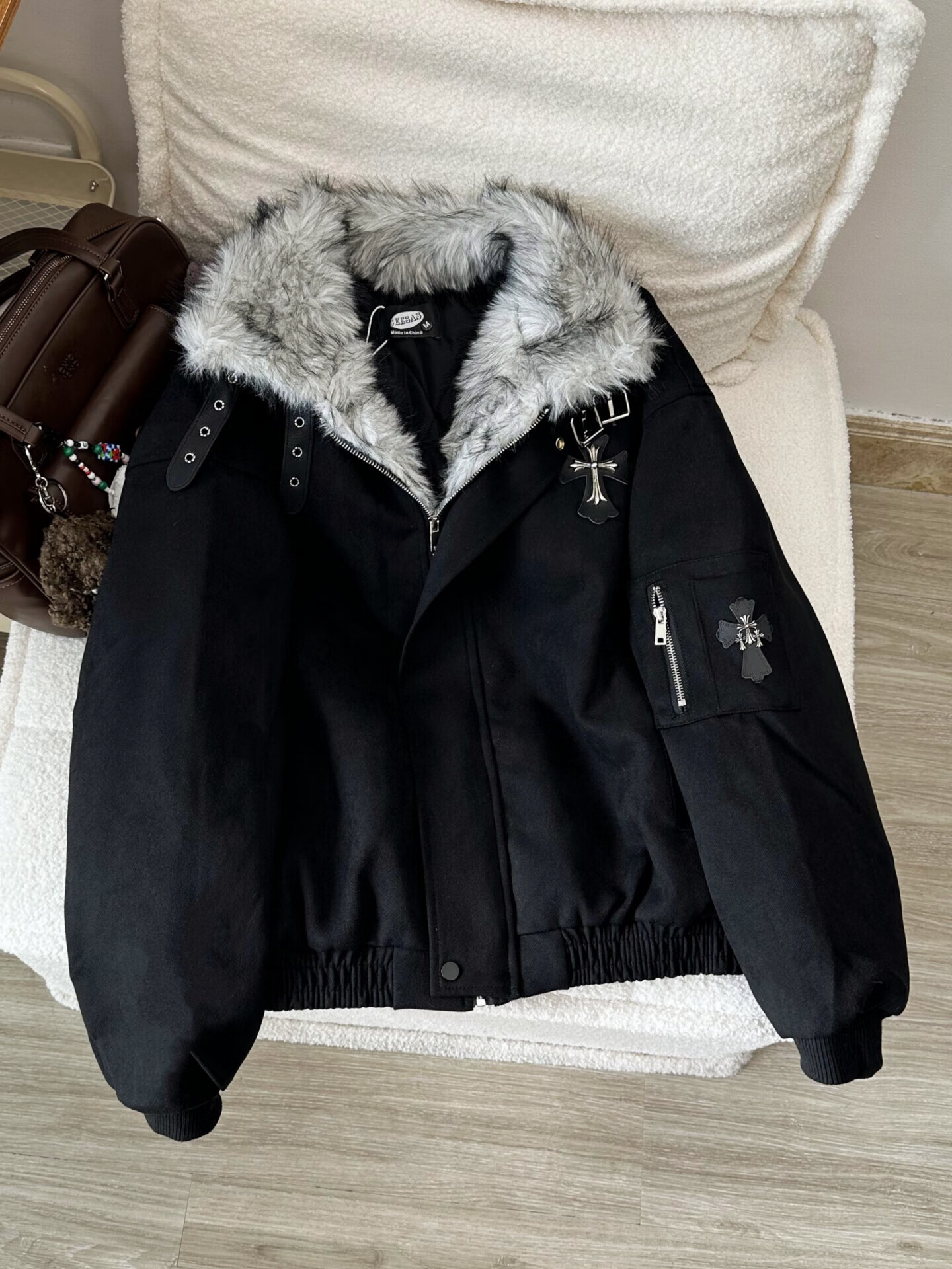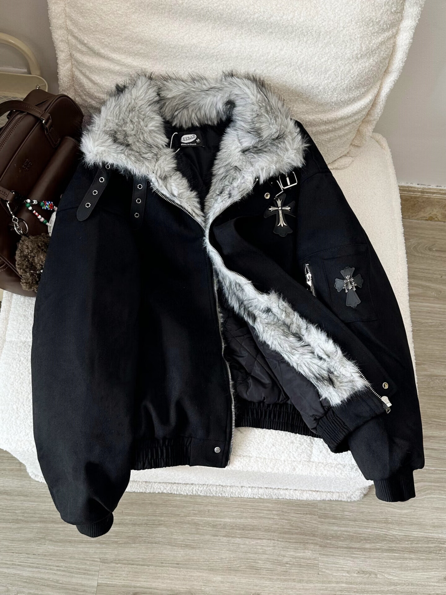 Shelley Jones Black American Retro Cross Mountain Carving Jacket Cotton Jacket Men's Winter Thickened Warm Fur Collar Cotton Jacket Black XL Recommended 120-140Jin Jin is equal to 0.5 kg