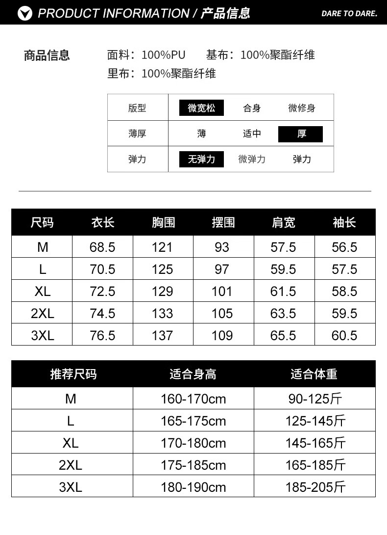 China (cm) 165 / 88-90 170 / 96-98 175 / 108-110 180 / 118-122 185 / 126-130