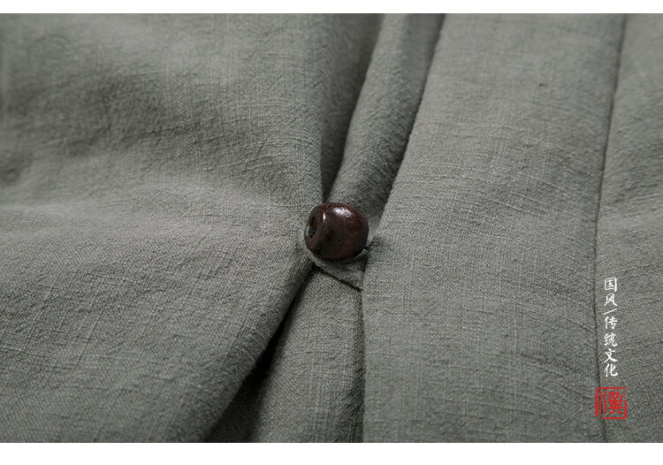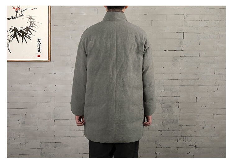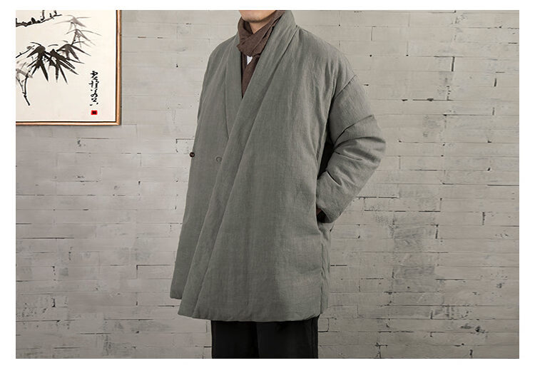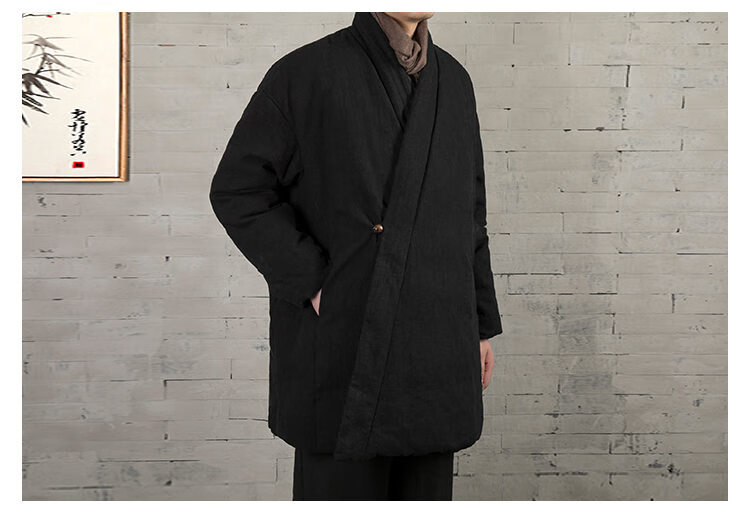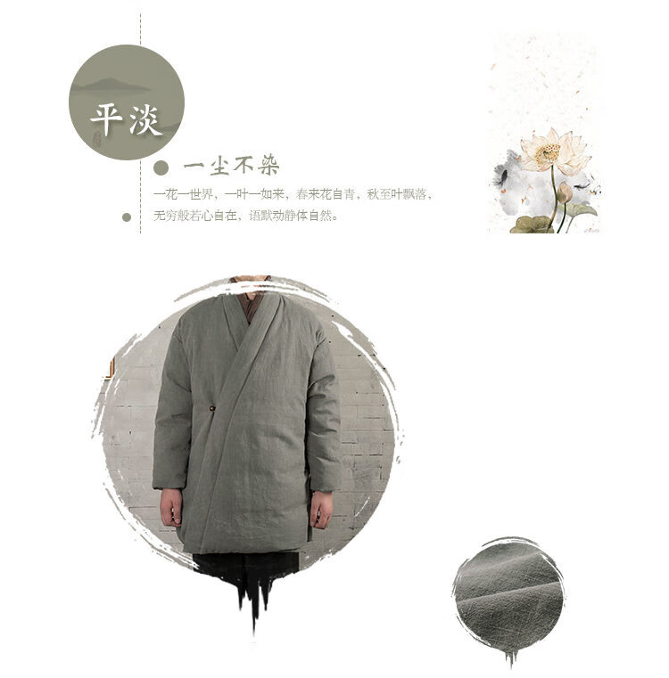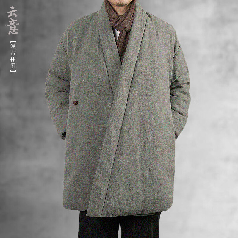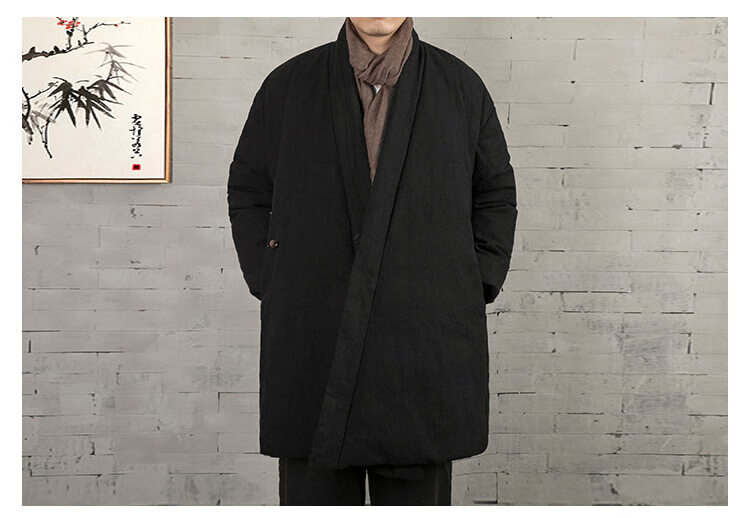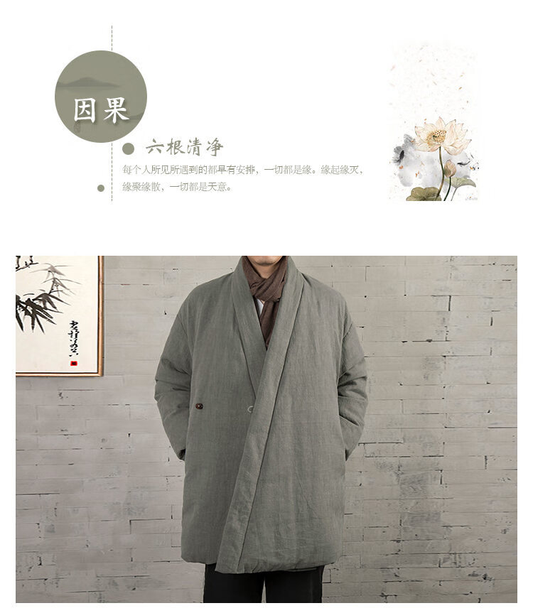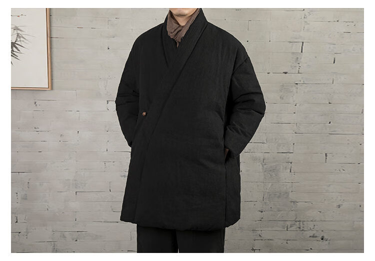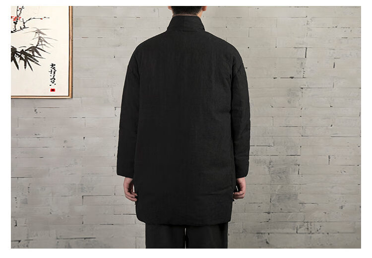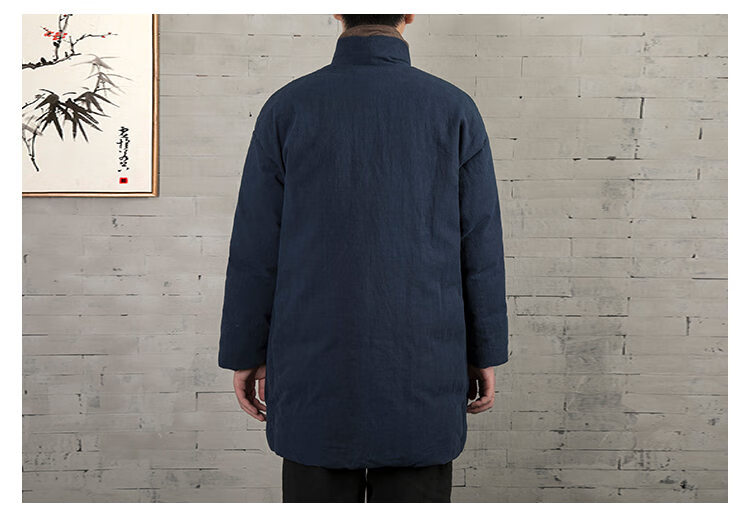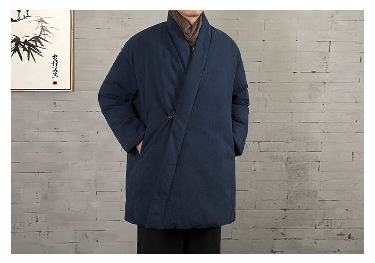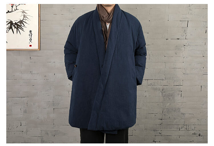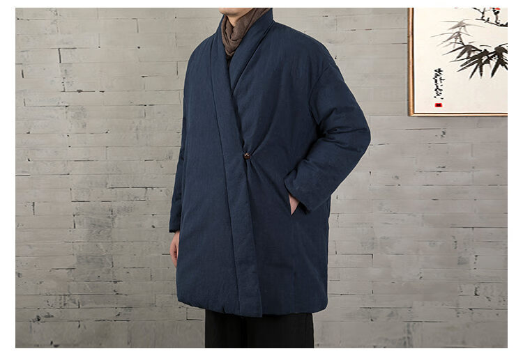 ROMON winter thickened oblique-breasted Hanfu men's Chinese-style cotton and linen cotton clothes Tang suit mid-length Zen monk's clothes cotton-padded jacket Taoist robe Navy L