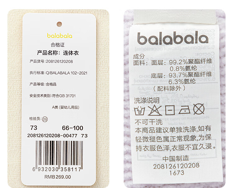 BALABALA balaOne BALABALA children's clothing baby outing jumpsuit 2025 new spring clothing plus velvet warm and cute purple tone 00477 66cm