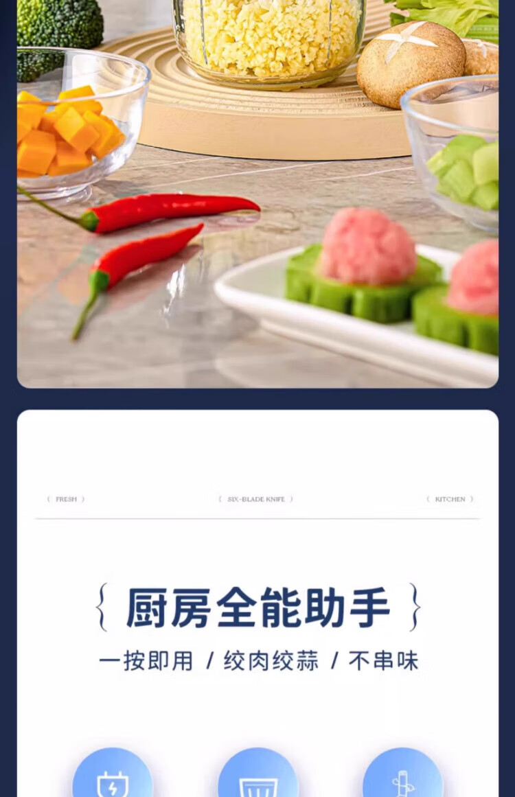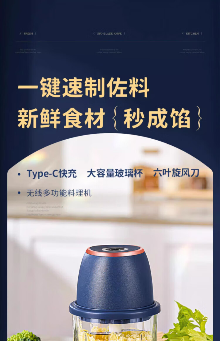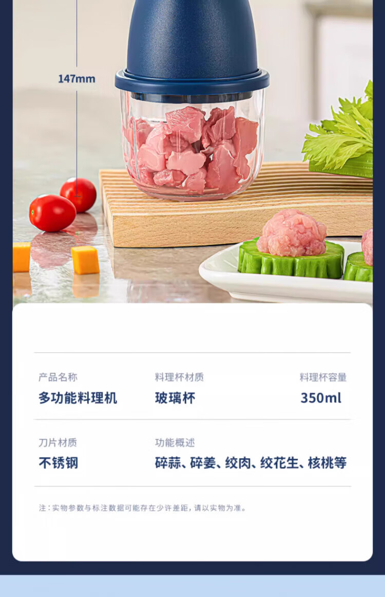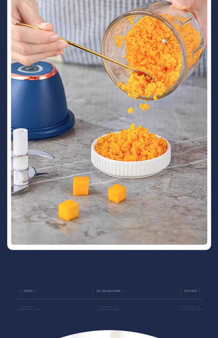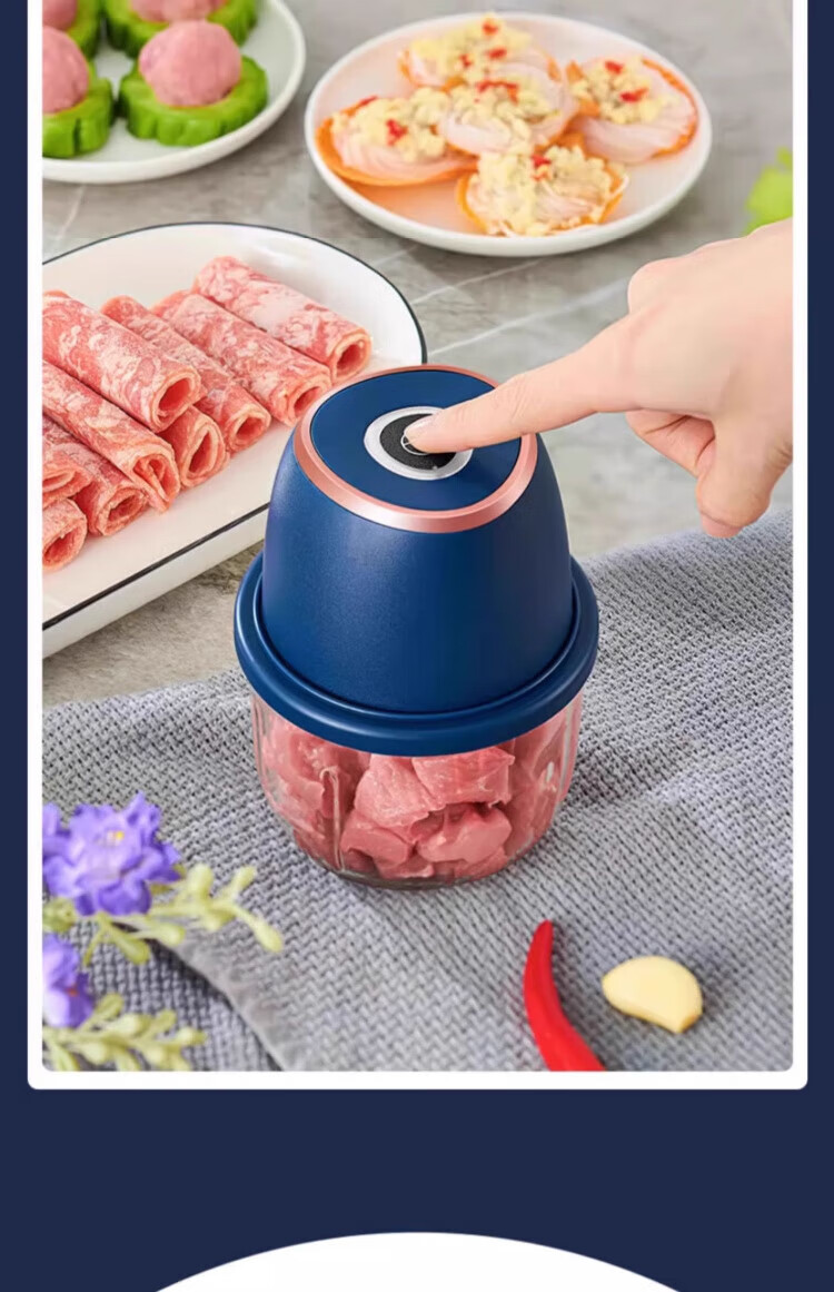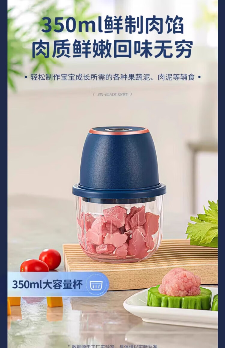 German meat grinder household electric small automatic multi-function stuffing minced meat grinding food supplement machine cooking mixer glass 350ML dark blue six-blade knife minced meat + Type-C charging model