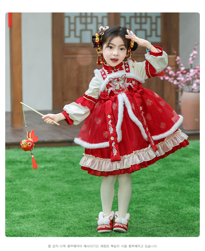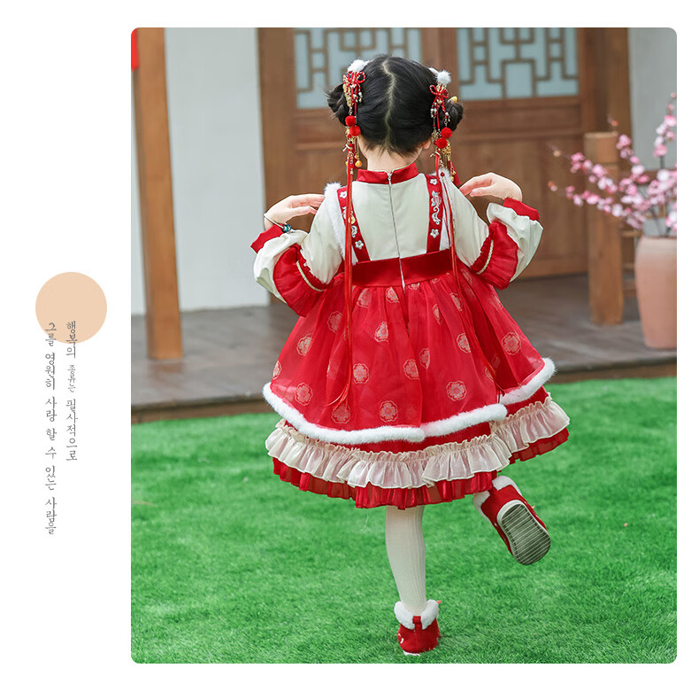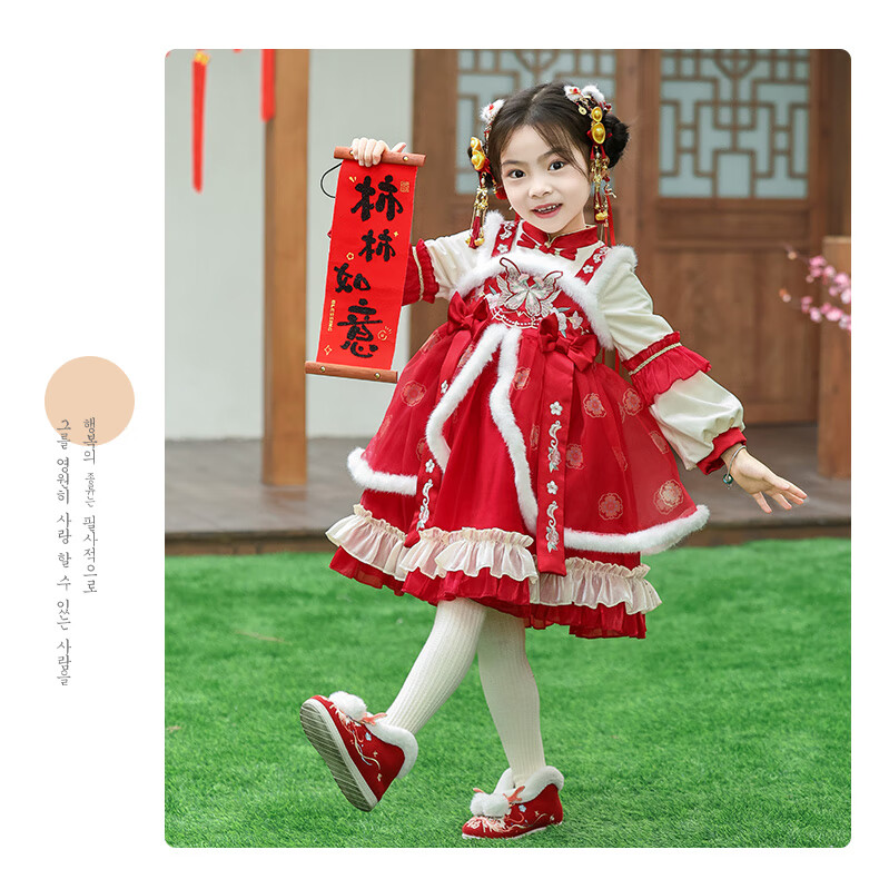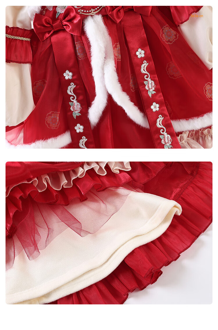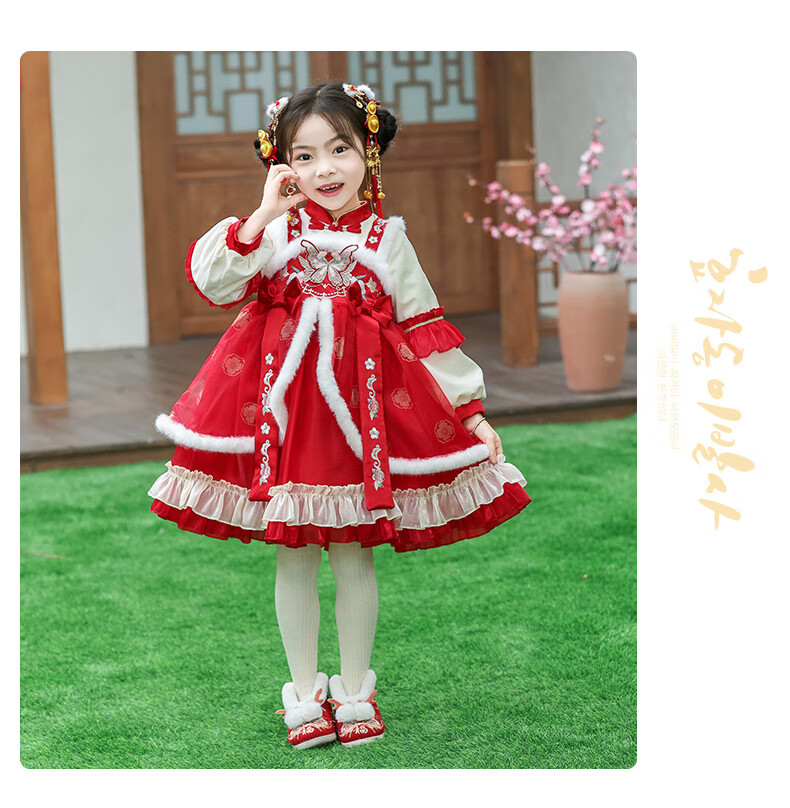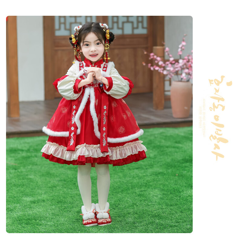 G.duck brand children's clothing Lolita princess dress girls winter thickened warm dress children's velvet Hanfu New Year's dress red 110 cm