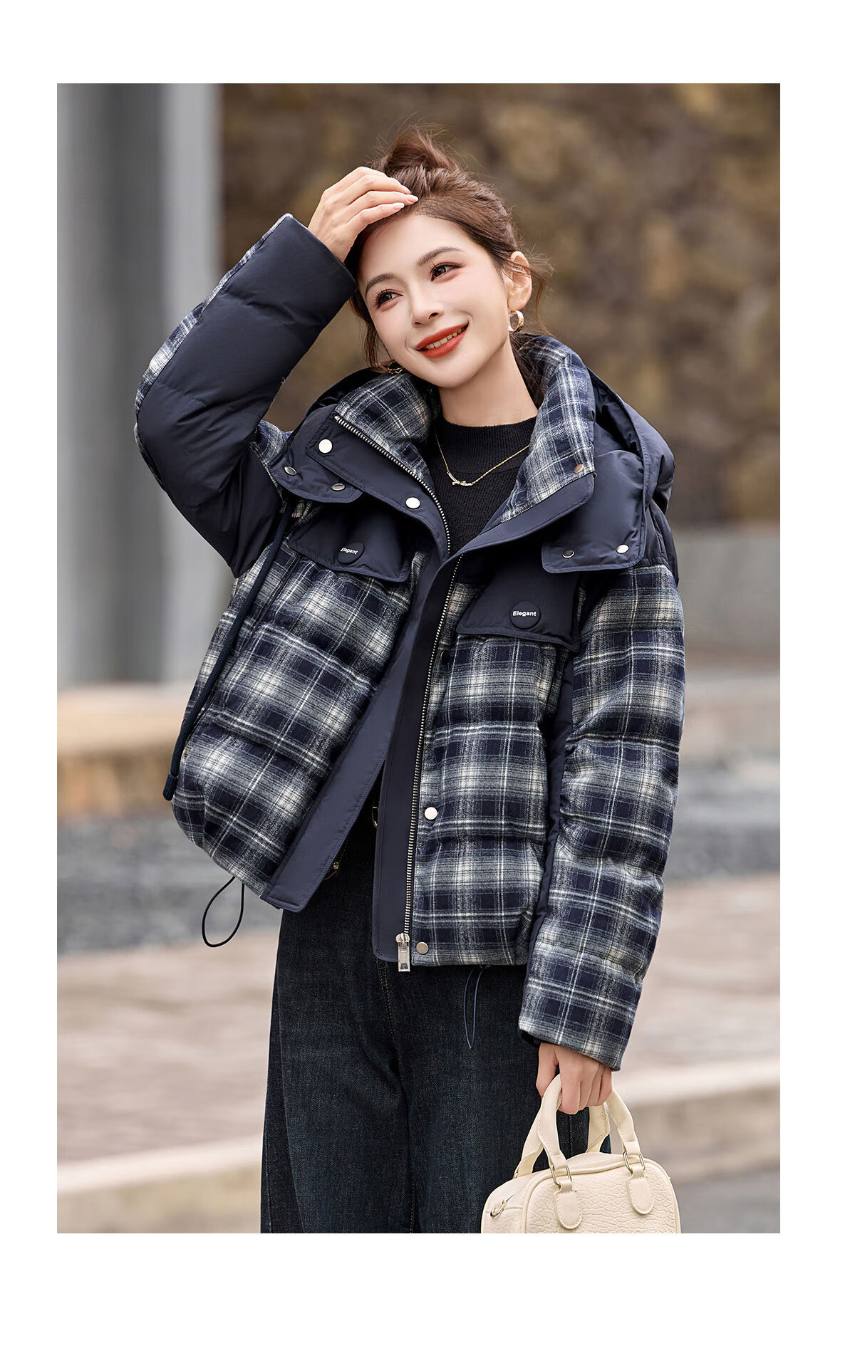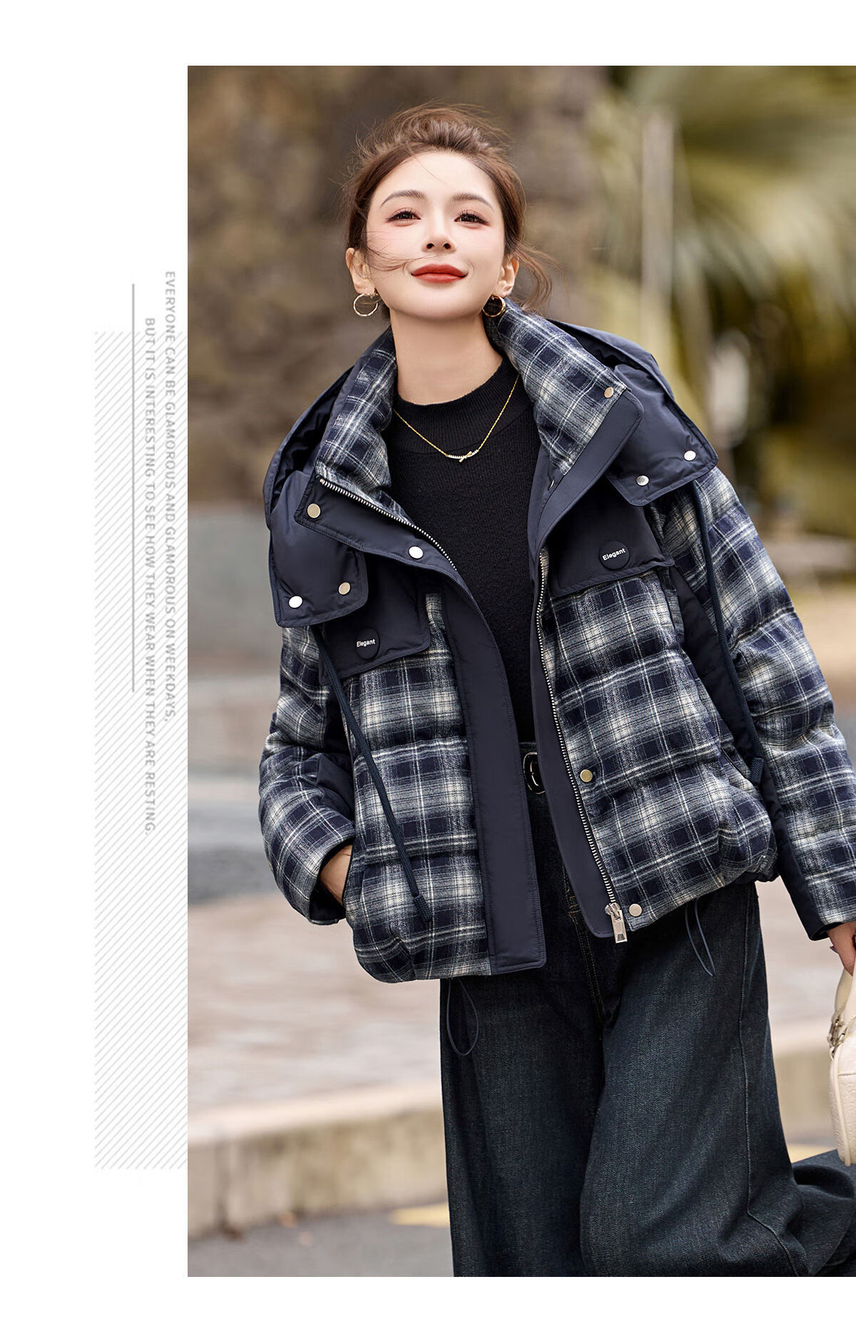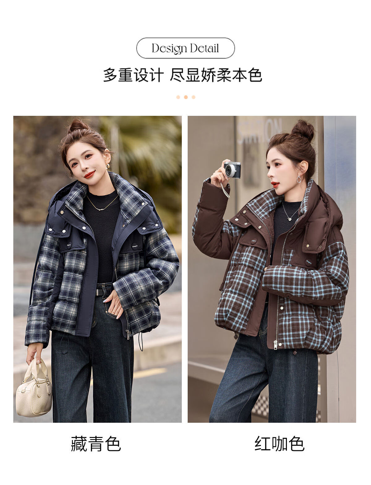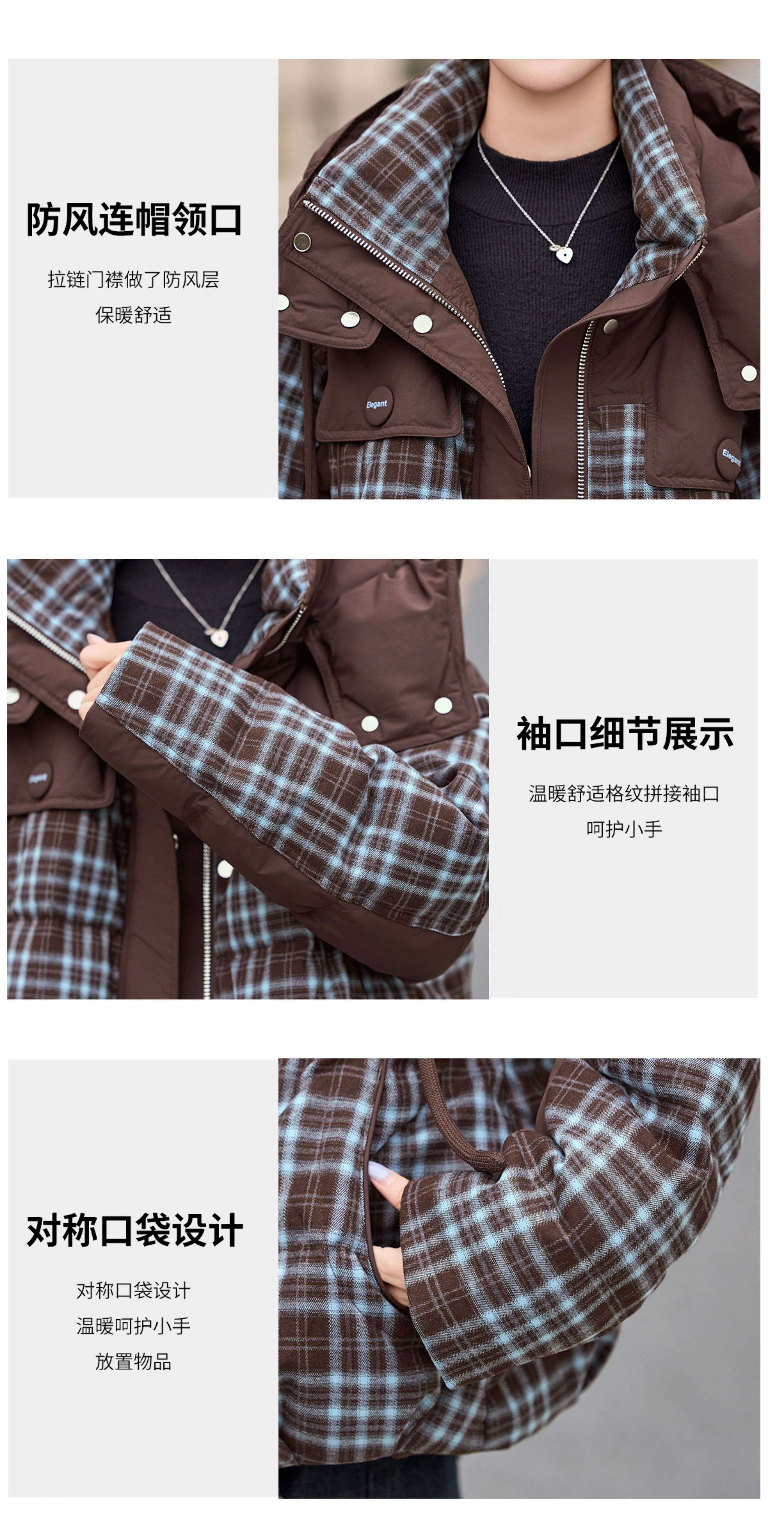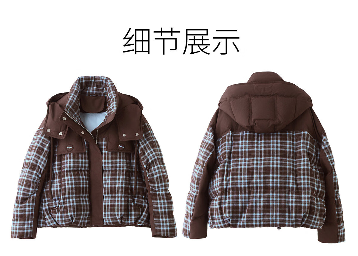 LISM shopping mall same style high-end down jacket design contrasting plaid down jacket women Korean version hooded short bread navy XL recommended 135-145Jin Jin equals 0.5 kg b