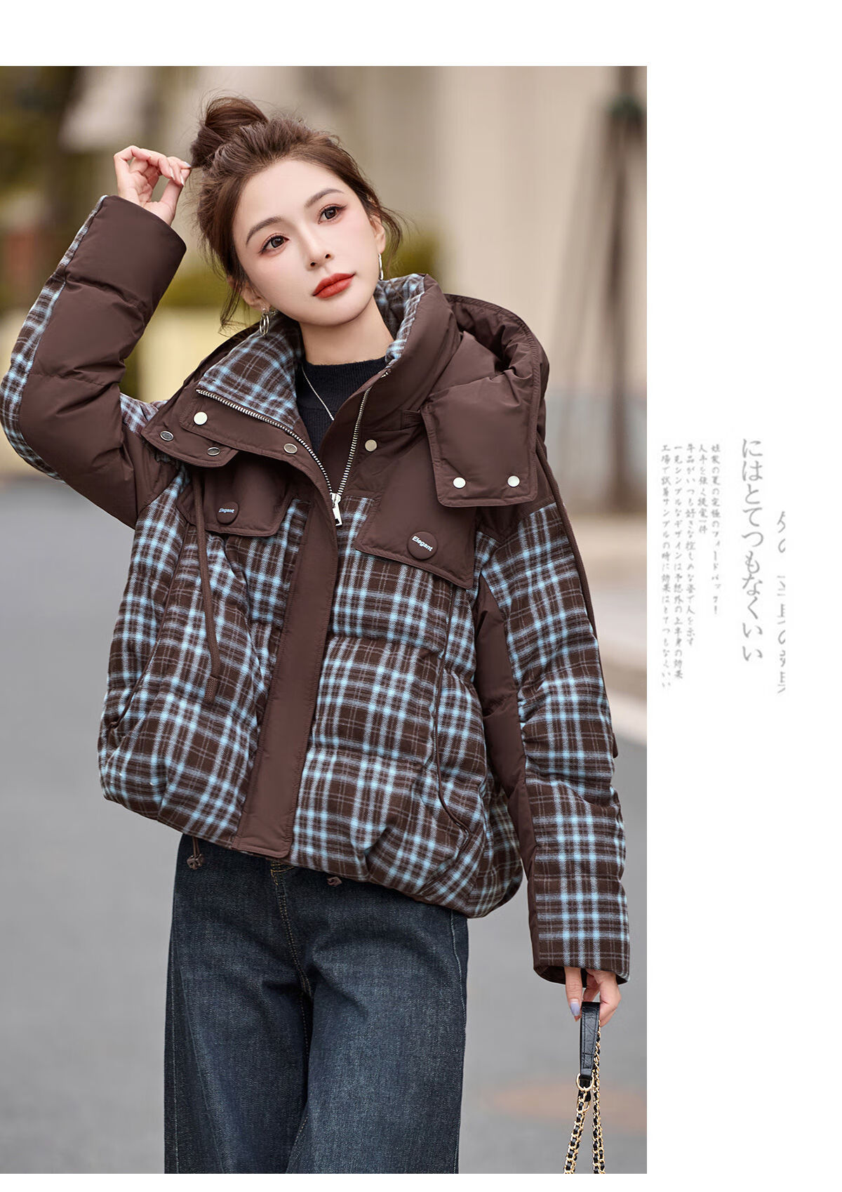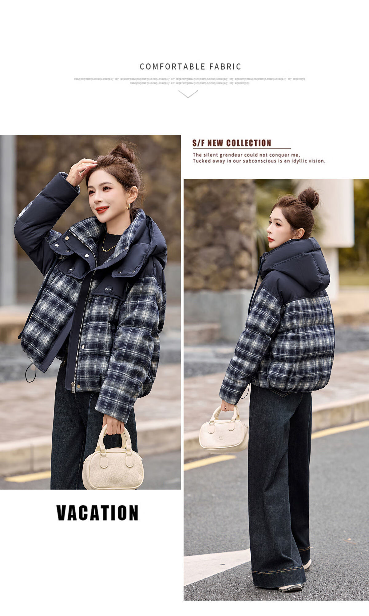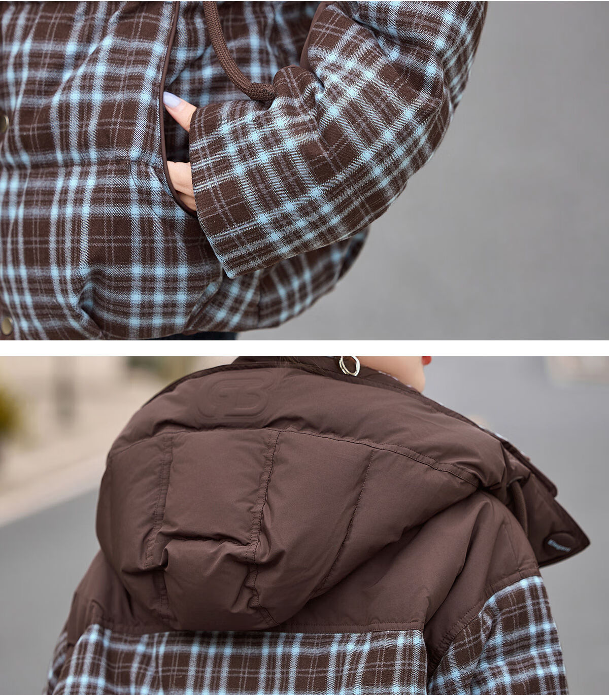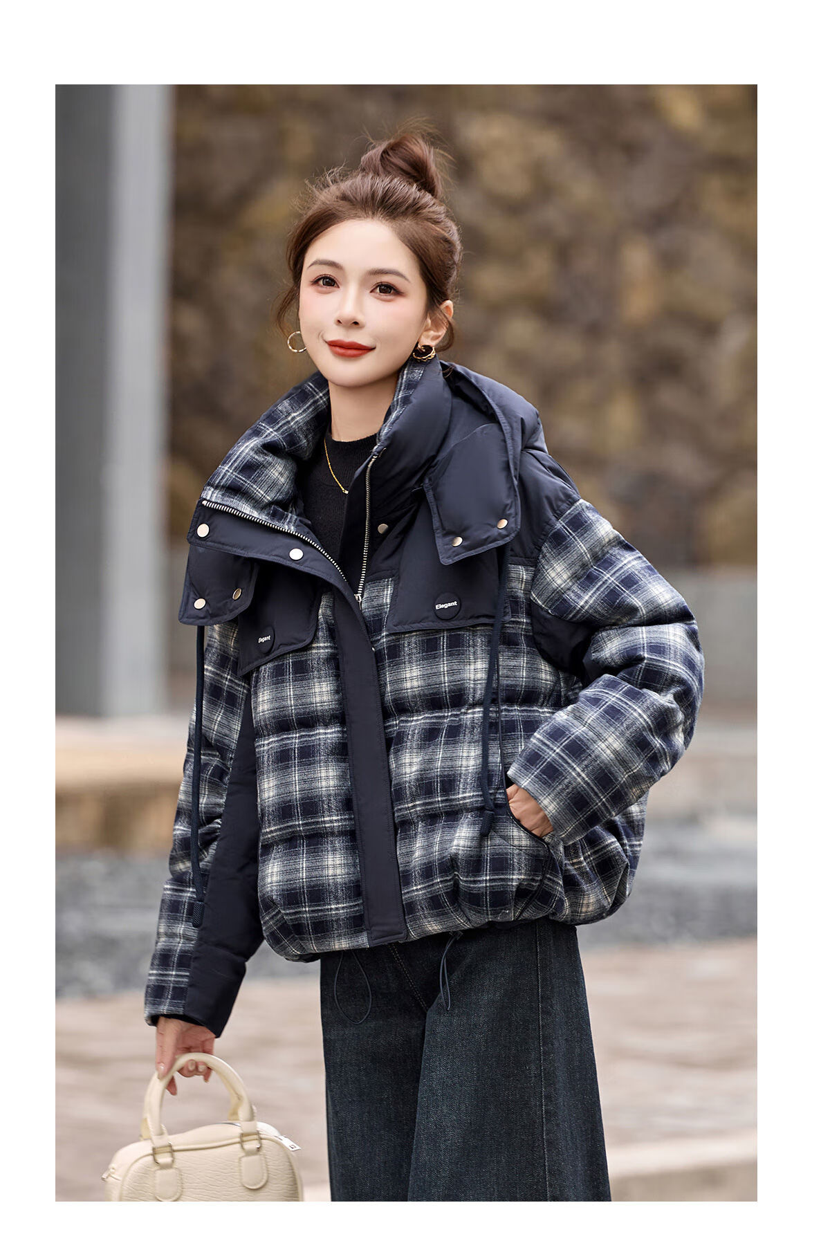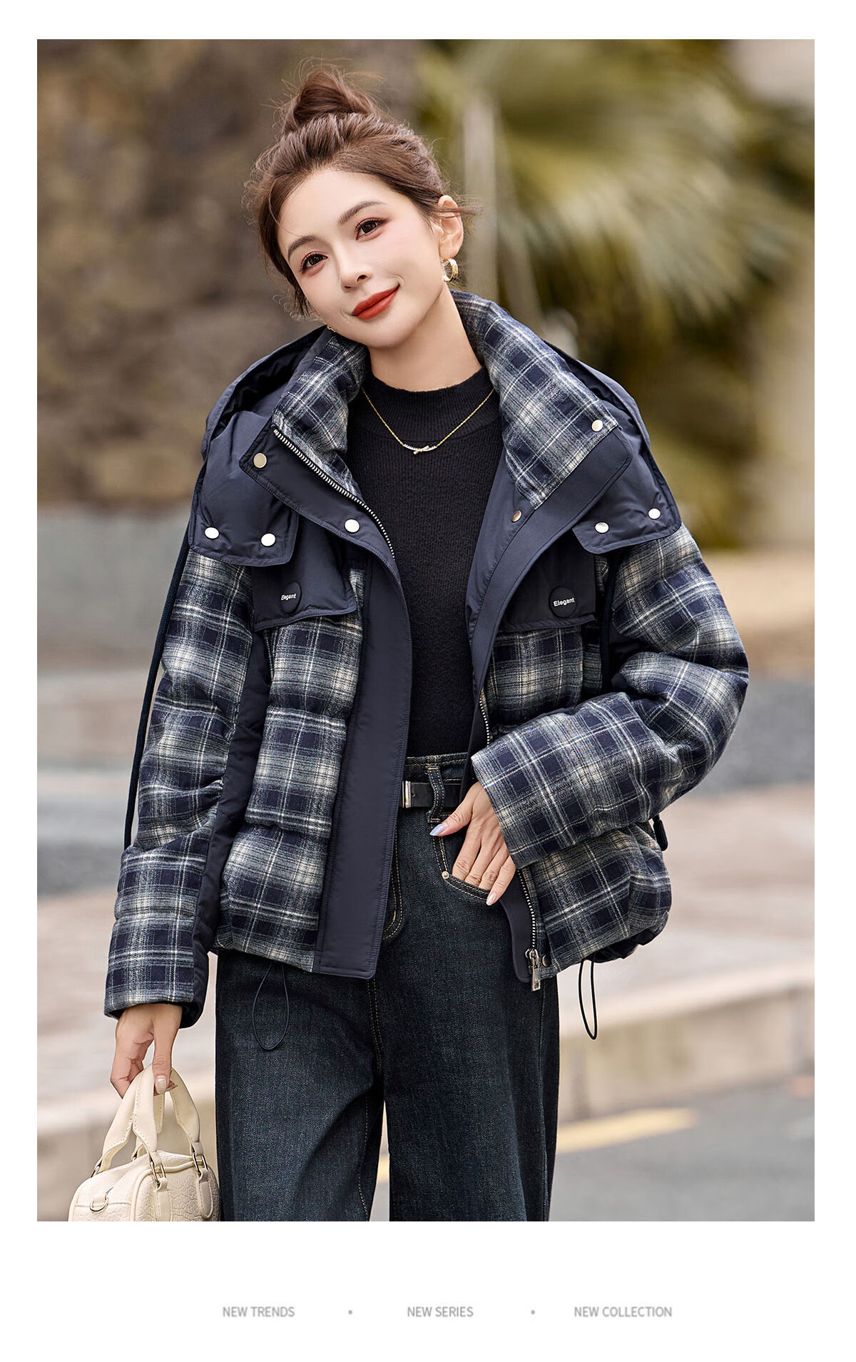 LISM shopping mall same style high-end down jacket design contrasting plaid down jacket women Korean version hooded short bread navy XL recommended 135-145Jin Jin equals 0.5 kg b