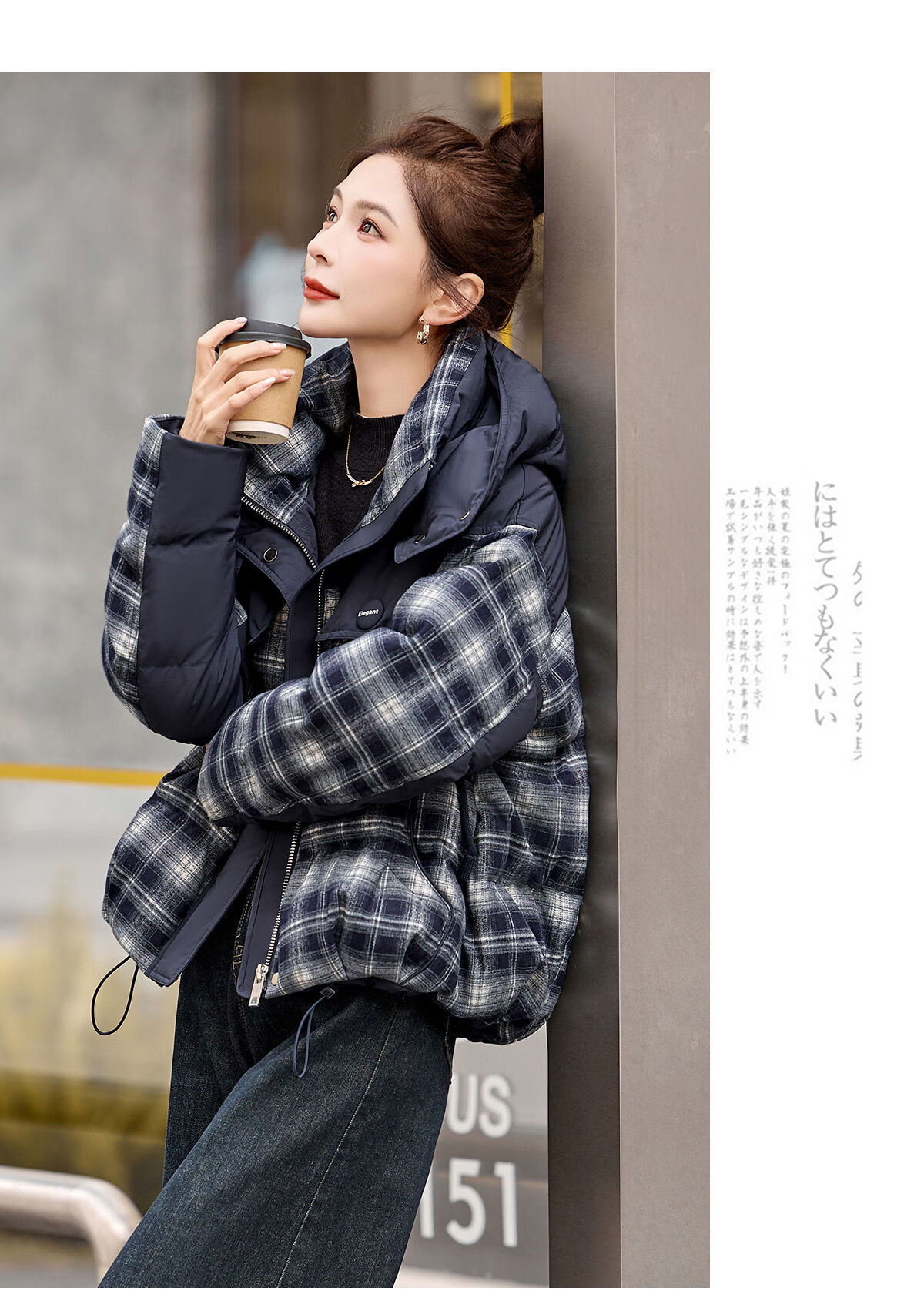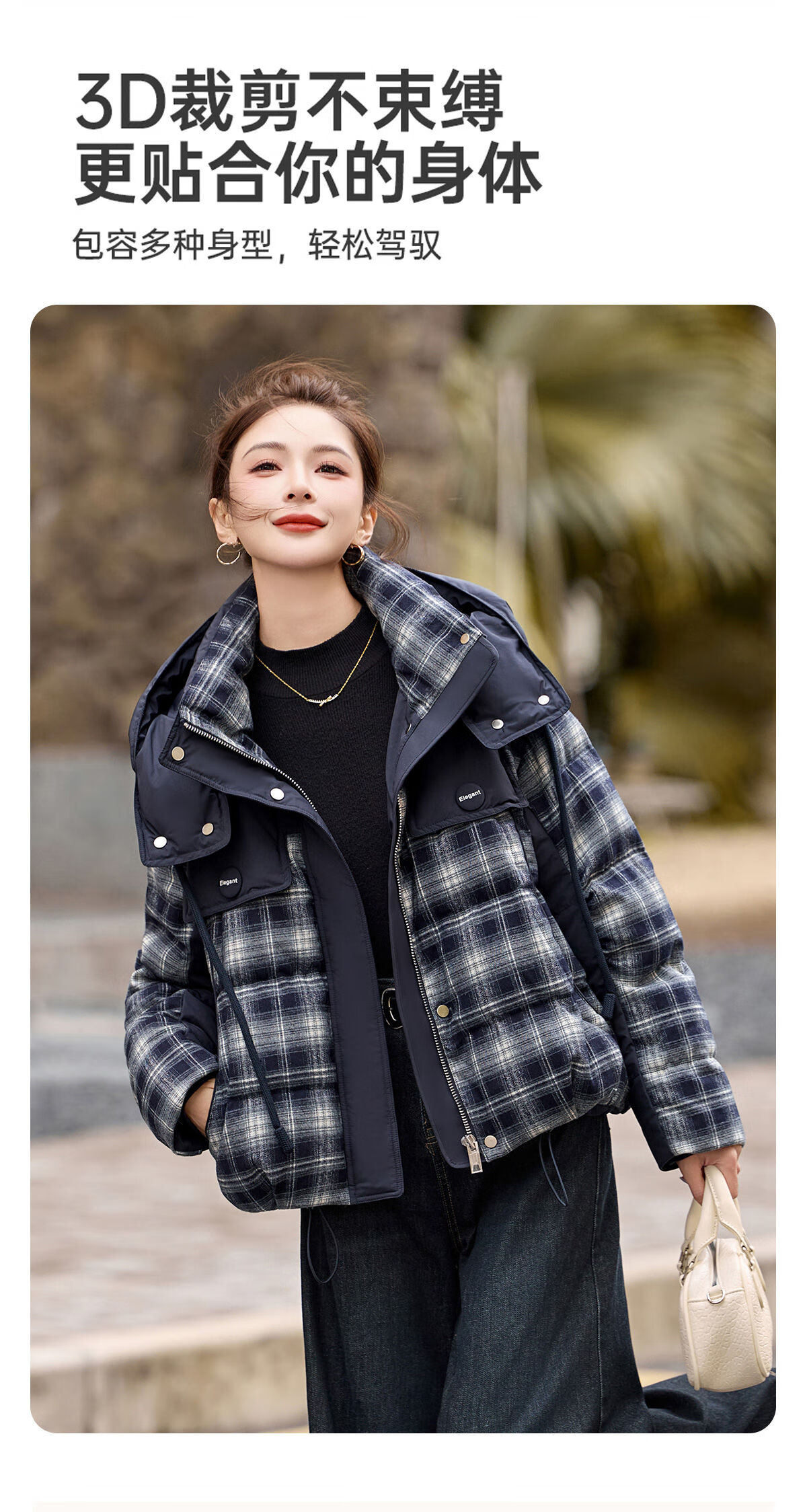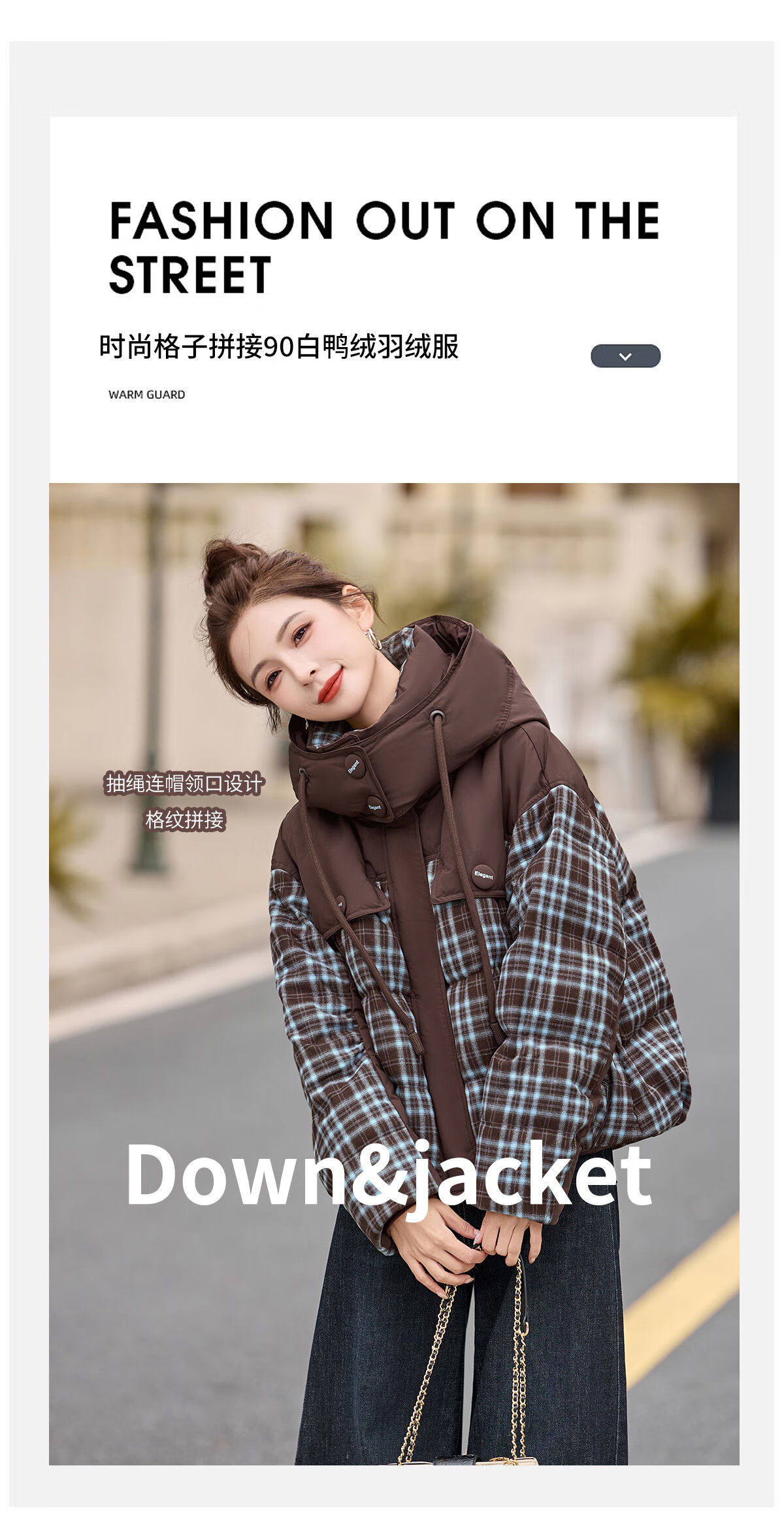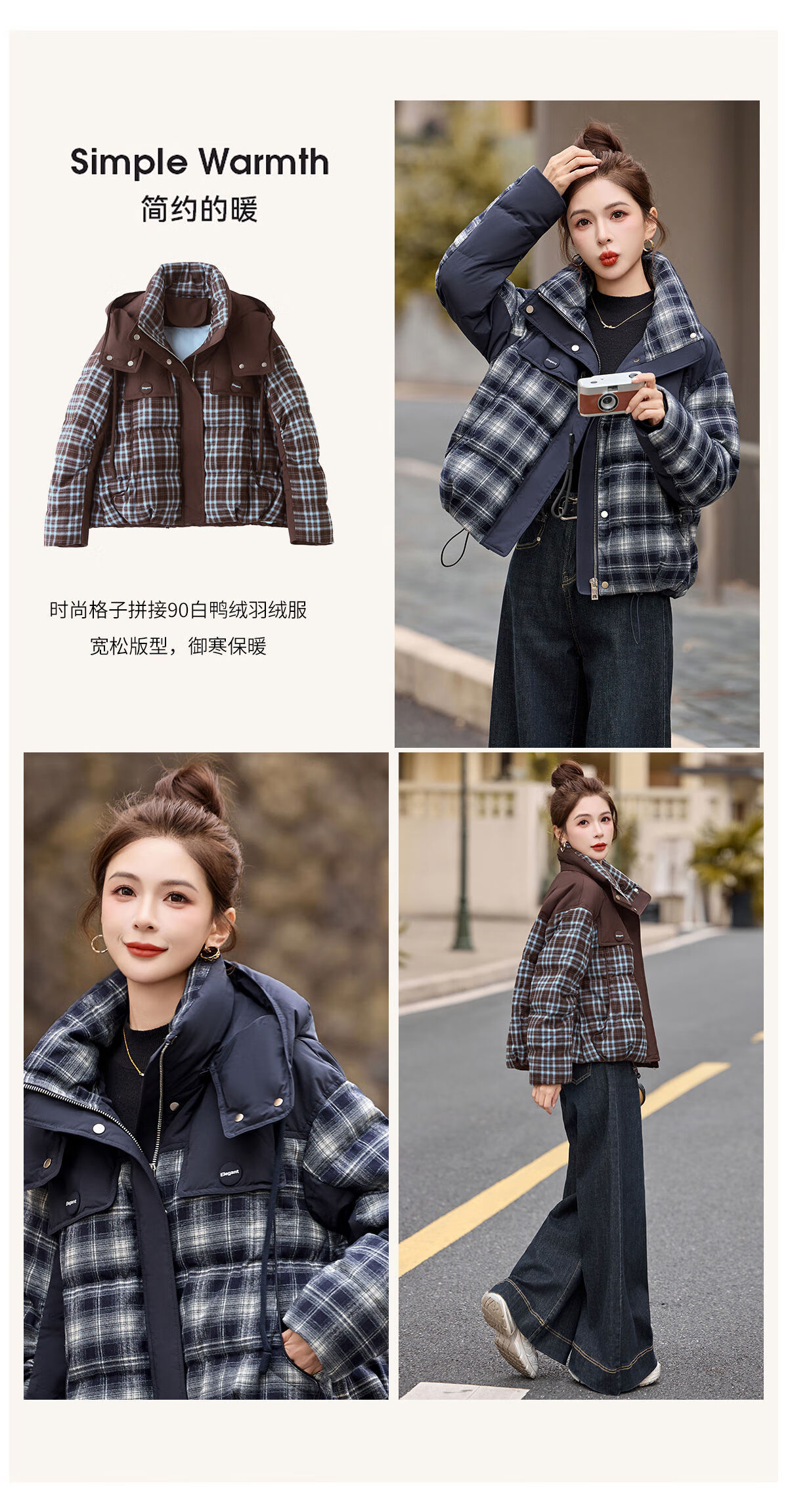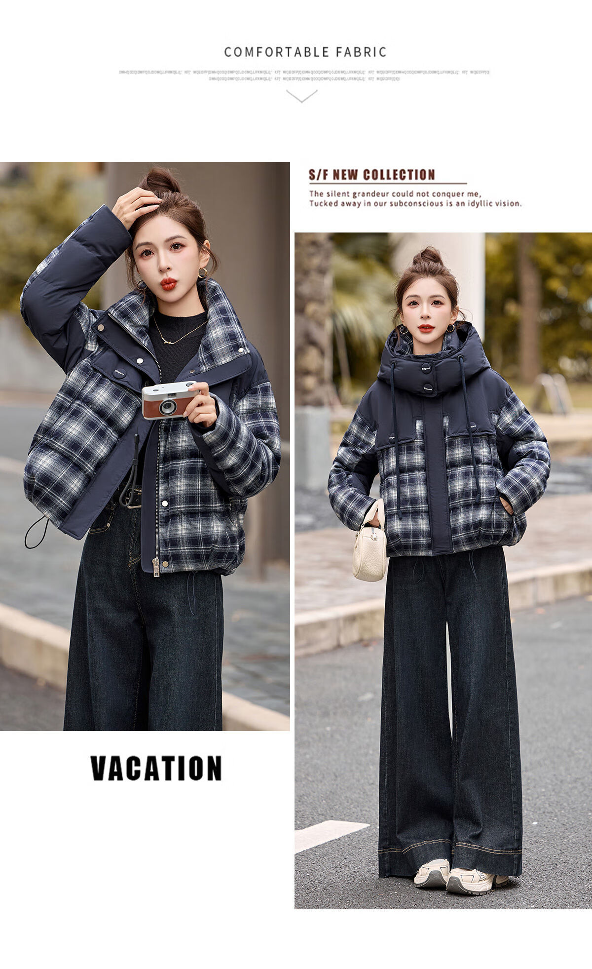 LISM shopping mall same style high-end down jacket design contrasting plaid down jacket women Korean version hooded short bread navy XL recommended 135-145Jin Jin equals 0.5 kg b