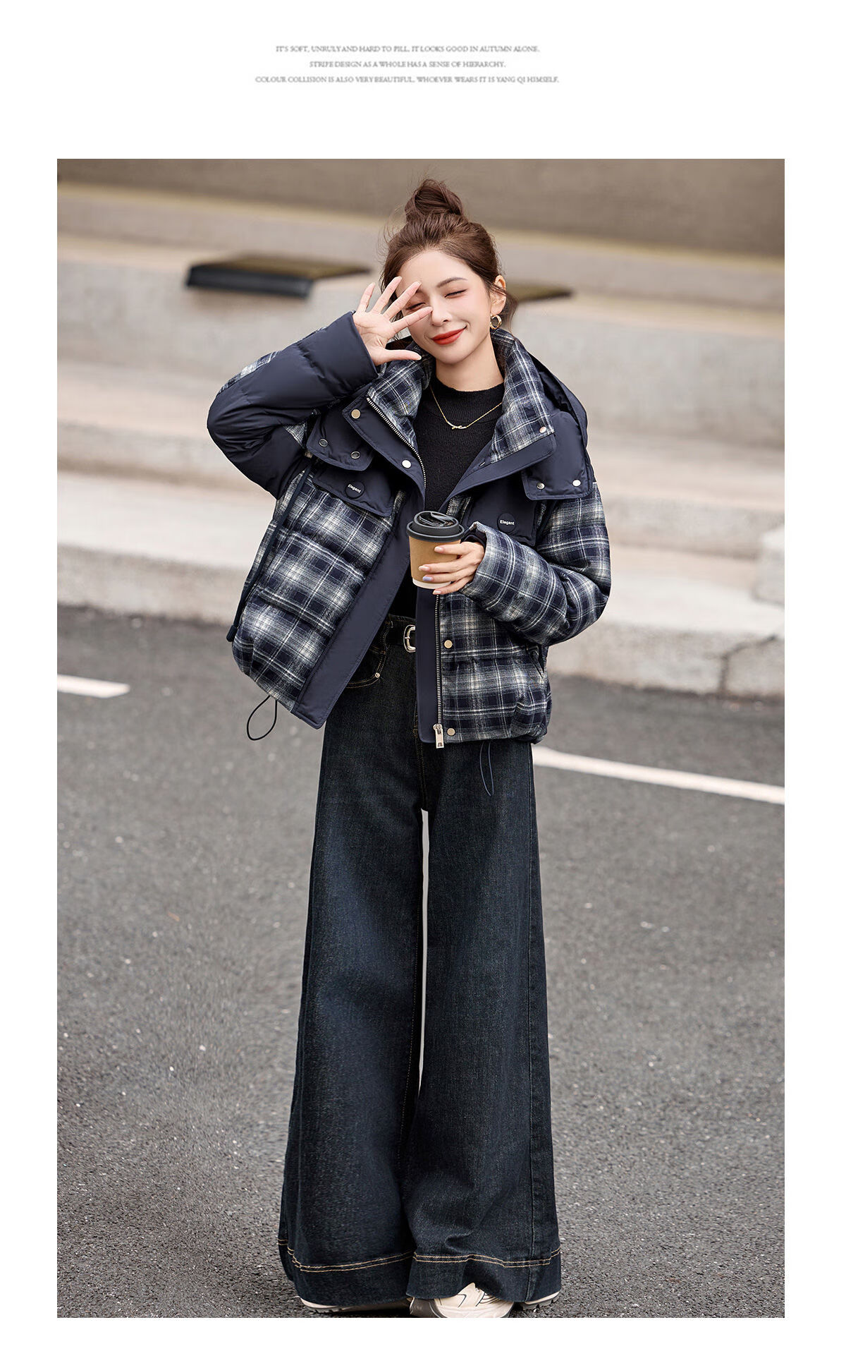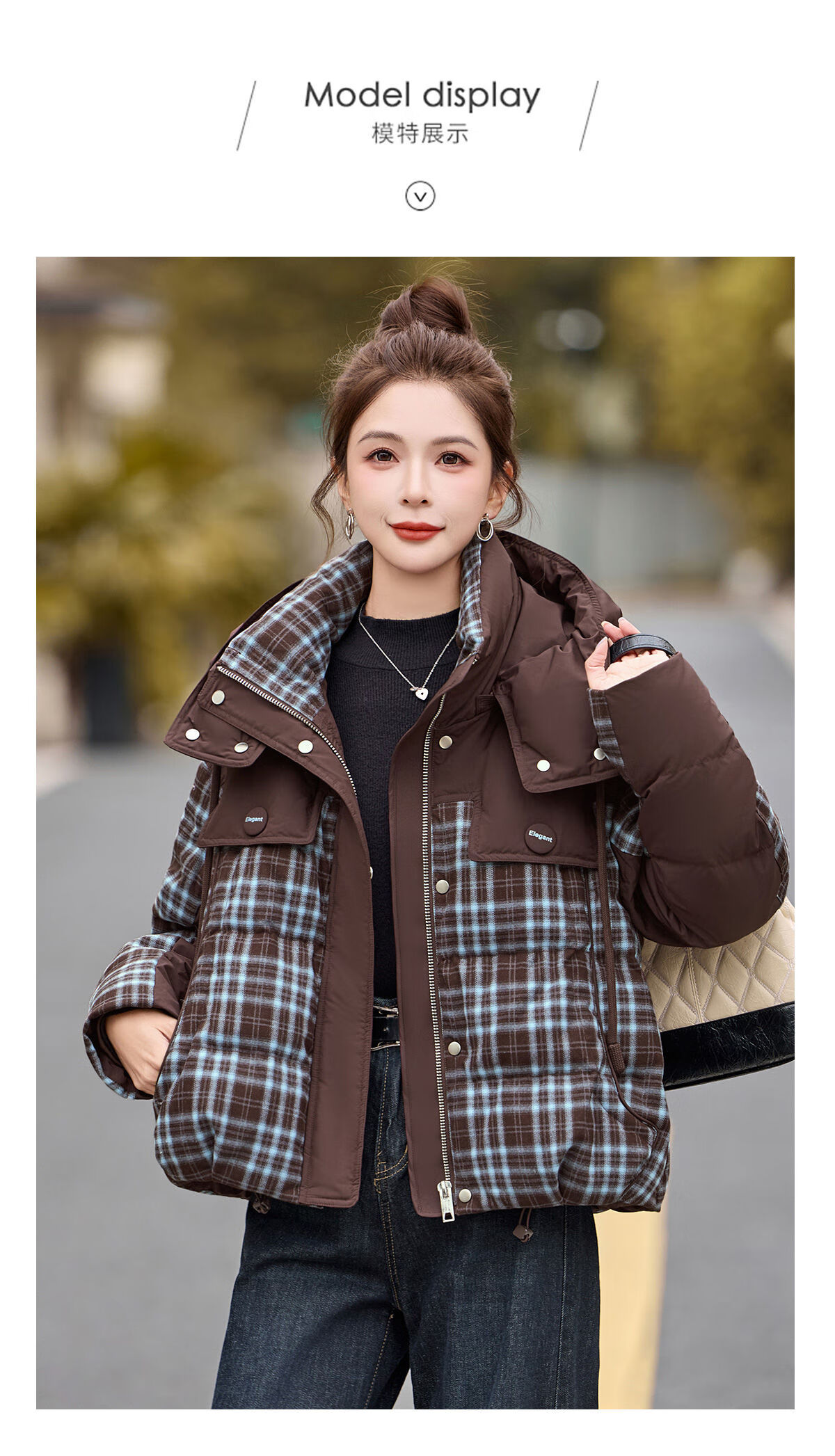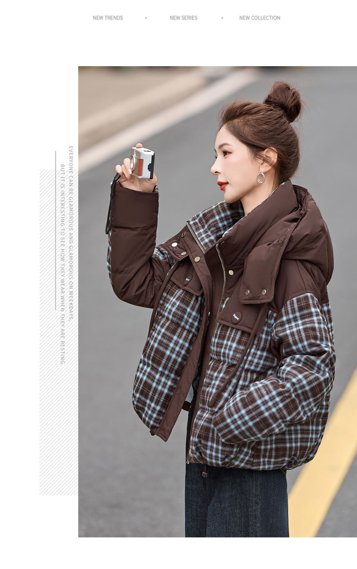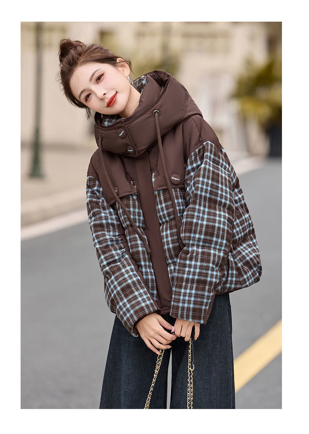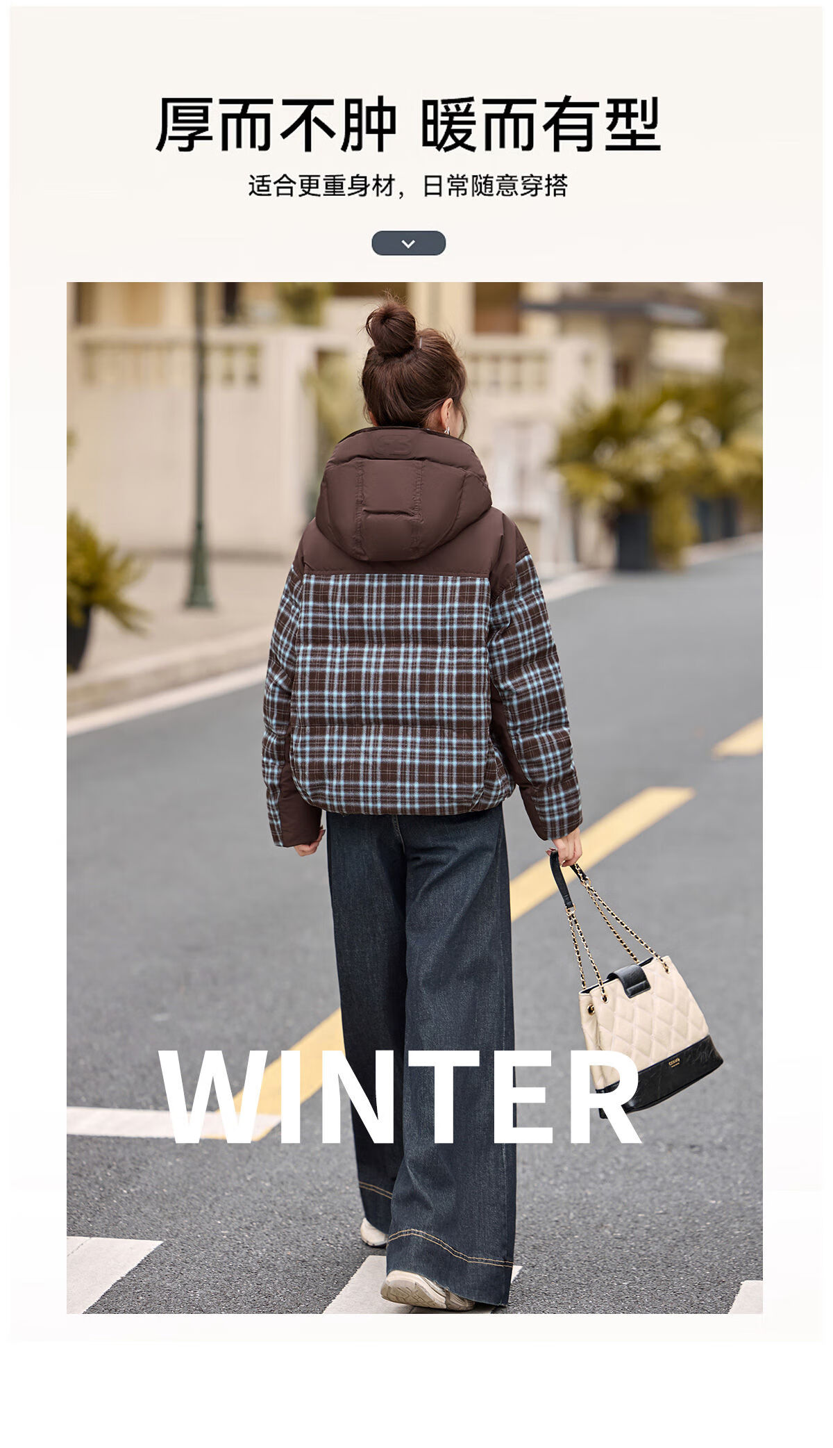LISM shopping mall same style high-end down jacket design contrasting plaid down jacket women Korean version hooded short bread navy XL recommended 135-145Jin Jin equals 0.5 kg b