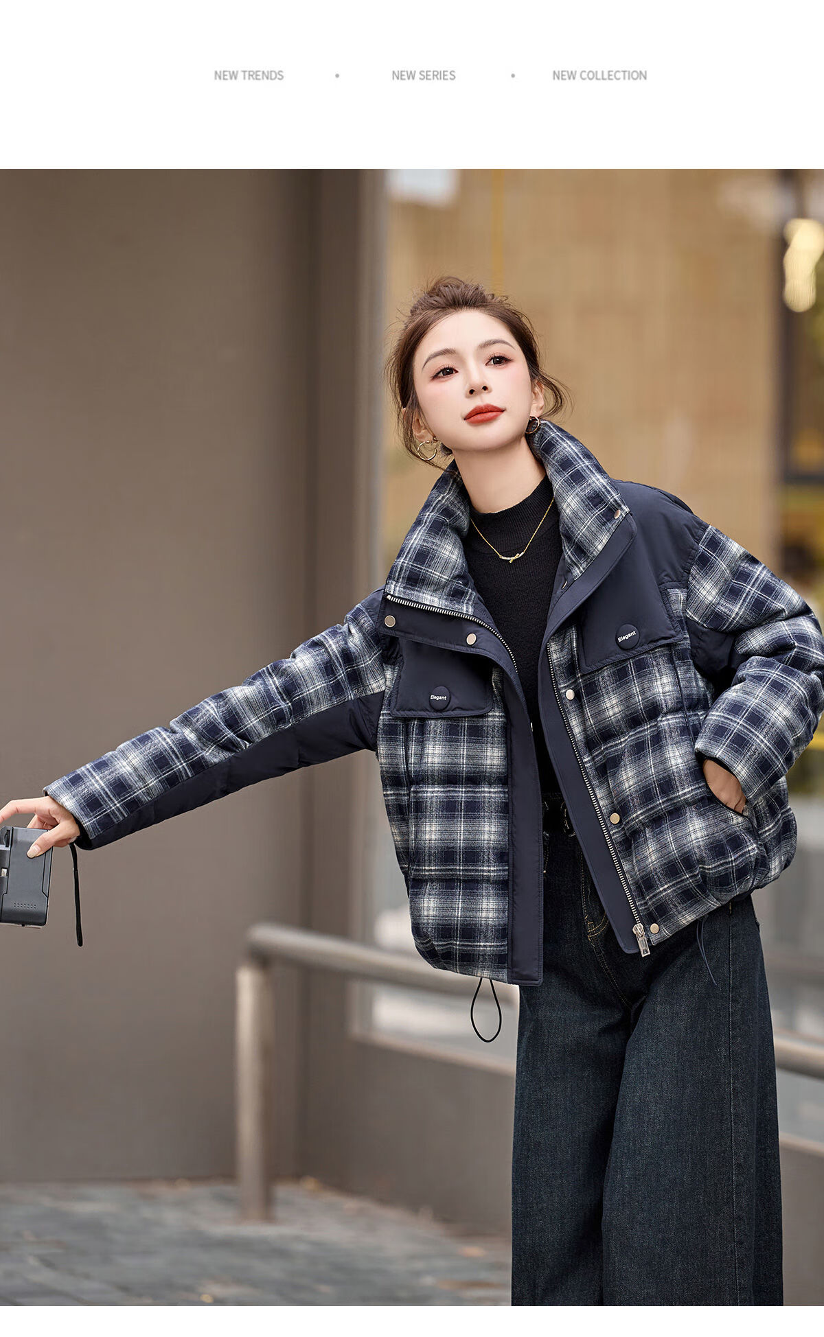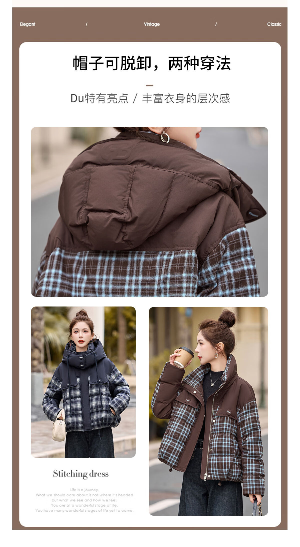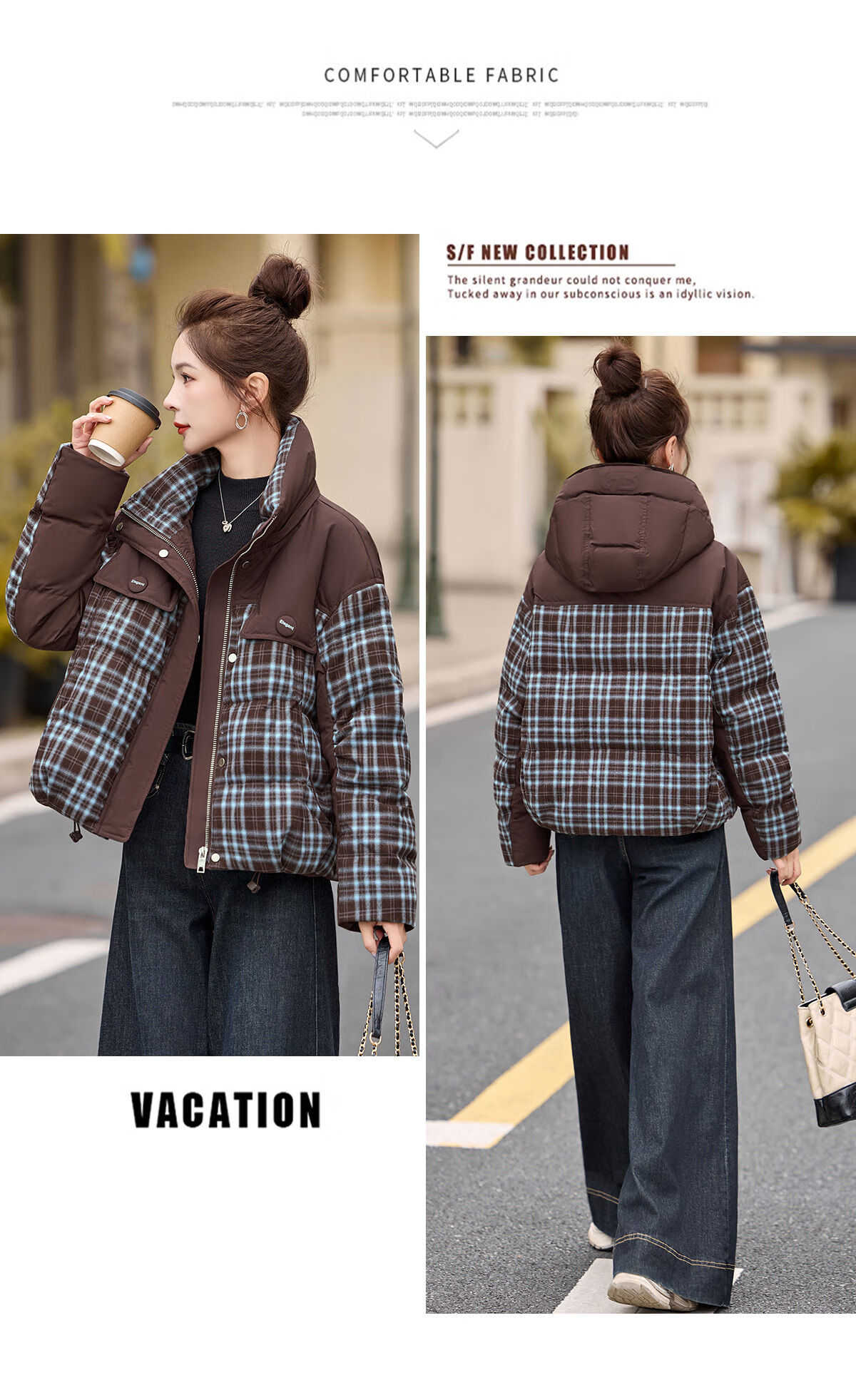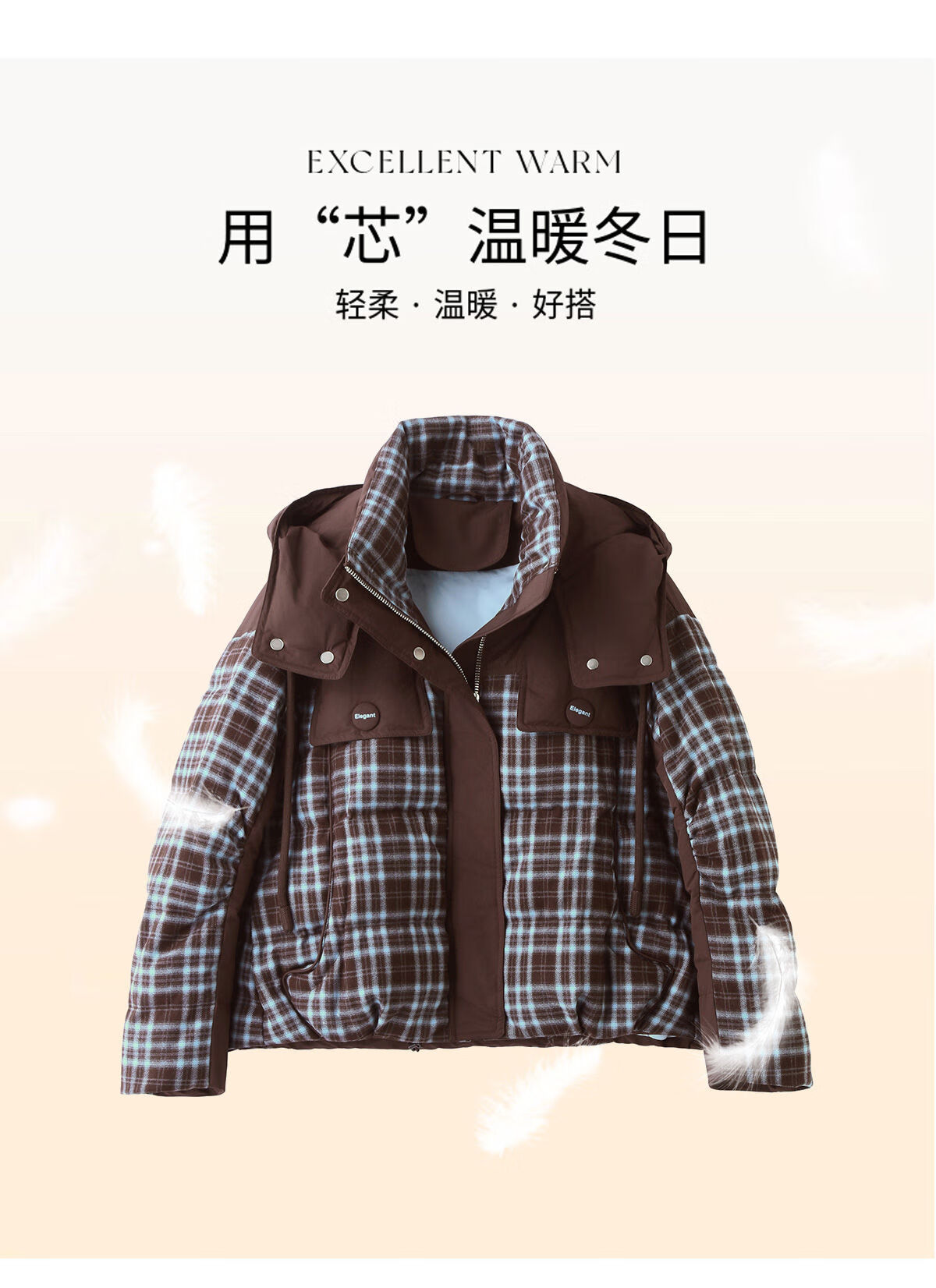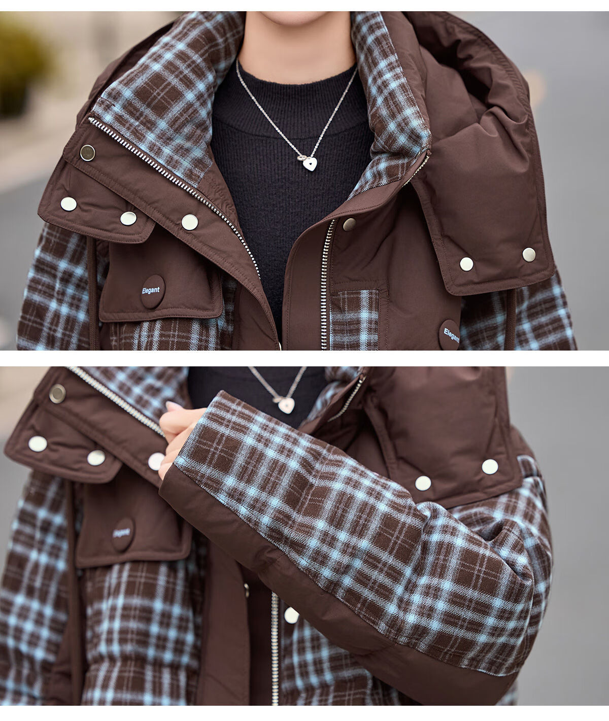 LISM shopping mall same style high-end down jacket design contrasting plaid down jacket women Korean version hooded short bread navy XL recommended 135-145Jin Jin equals 0.5 kg b