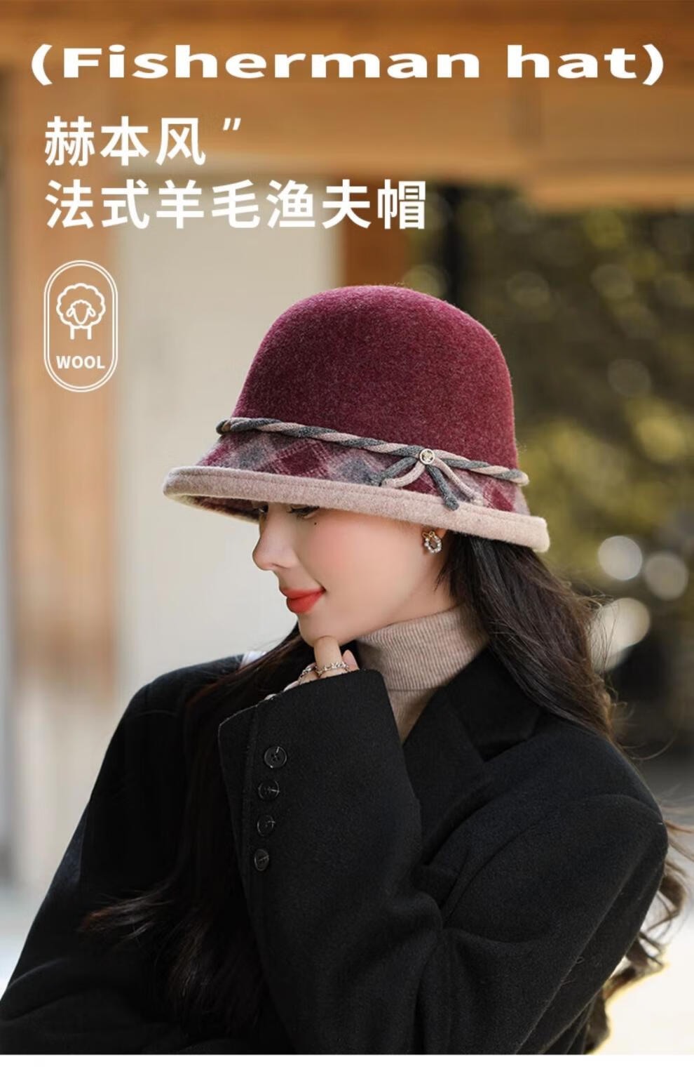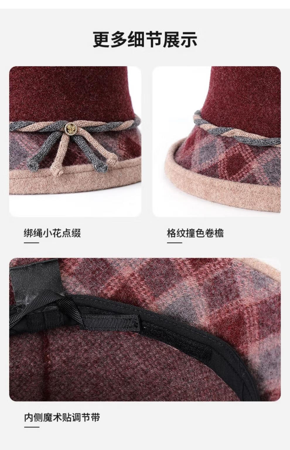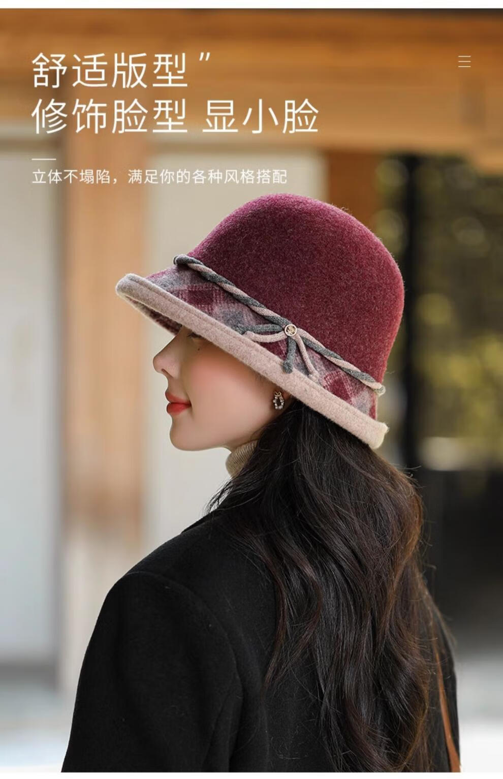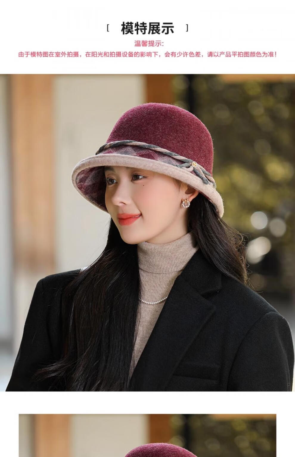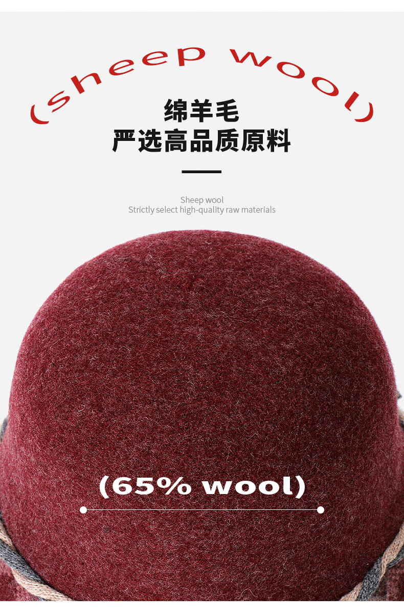GEFWEIMKL merino wool fisherman hat women's autumn and winter elegant fashion curled basin hat middle-aged and elderly mothers warm felt hat burgundy adjustable