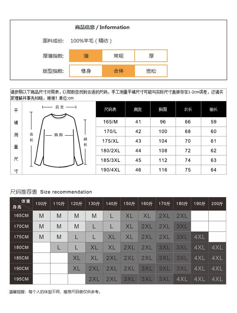 China (cm) 165 / 88-90 170 / 96-98 175 / 108-110 180 / 118-122 185 / 126-130