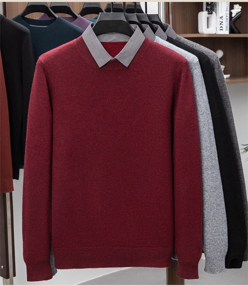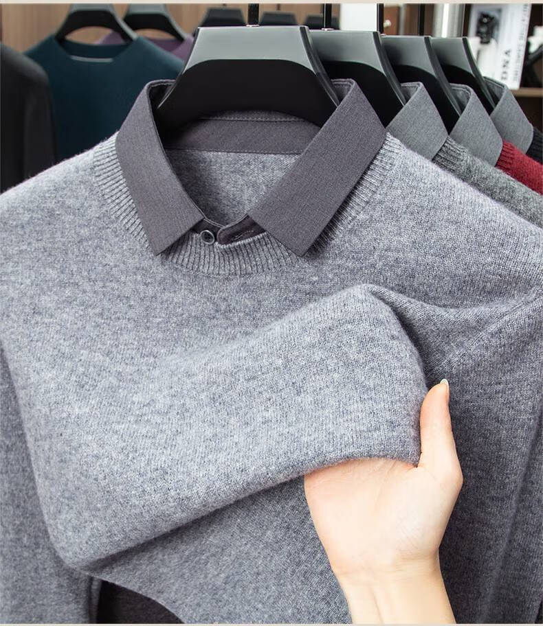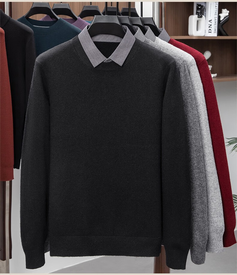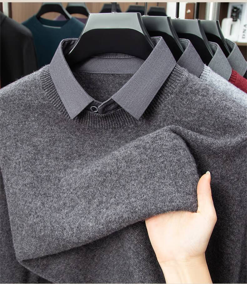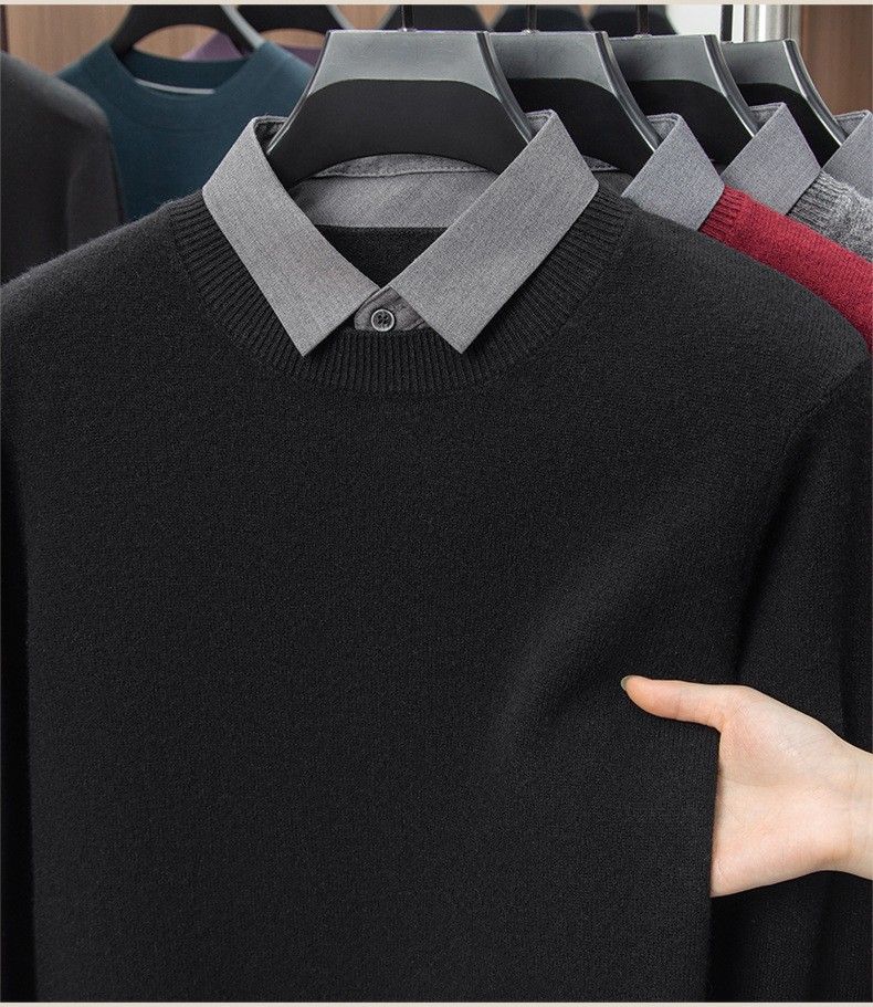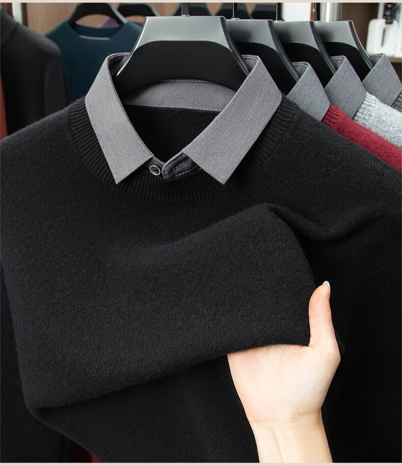 Lilan men's shirt collar fake two-piece woolen sweater round neck thickened casual top new middle-aged business sweater fake black thickened M (165)