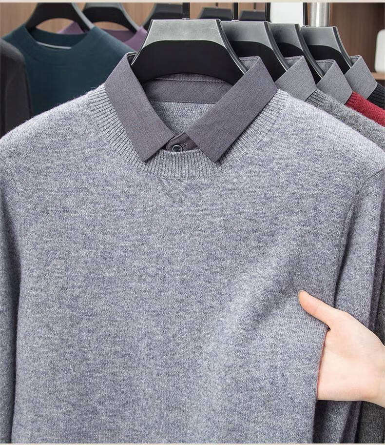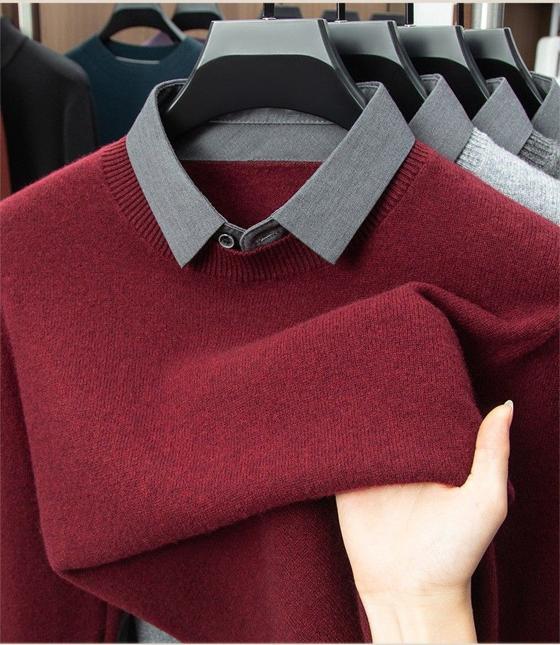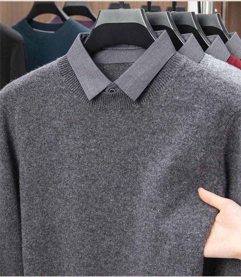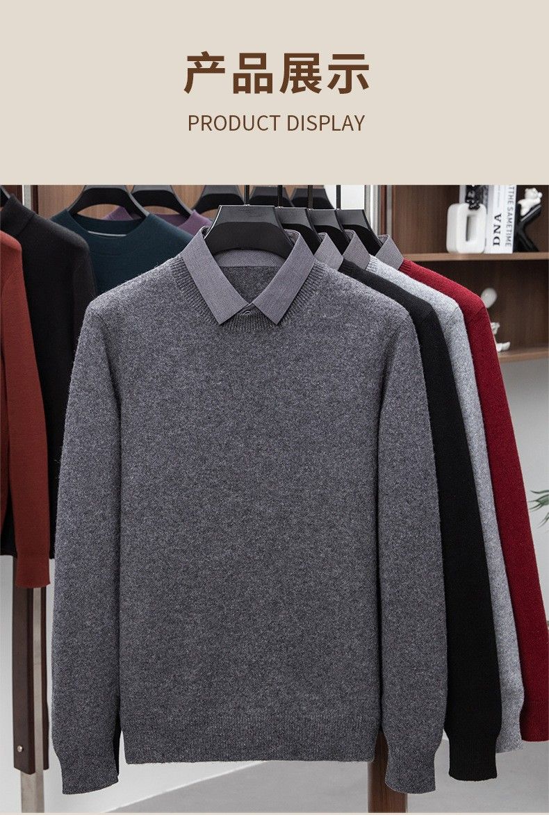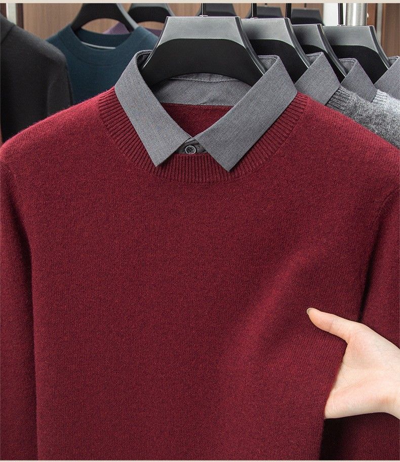 Lilan men's shirt collar fake two-piece woolen sweater round neck thickened casual top new middle-aged business sweater fake black thickened M (165)