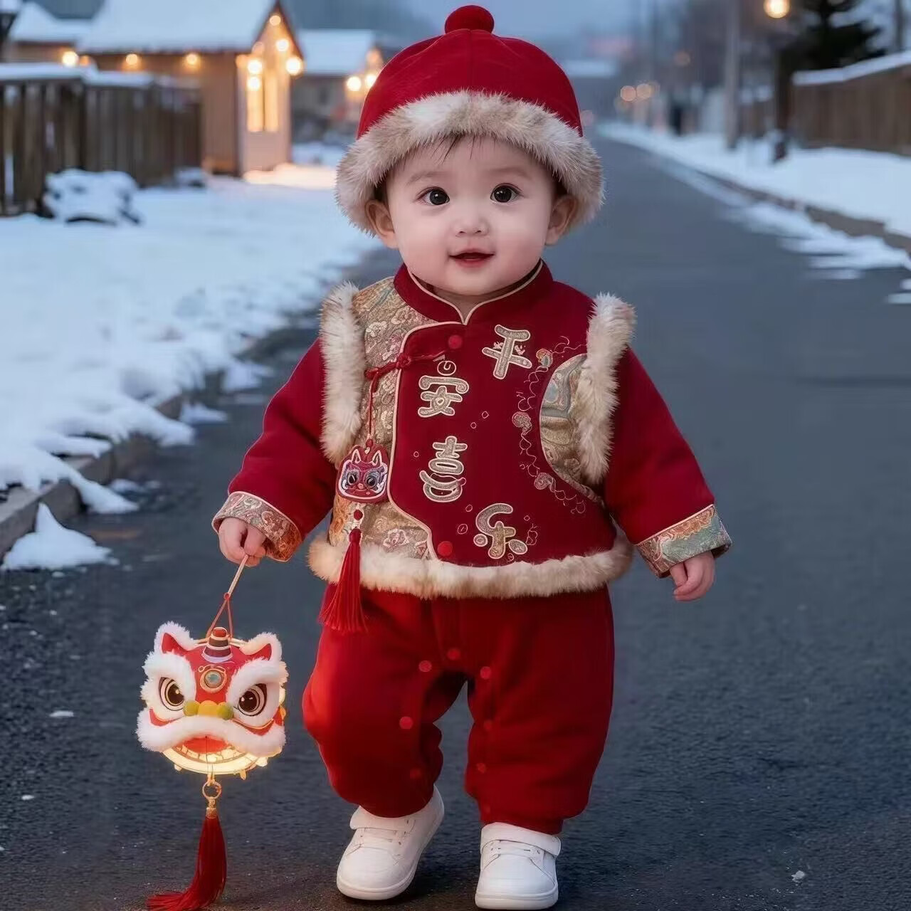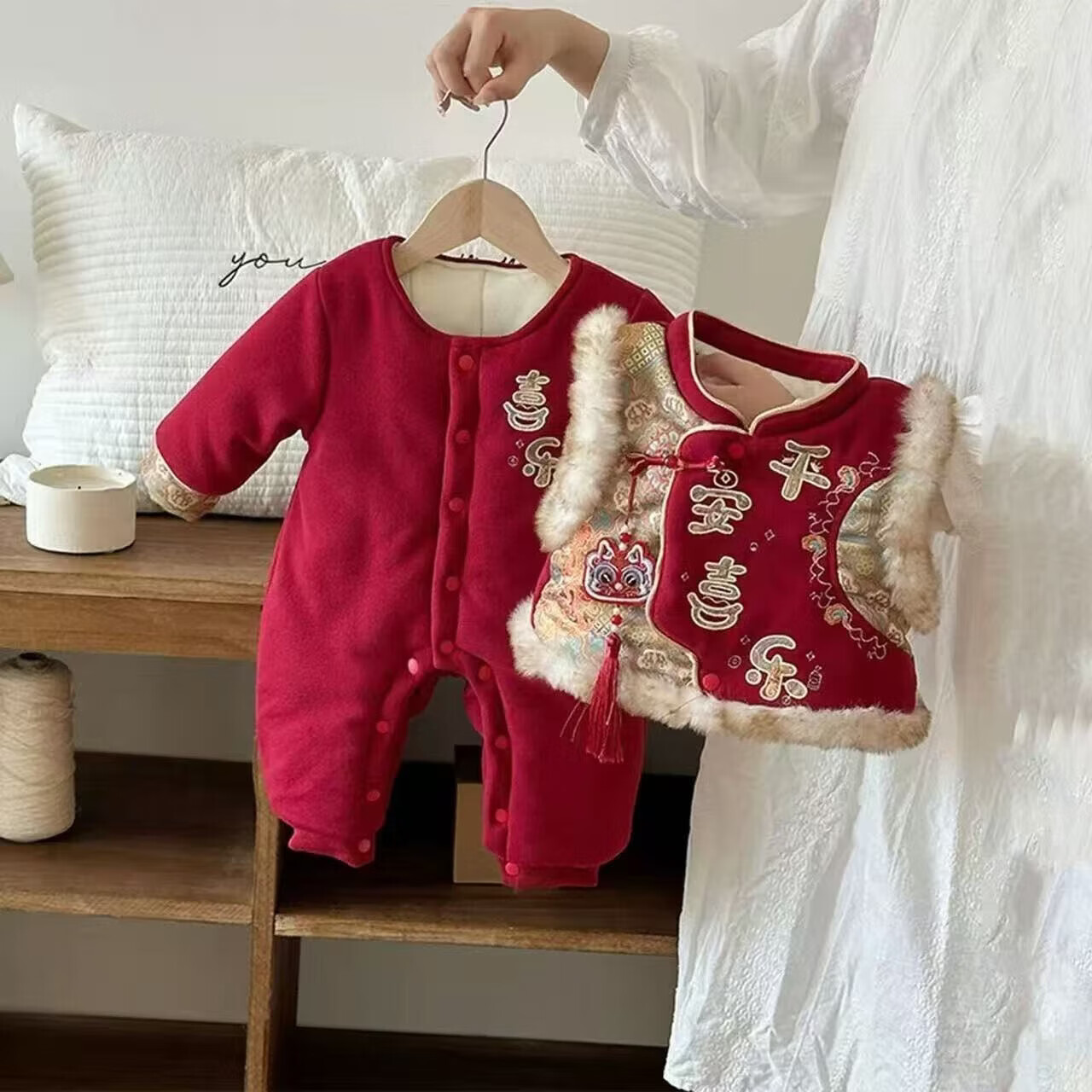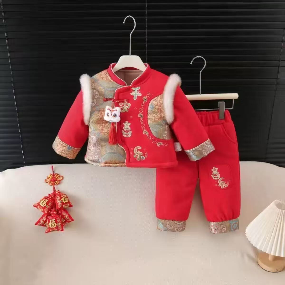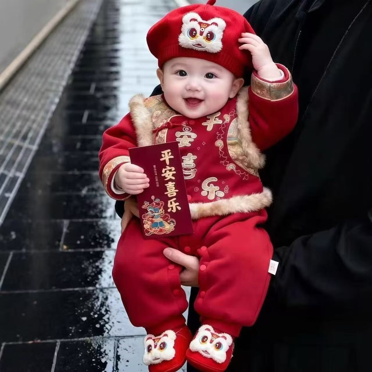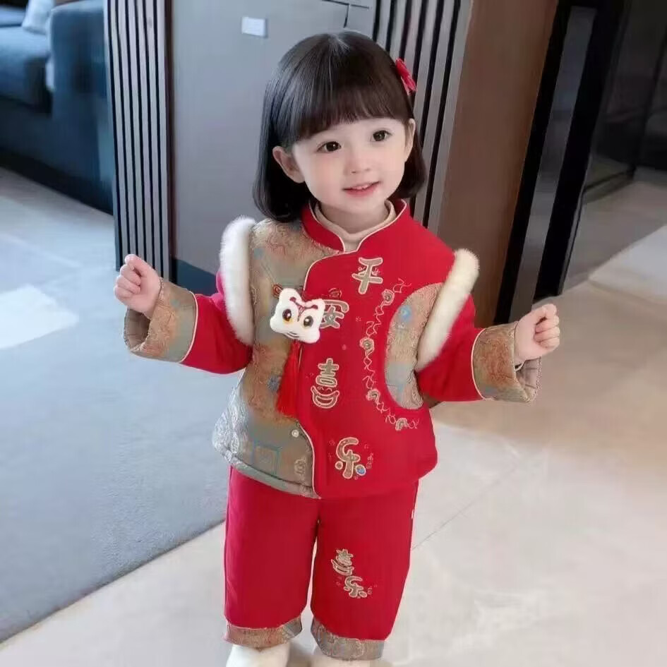 Hongyile baby clothes, winter clothes, one-year-old dress, baby winter jumpsuit, Chinese style New Year's greeting suit, full moon and 100th day New Year's wear, safe and happy thickened jumpsuit + vest (without hood) 100cm 15-18 months 25-28Jin Jin equals 0.5 kg