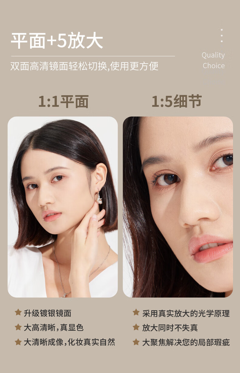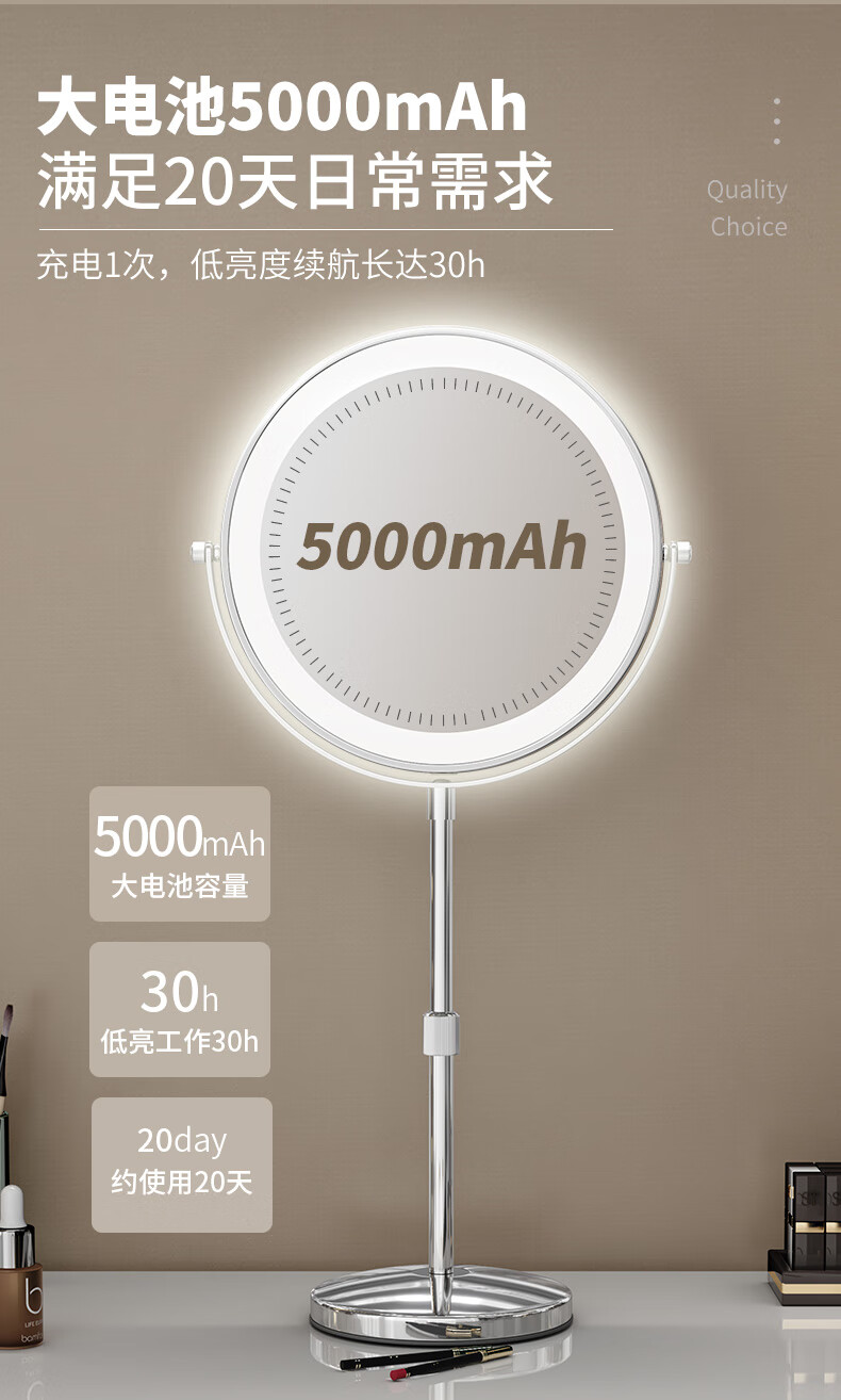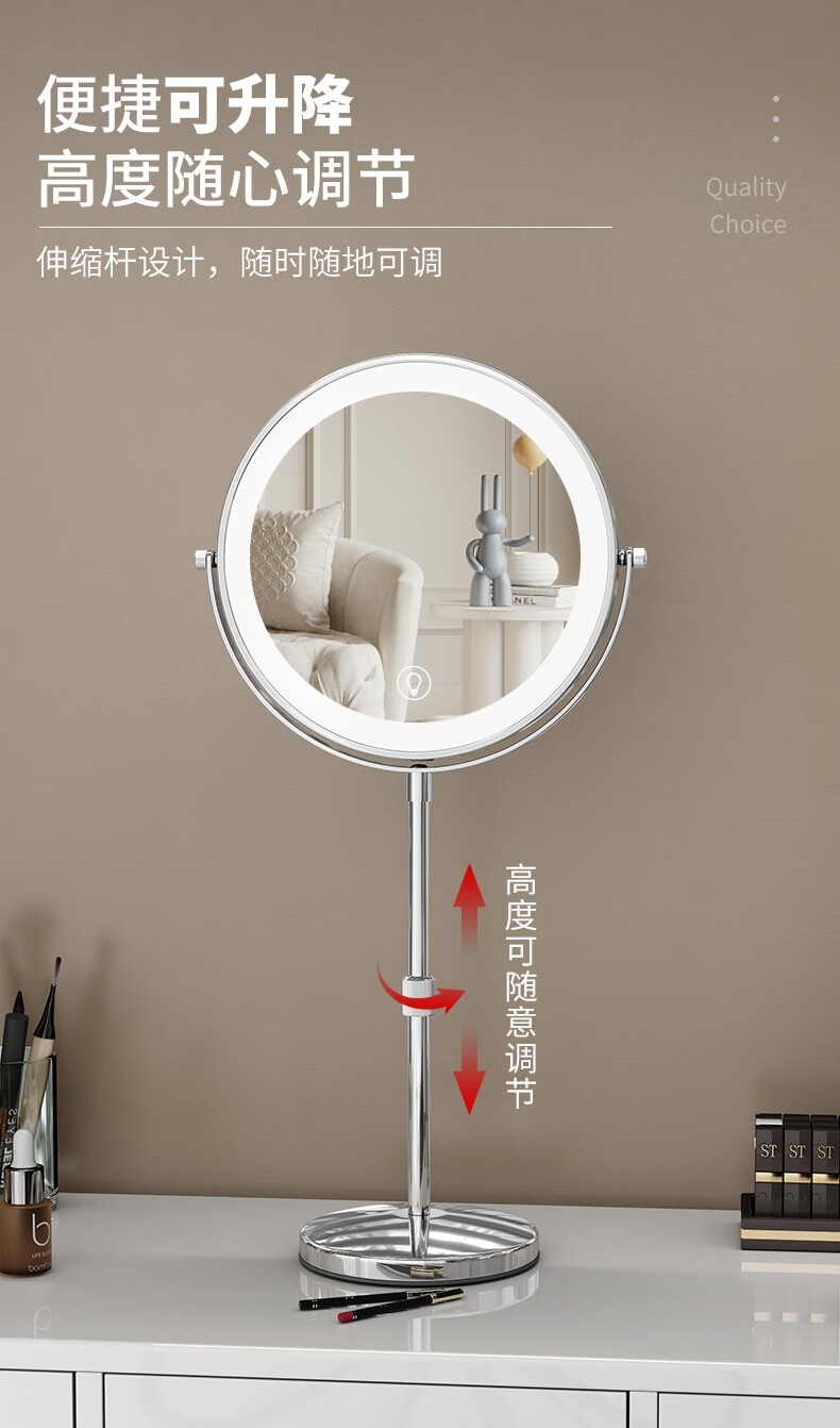 Large LED makeup mirror that can be raised and lowered. Telescopic double-sided illuminated mirror. Desktop magnifying mirror. Desktop beauty mirror can be adjusted in height. 9 inches. Silver. European and American models. 5x magnification.