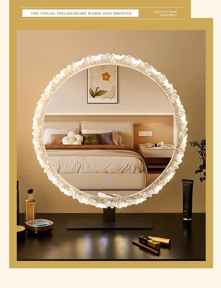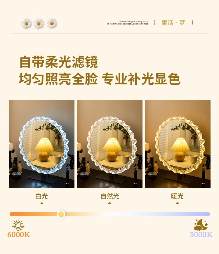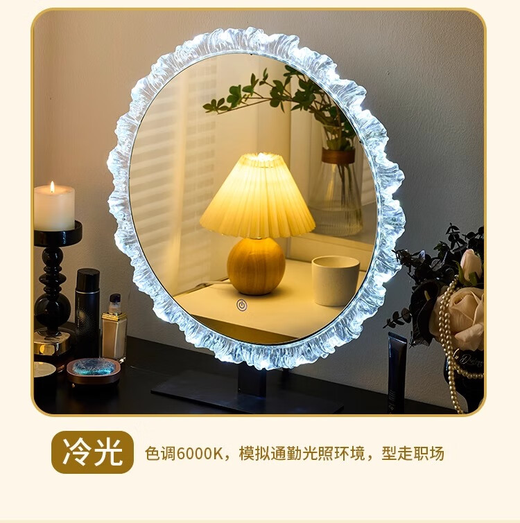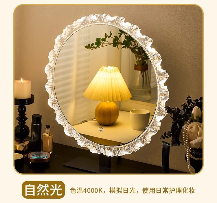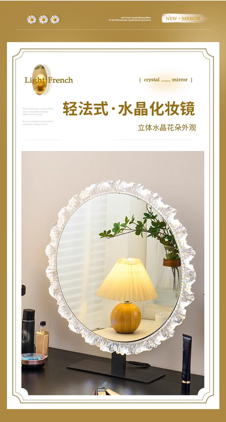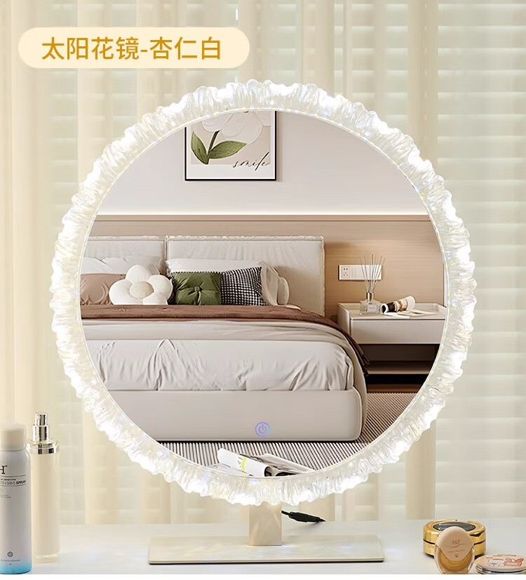 Cosmetic mirror with light desktop desktop LED mirror sunflower beauty mirror French master bedroom makeup mirror with real light, diameter 40cm, plug-in model + wall hanging (three-color light changing)