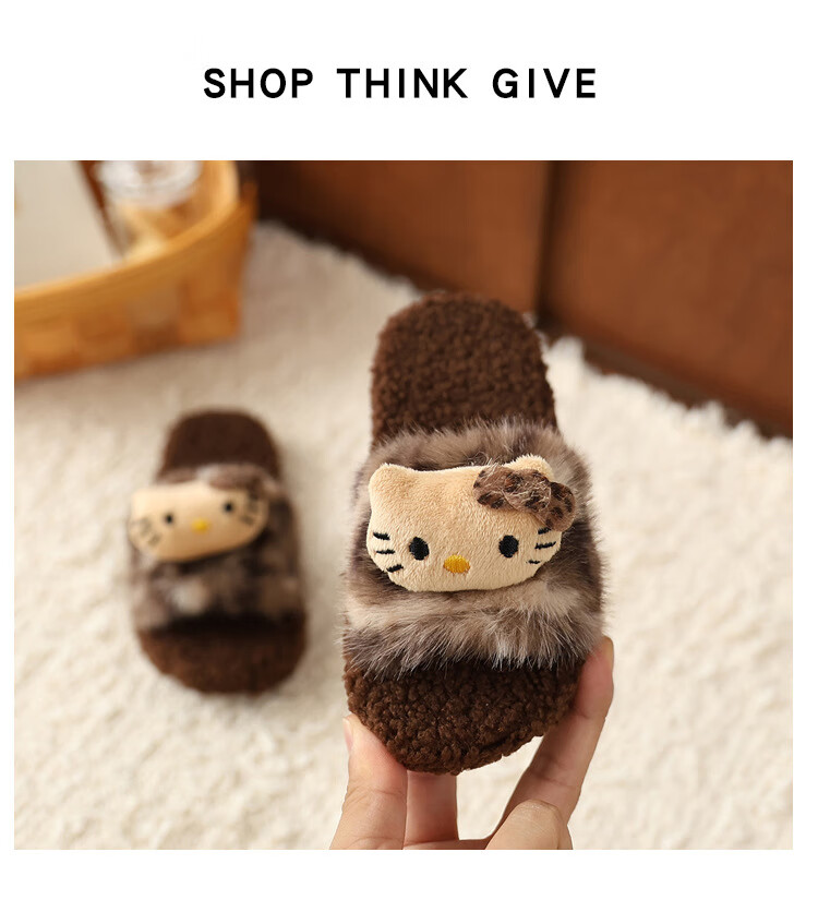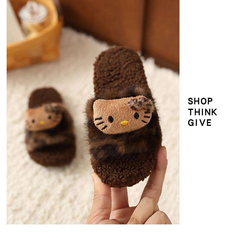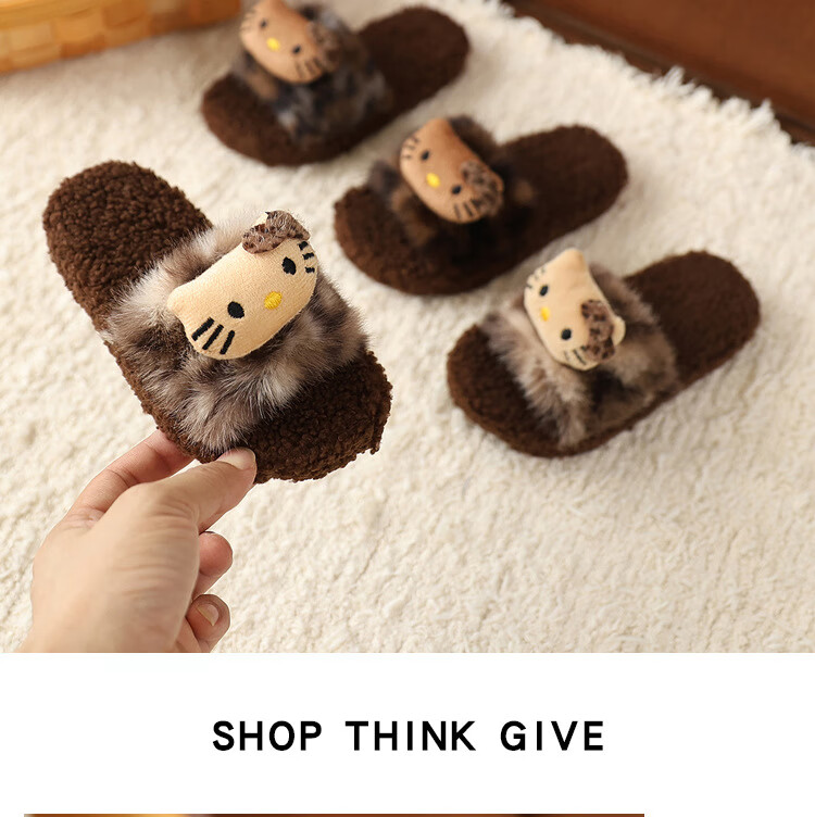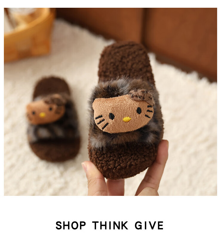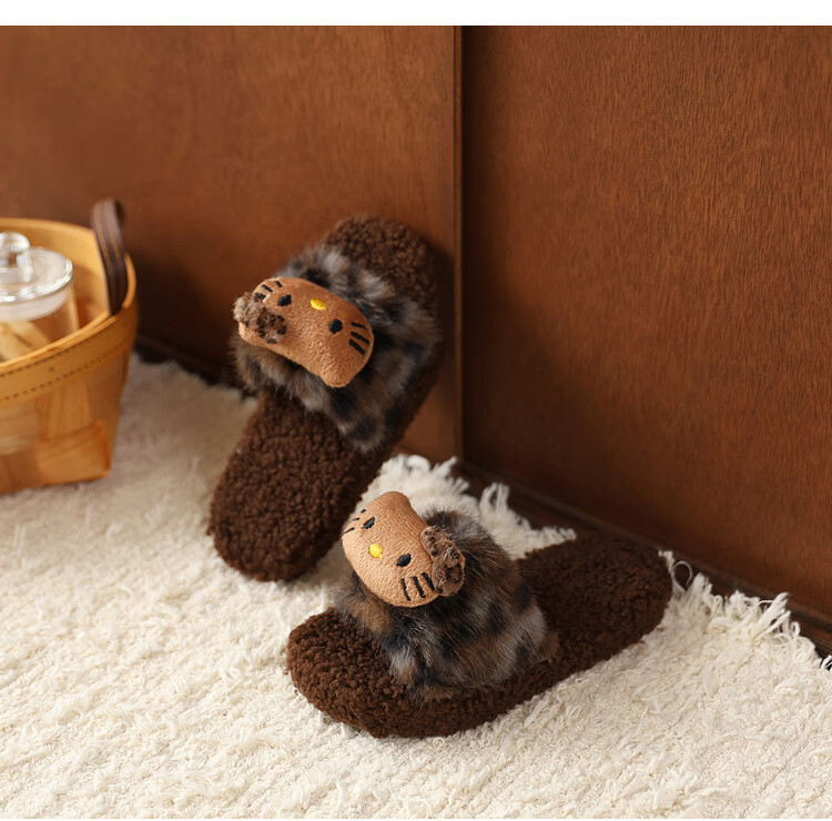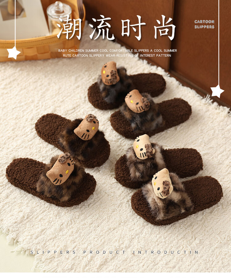 ABCTX leopard print children's furry slippers cute cat home autumn and winter new non-slip warm baby girl's cotton slippers leopard print brown--kt cat 24 25 (inner length 16cm)