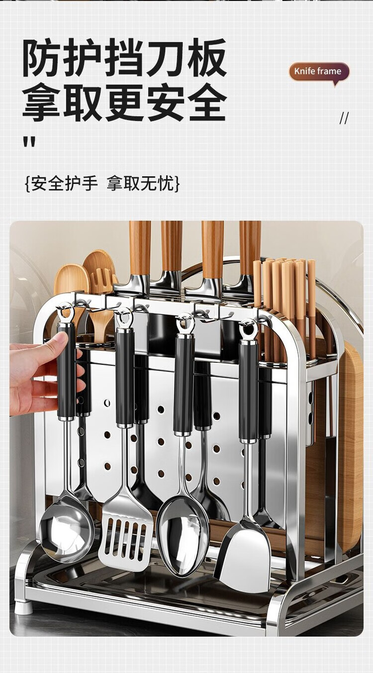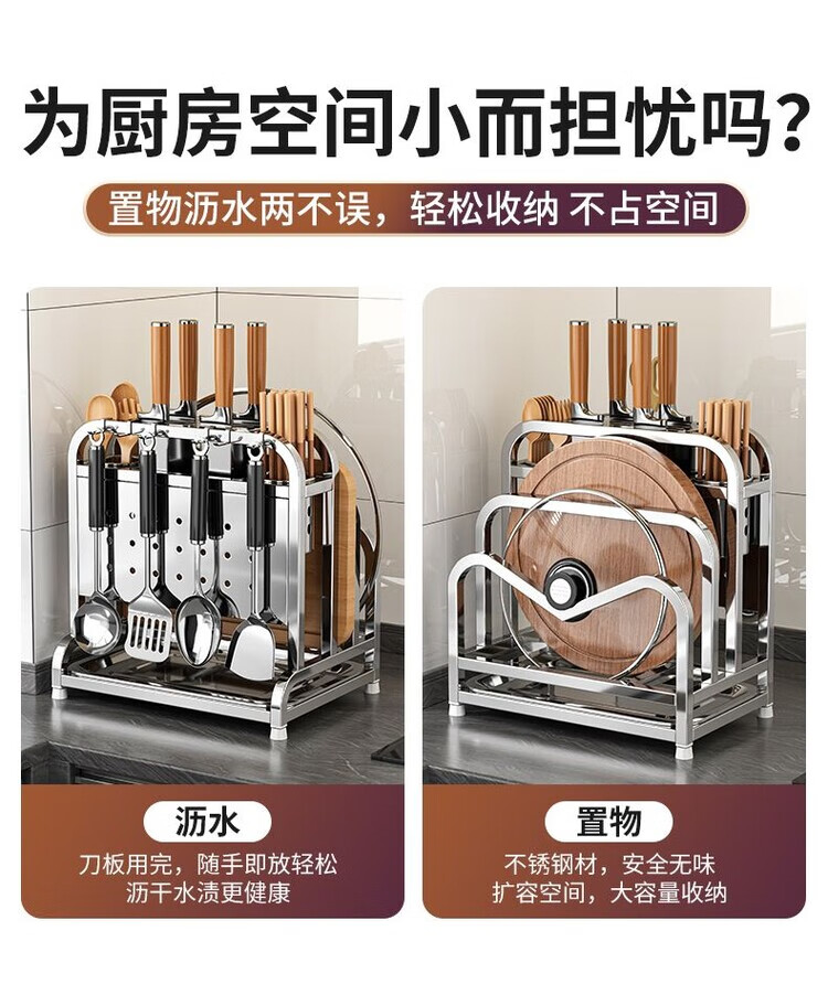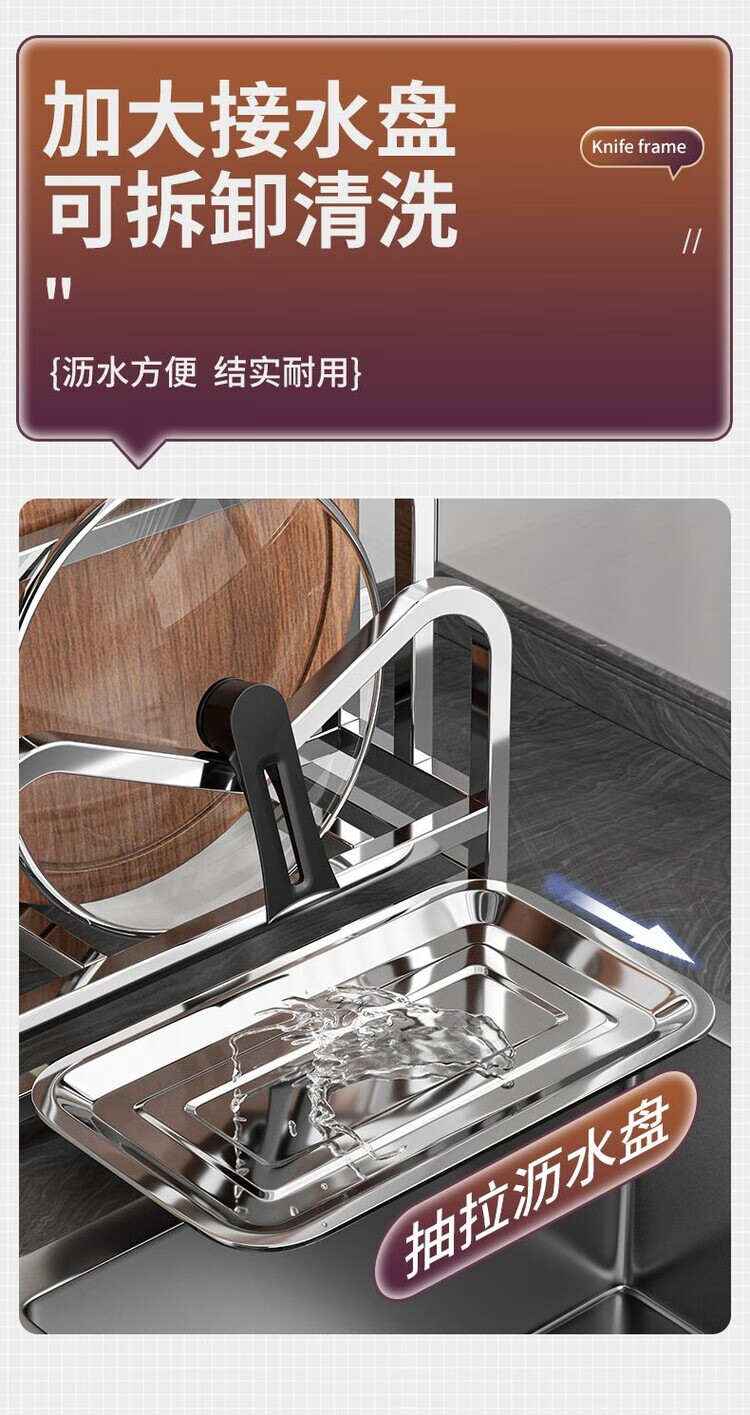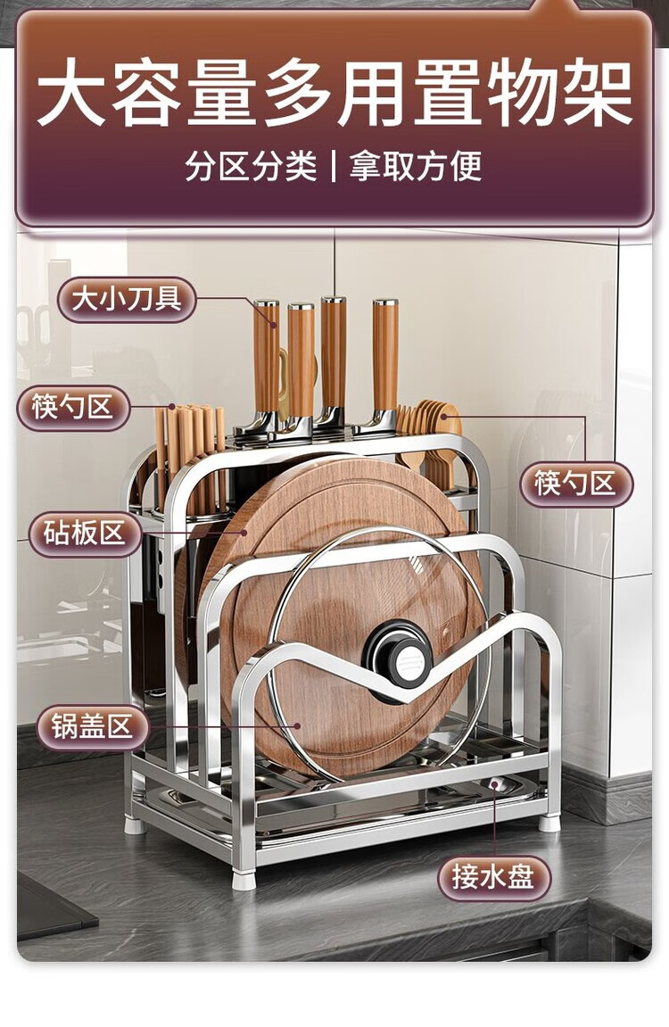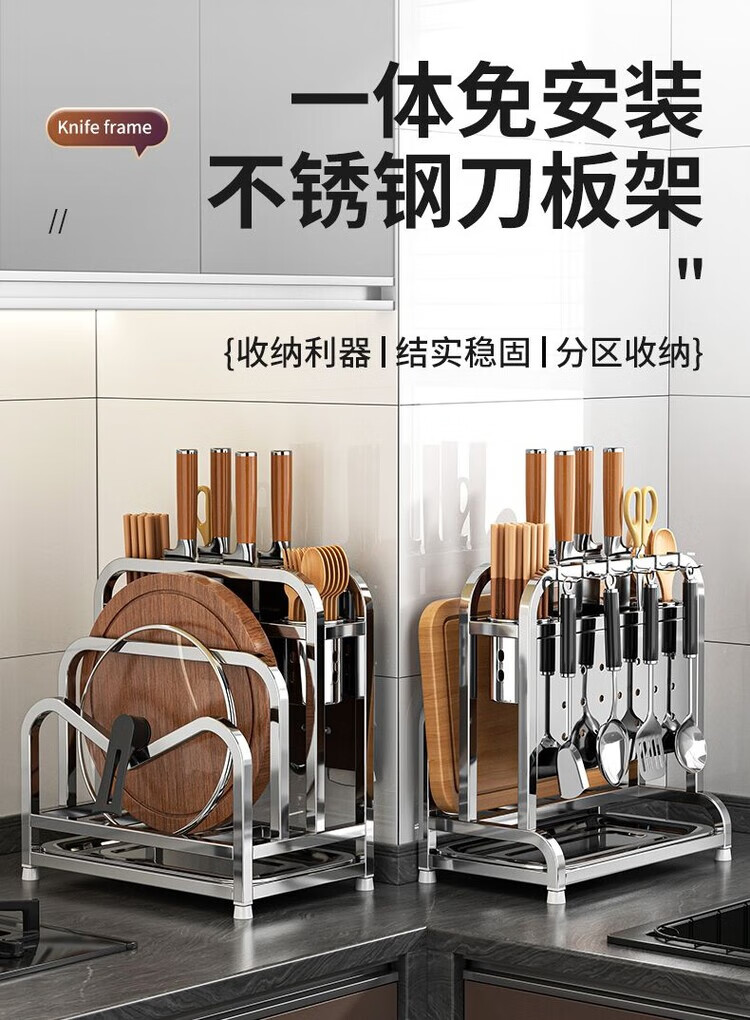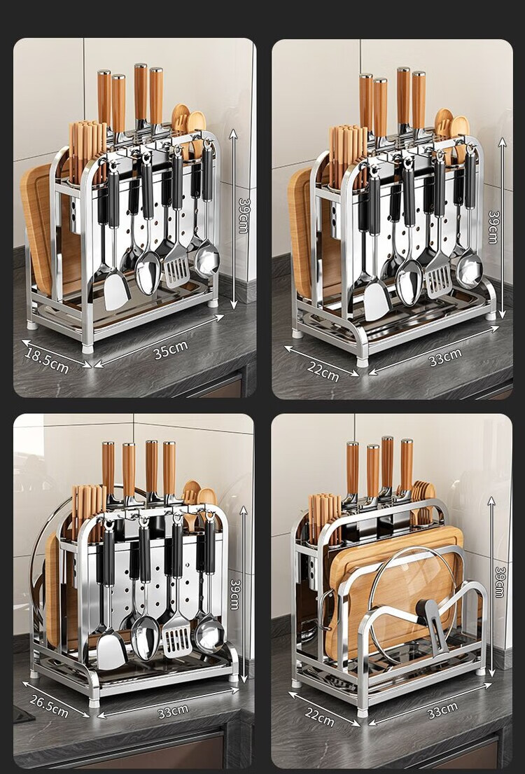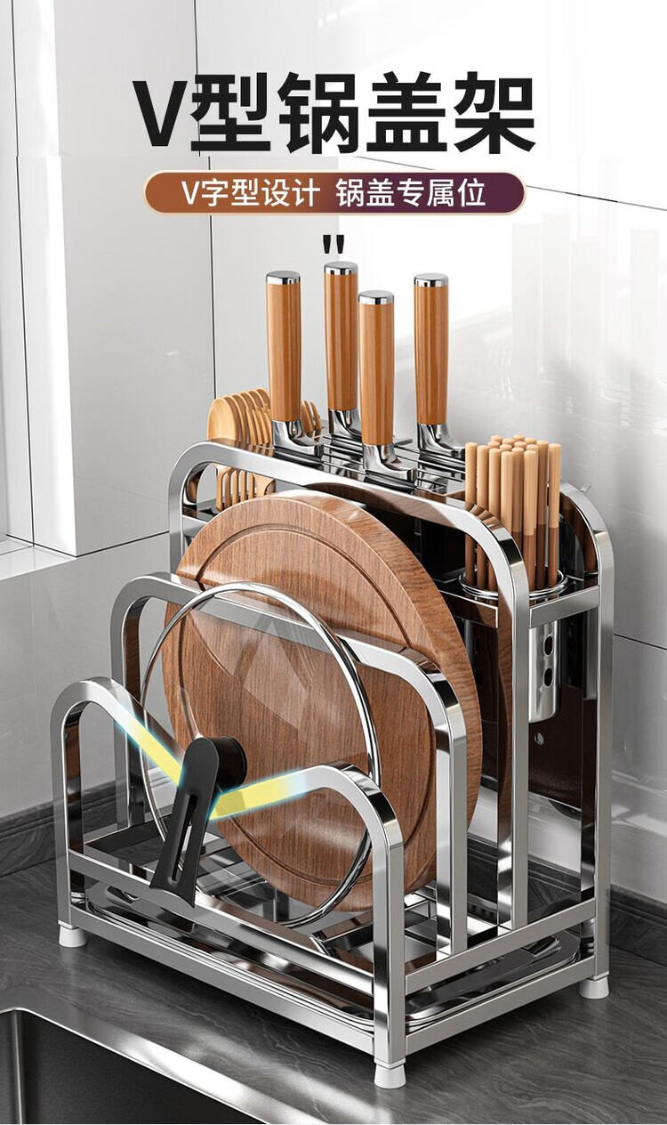 Wing Fantasy 304 Stainless Steel Knife Rack Kitchen Pot Lid Chopping Board Knife Integrated Storage Rack Countertop Chopping Board Placement Rack 304 Stainless Steel Large Chopping Board + Pot Lid Rack