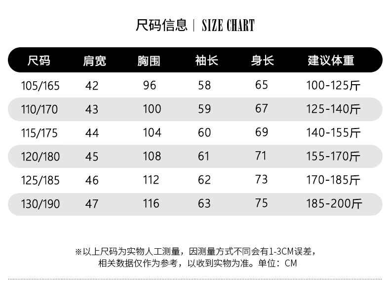 China (cm) 165 / 88-90 170 / 96-98 175 / 108-110 180 / 118-122 185 / 126-130