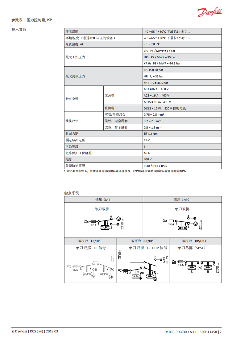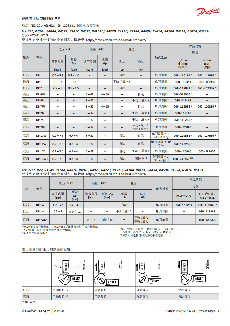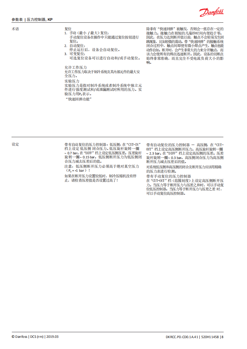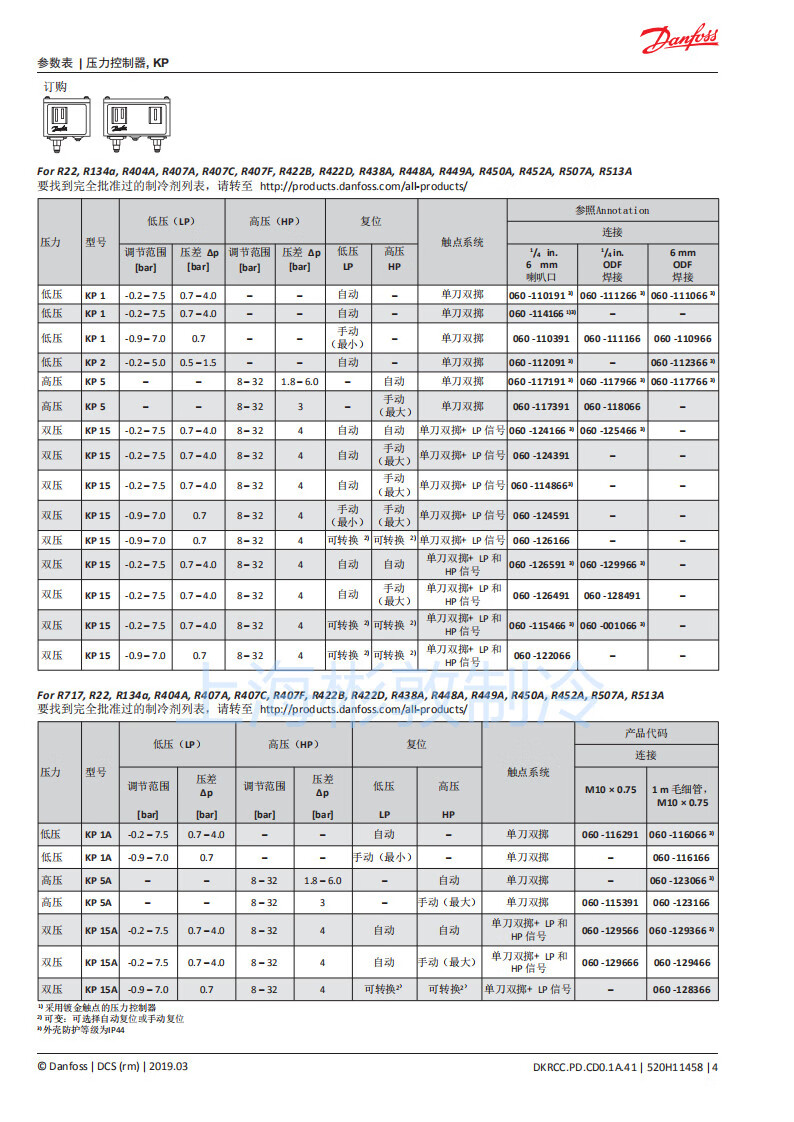 Danfoss Danfoss pressure controlled pressure controller KP1, KP2 KP36 KP35 KP7W S KP6W B KP1_060-1101 automatic reset