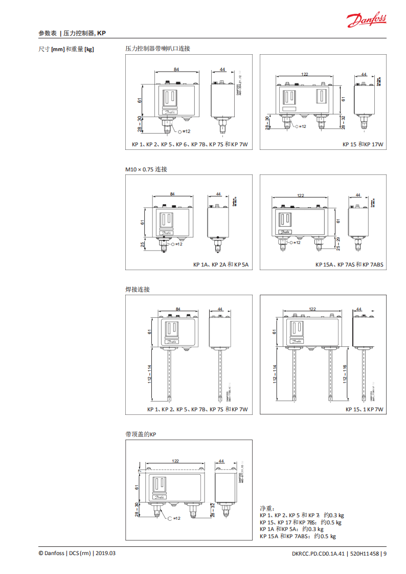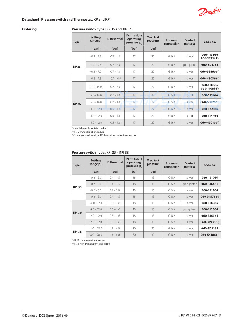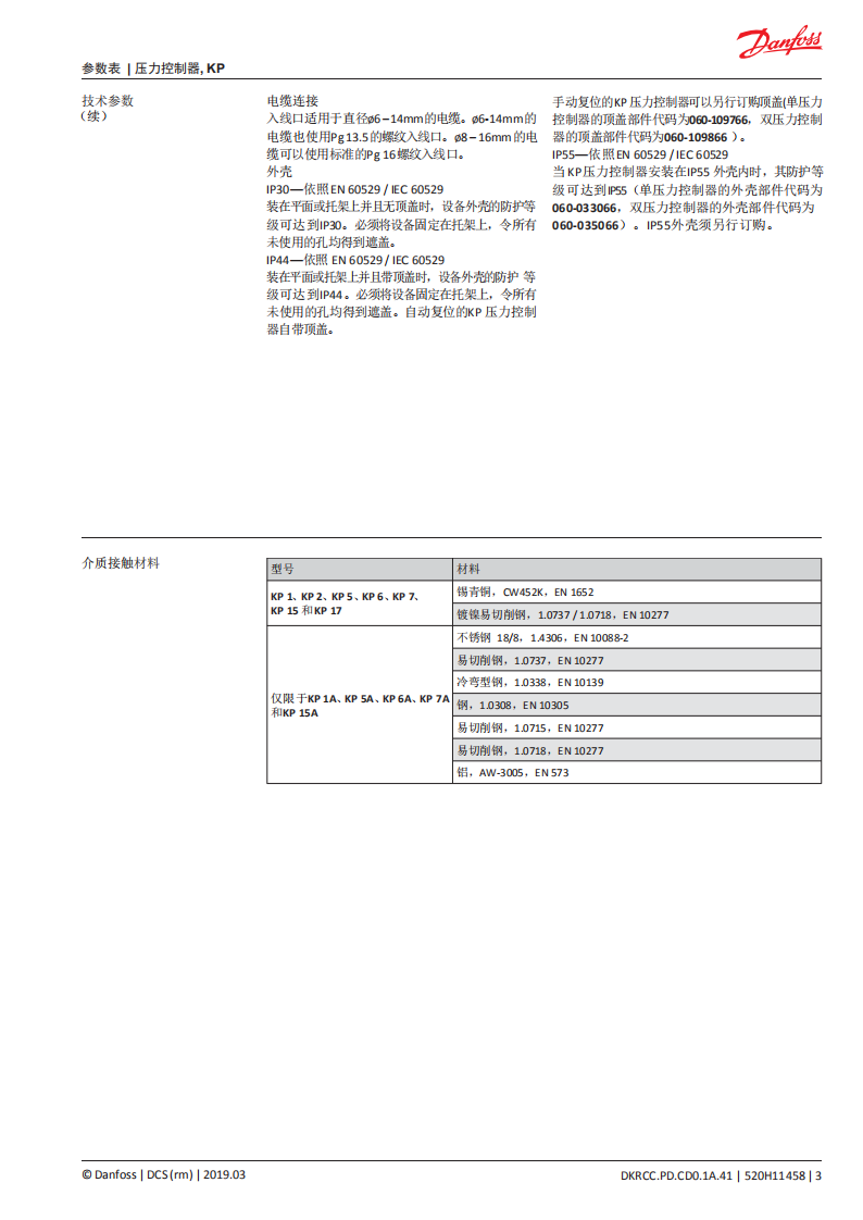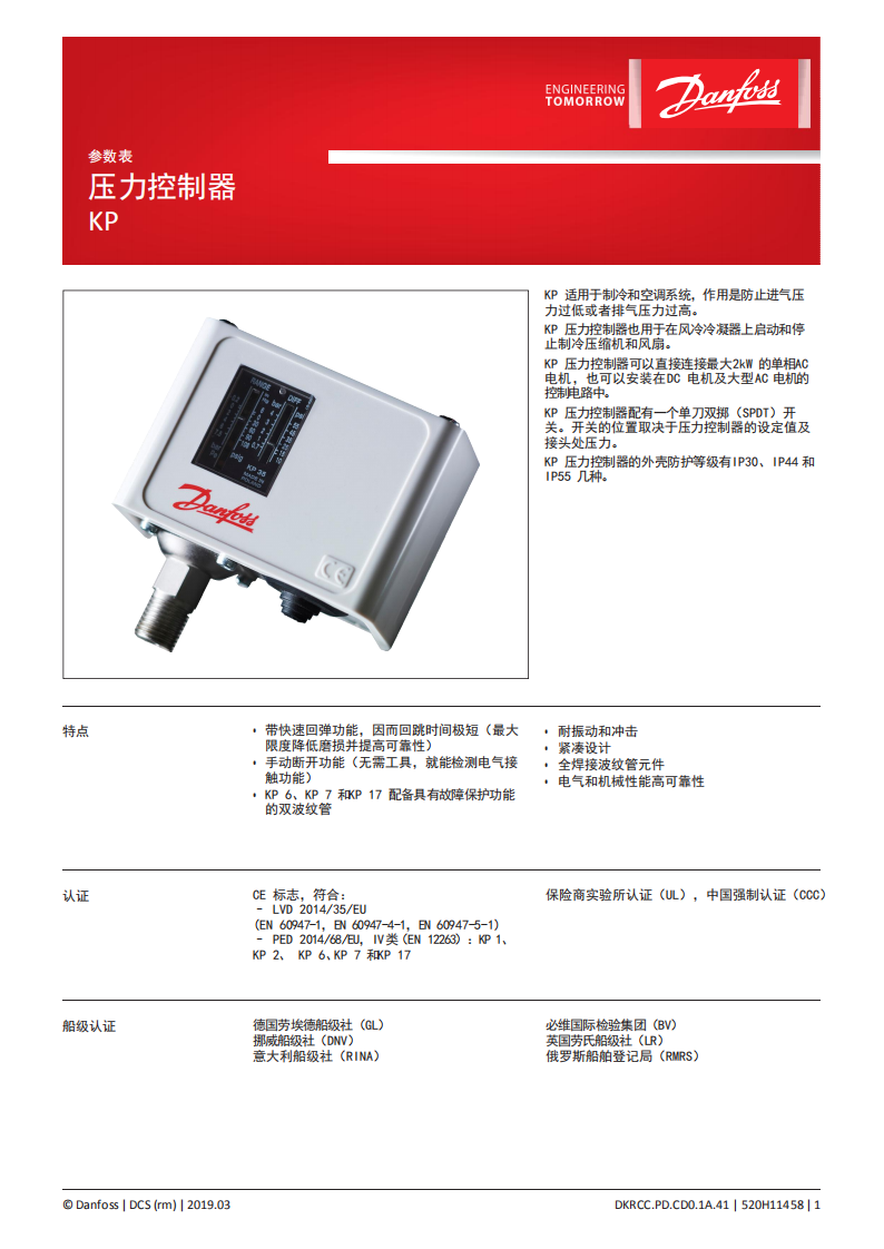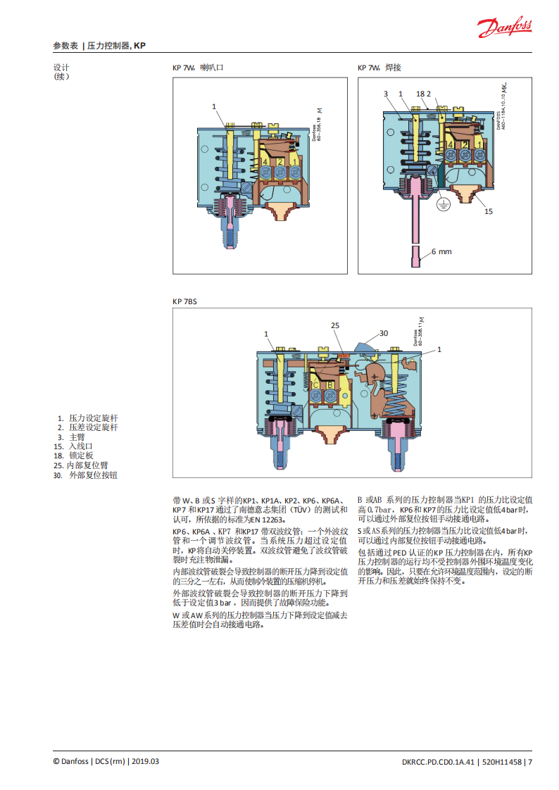 Danfoss Danfoss pressure controlled pressure controller KP1, KP2 KP36 KP35 KP7W S KP6W B KP1_060-1101 automatic reset