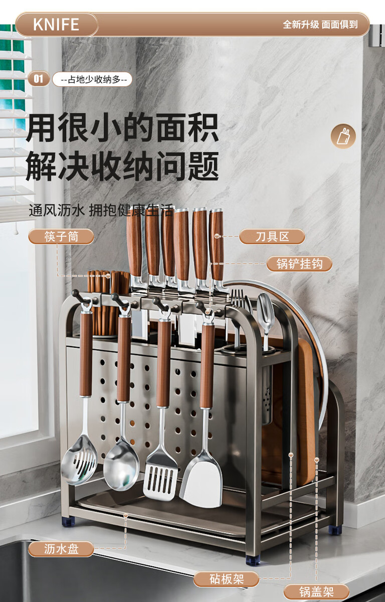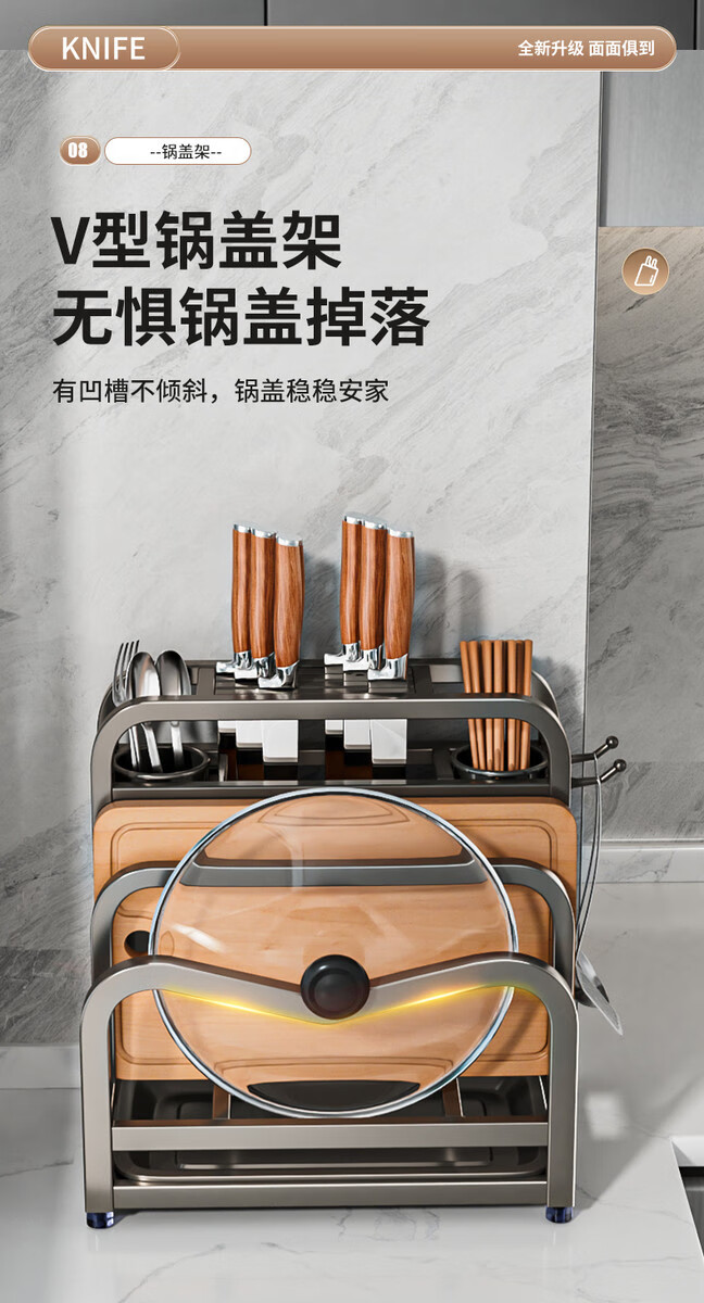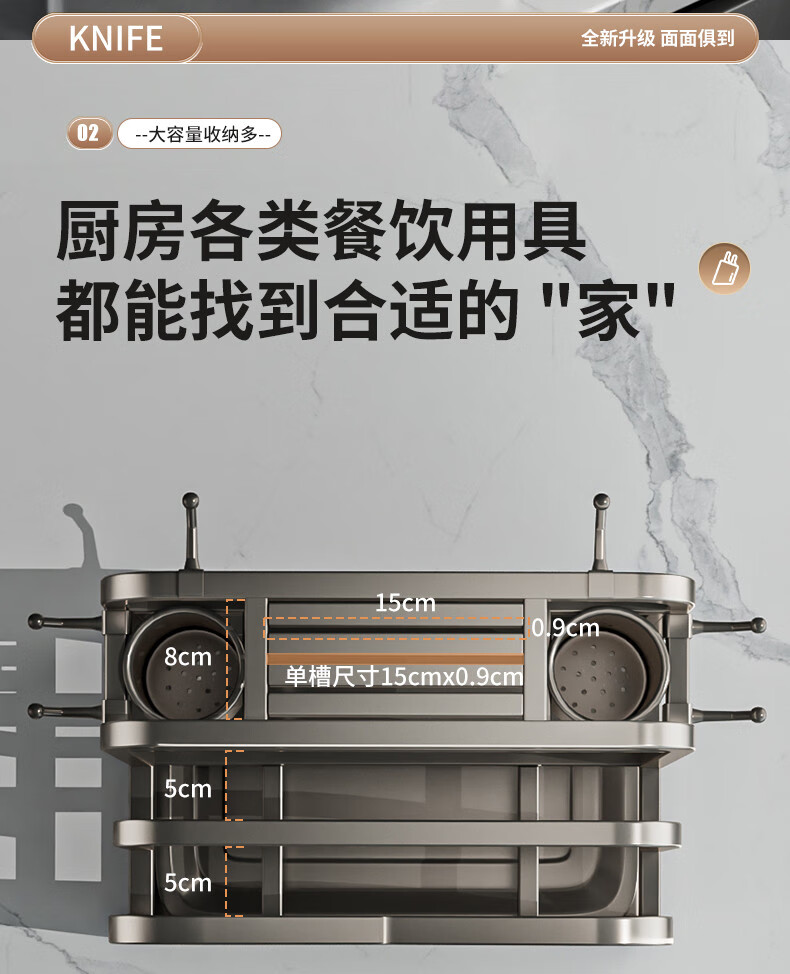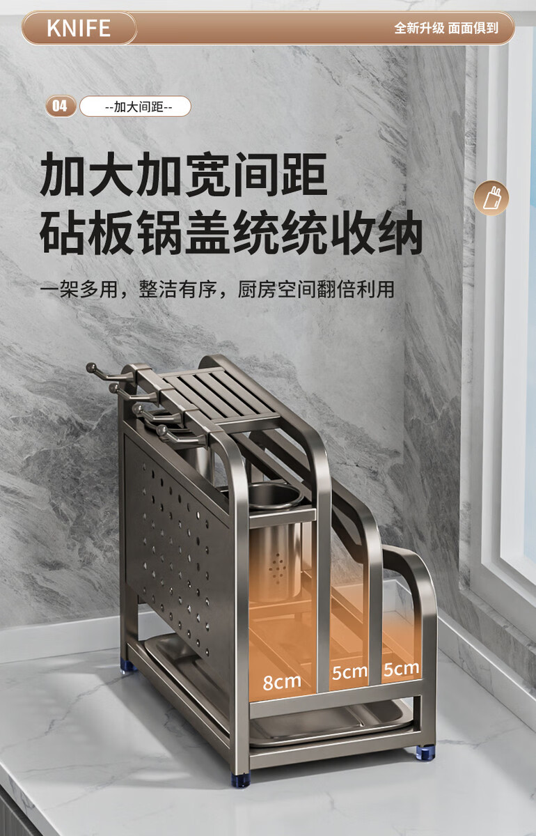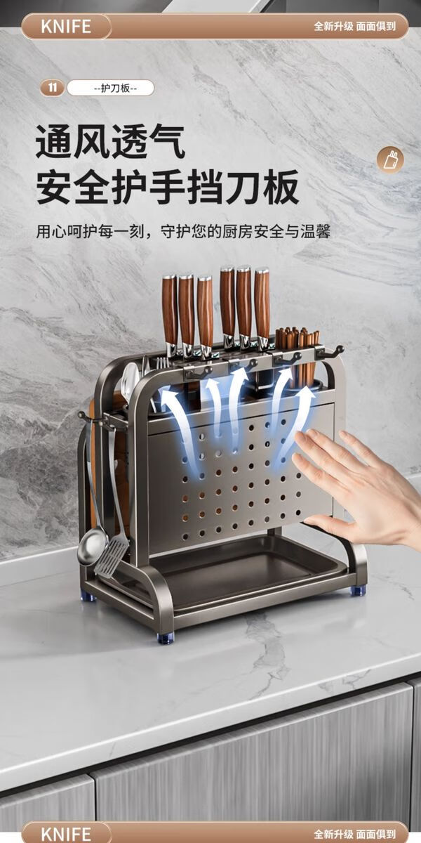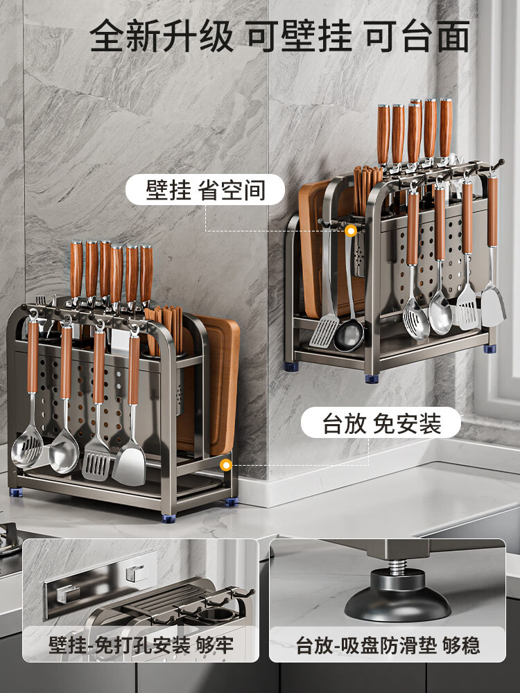 Fantasy stainless steel kitchen knife rack wall-mounted multi-functional cutting board, knife and chopstick cage integrated storage rack. Main image gun gray. Width and height. Knife guard+double chopping board/pot lid rack+