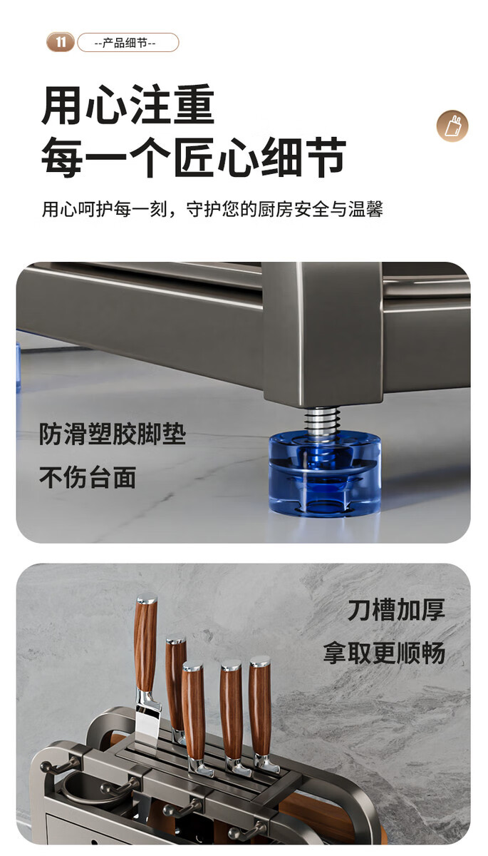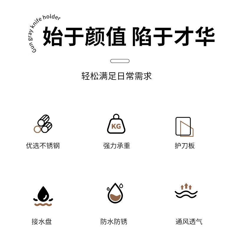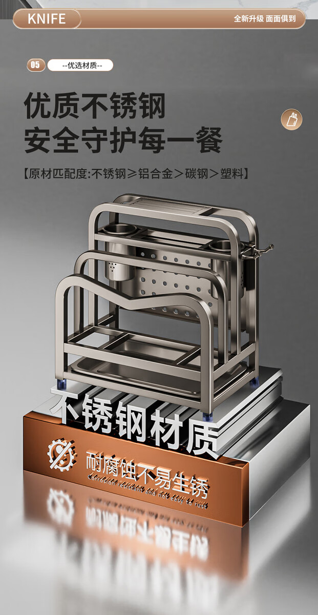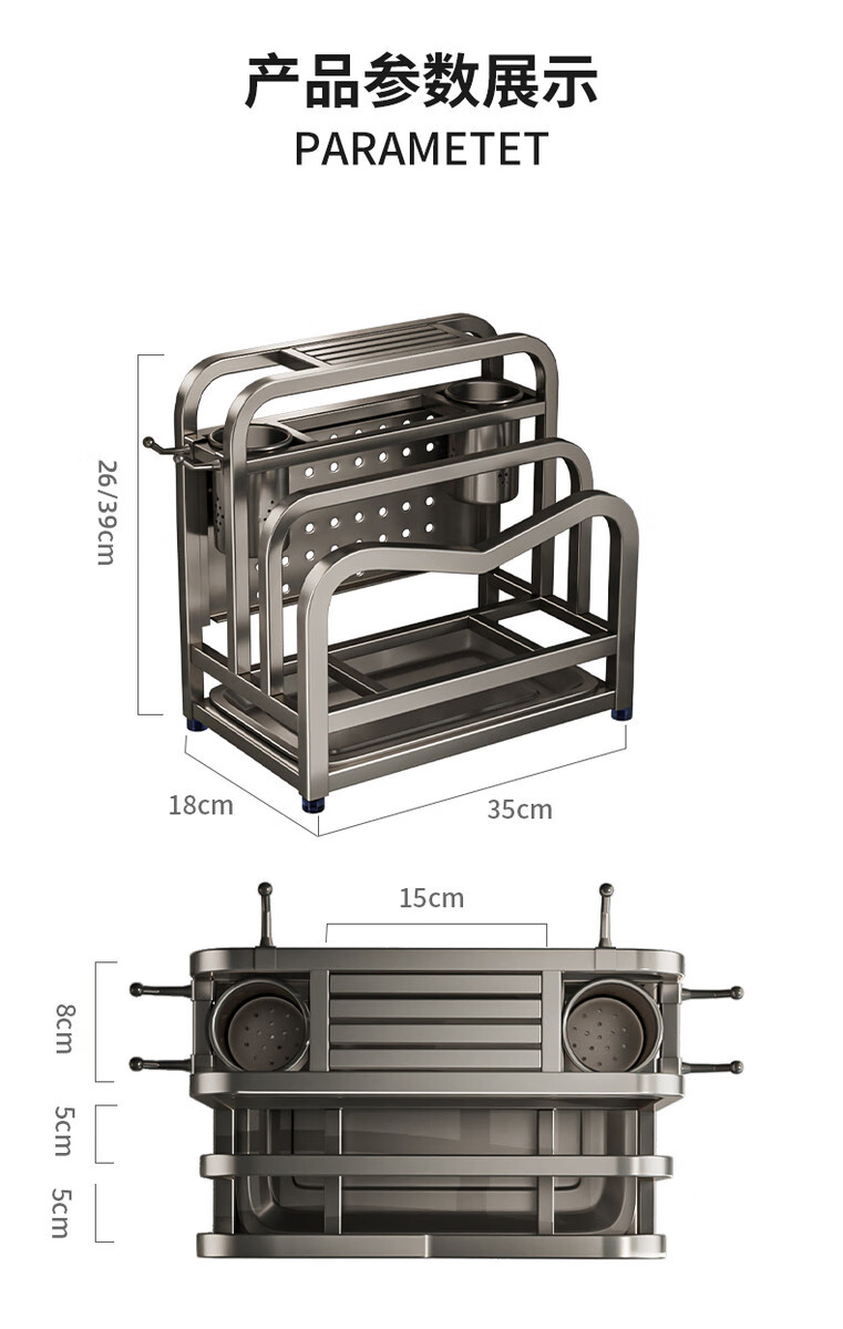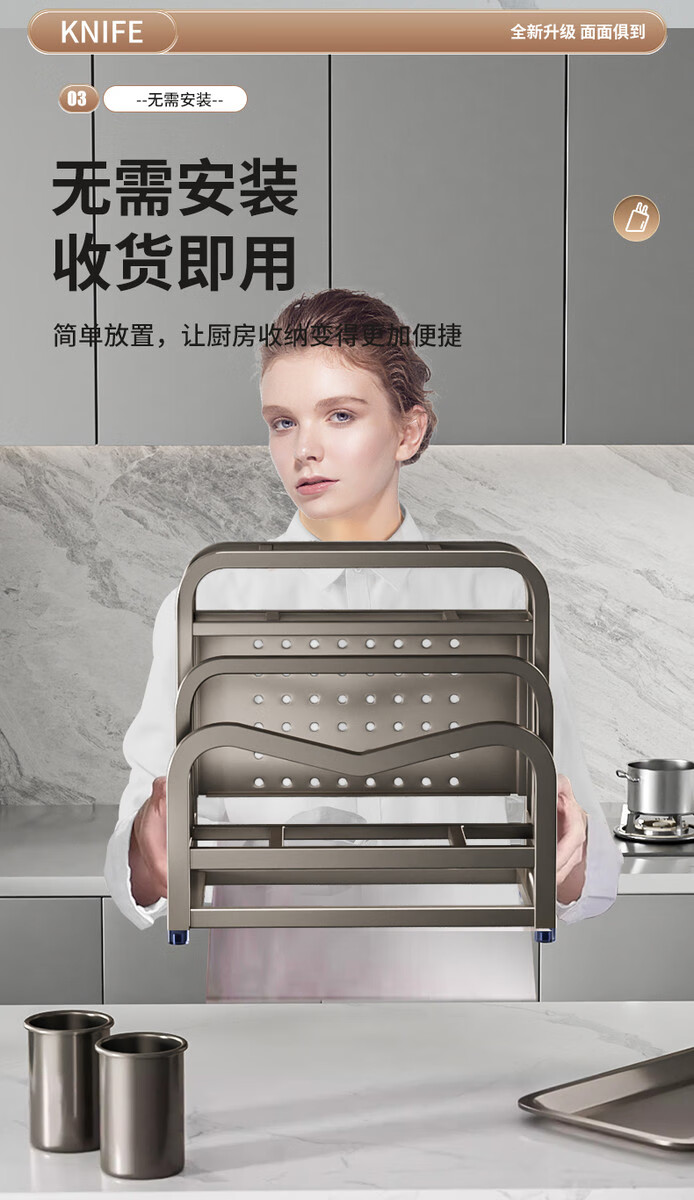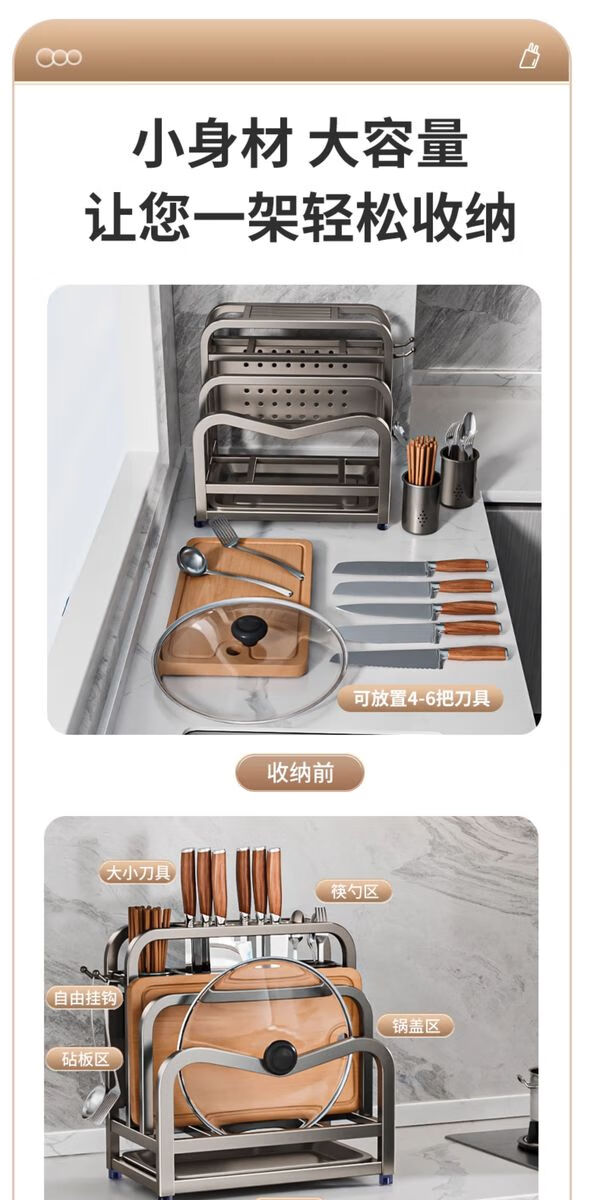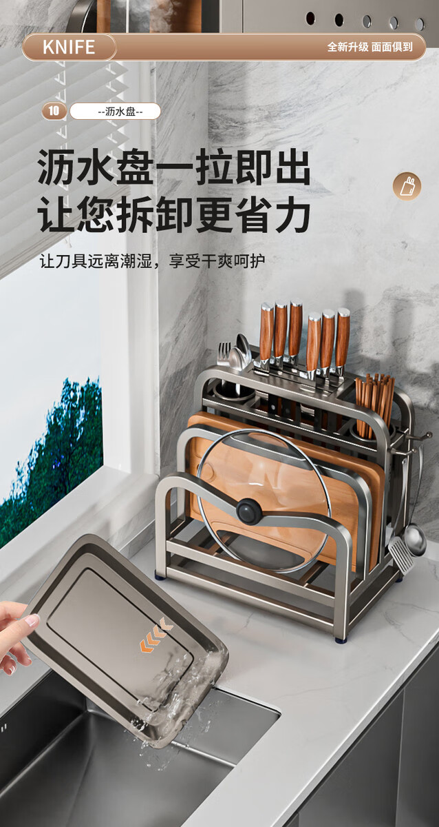 Fantasy stainless steel kitchen knife rack wall-mounted multi-functional cutting board, knife and chopstick cage integrated storage rack. Main image gun gray. Width and height. Knife guard+double chopping board/pot lid rack+