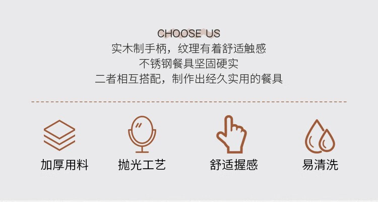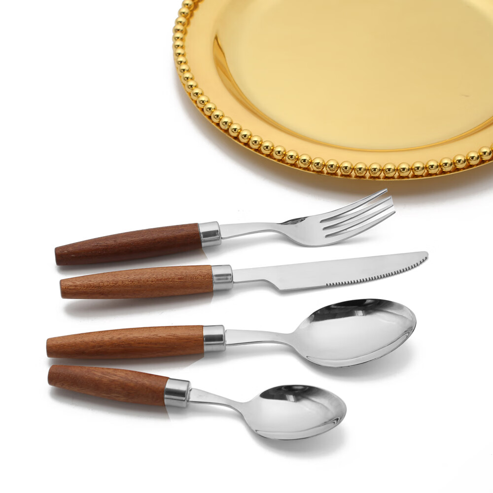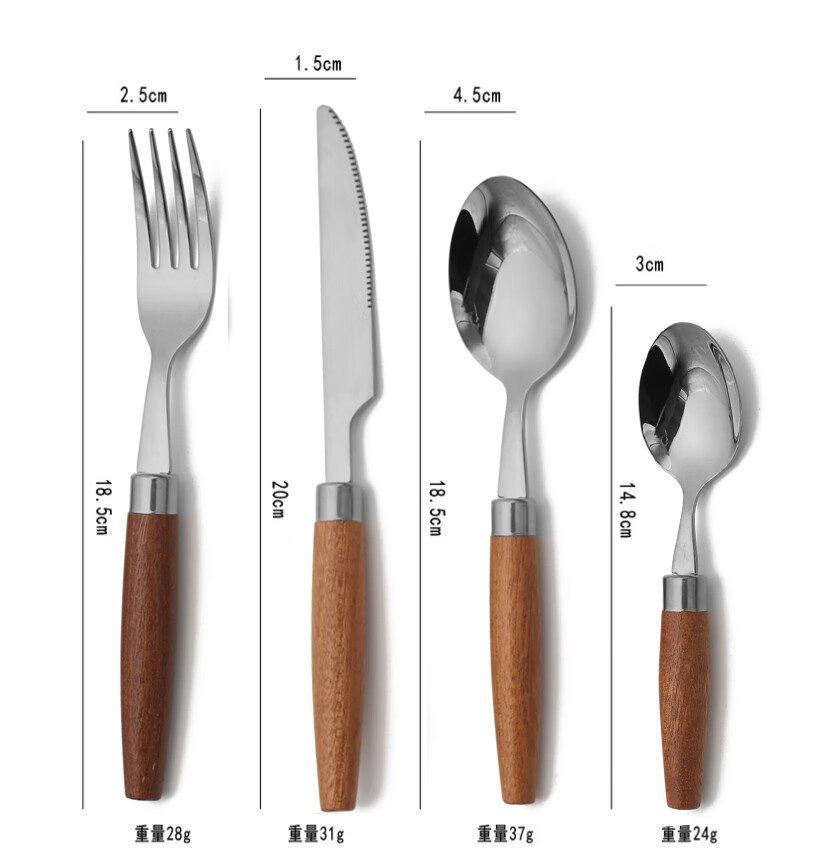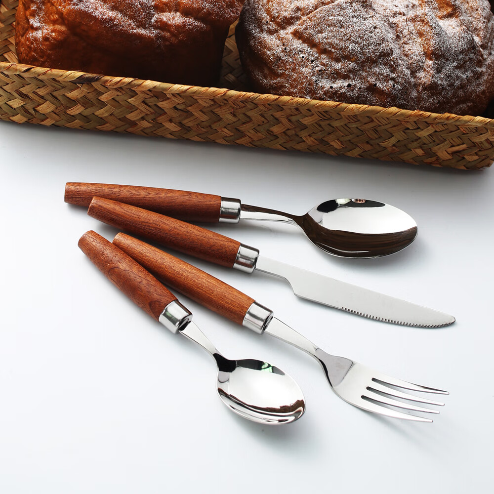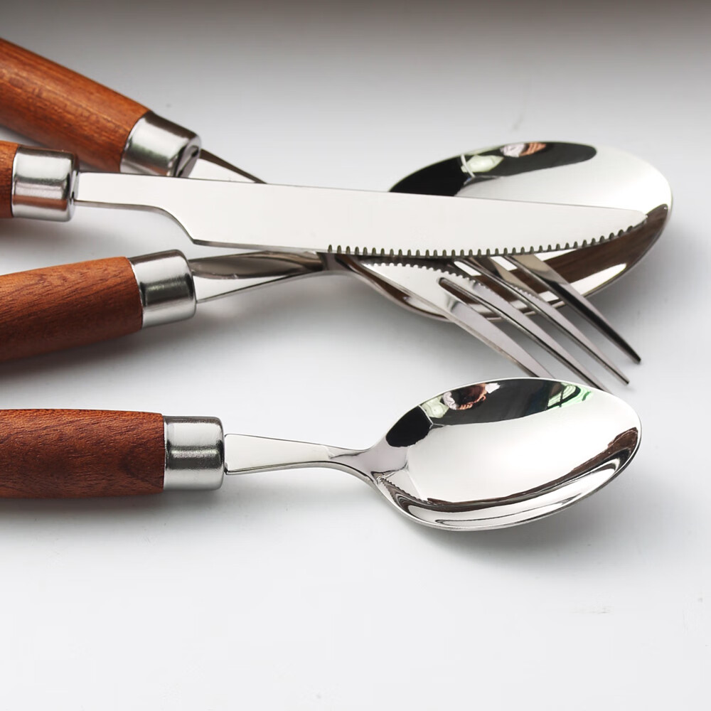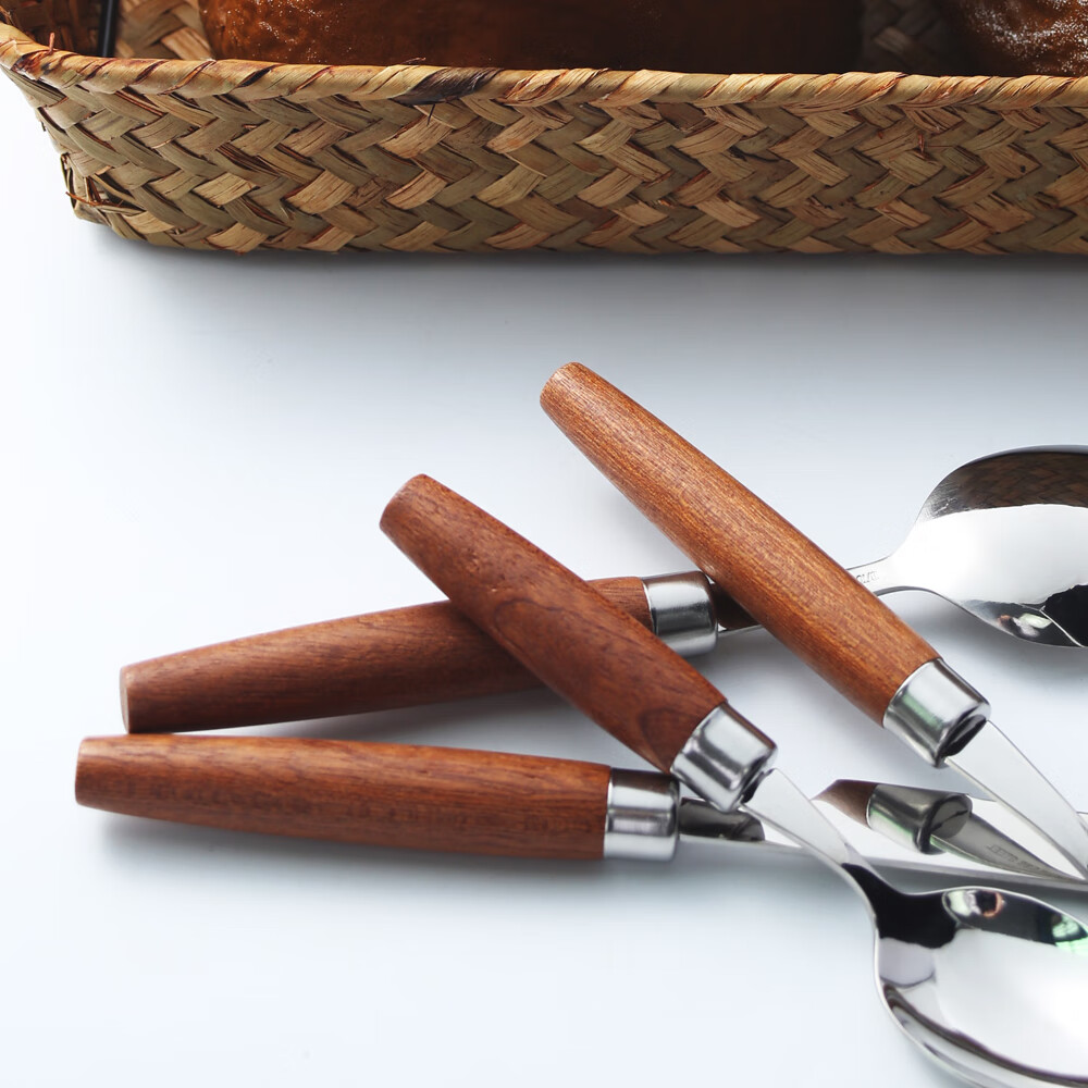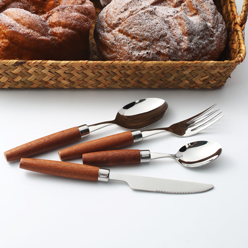 Qiao Bo Lai Korean style ins style spoon 304 stainless steel Western steak knife, fork and spoon Sapele solid wood handle tableware household soup spoon and fork silver knife, fork and spoon 4-piece set