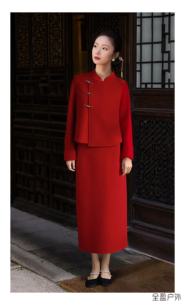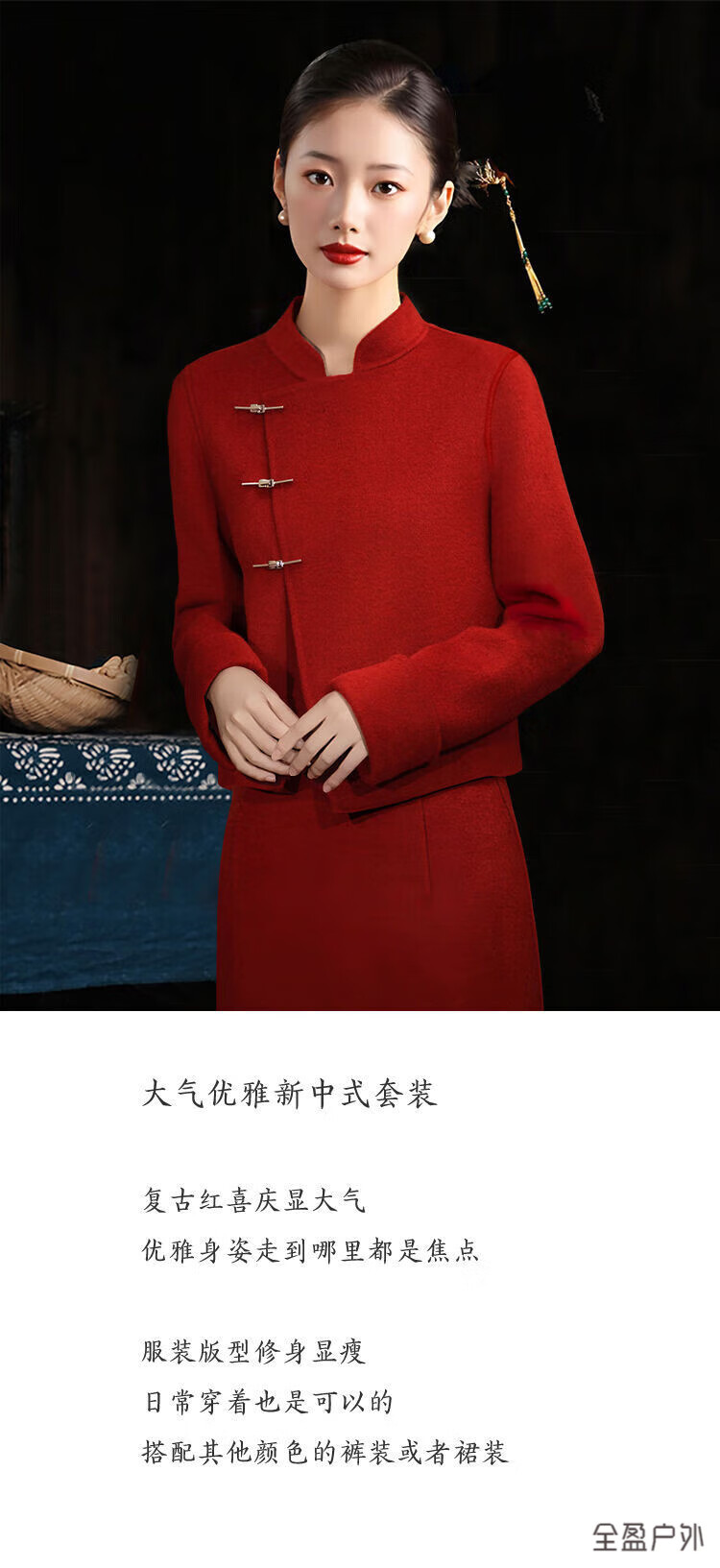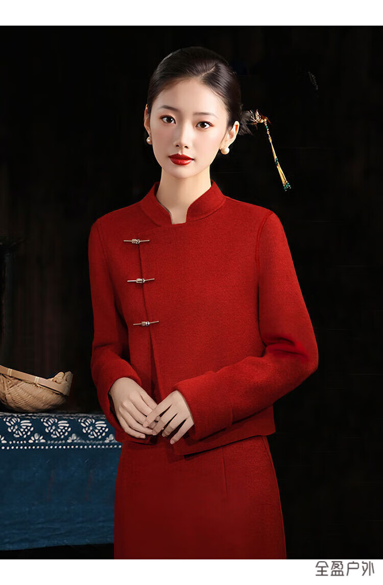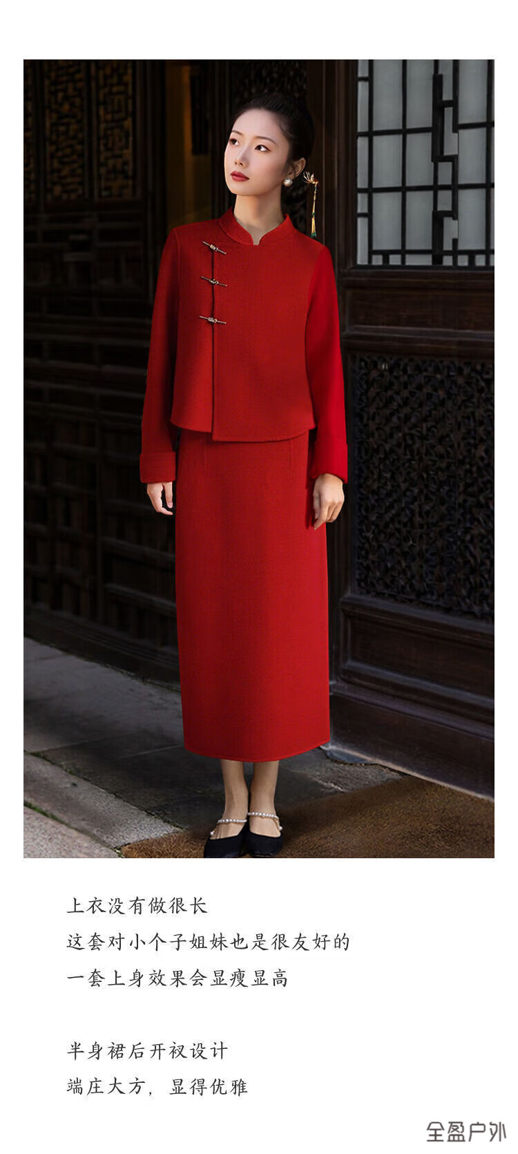 OIMG light luxury high-end winter Chinese style red woolen coat women's autumn engagement dress wedding dress toasting dress red jacket + skirt (set) L