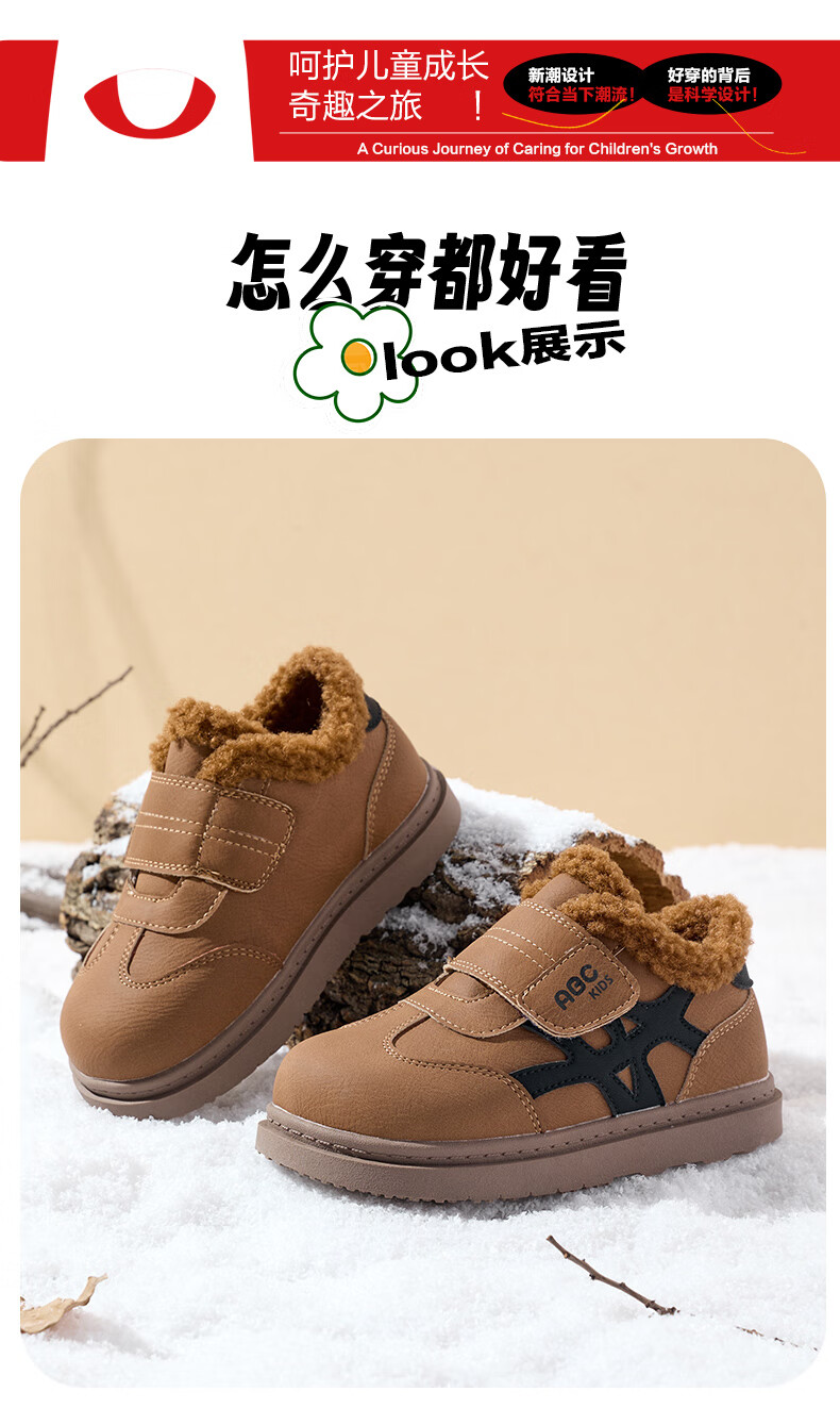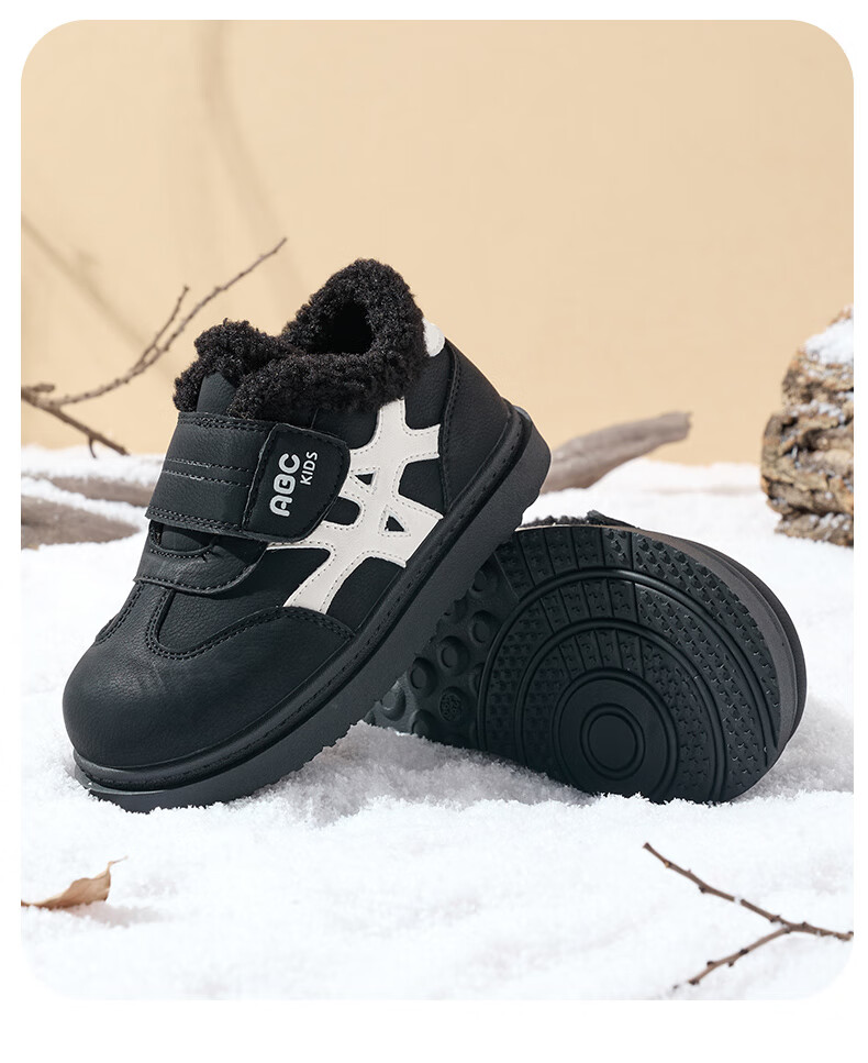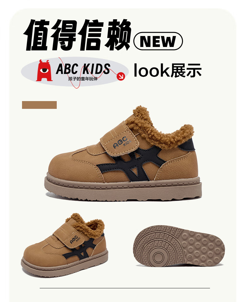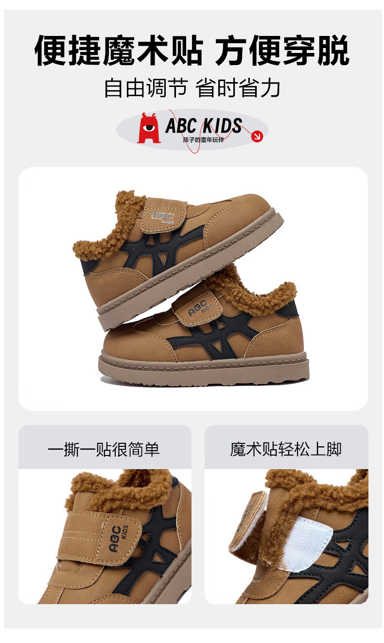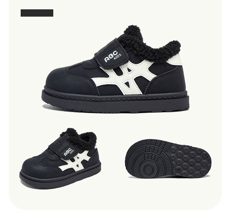 ABC KIDS children's shoes, fashionable children's velvet cotton shoes, boys' simple casual shoes, 2026 winter new girls' warm shoes, black/camel 28, inner length about 18cm