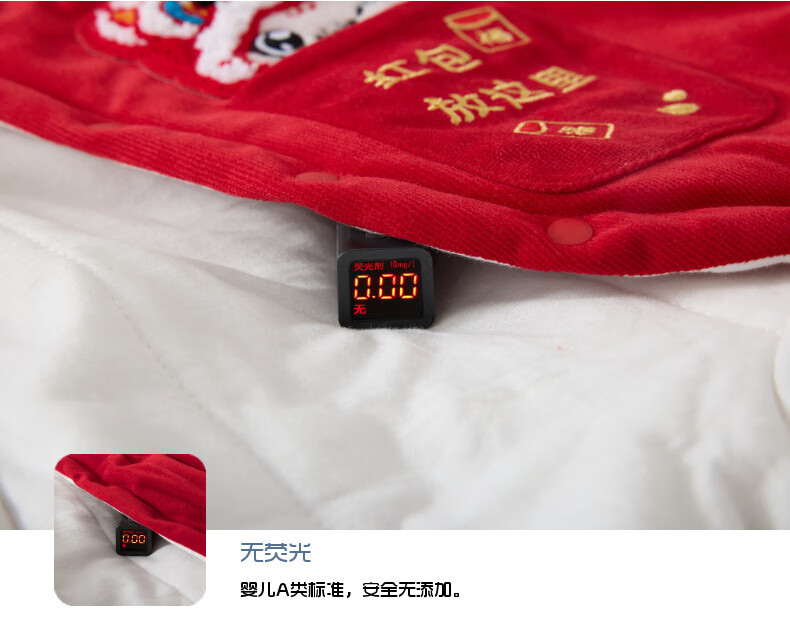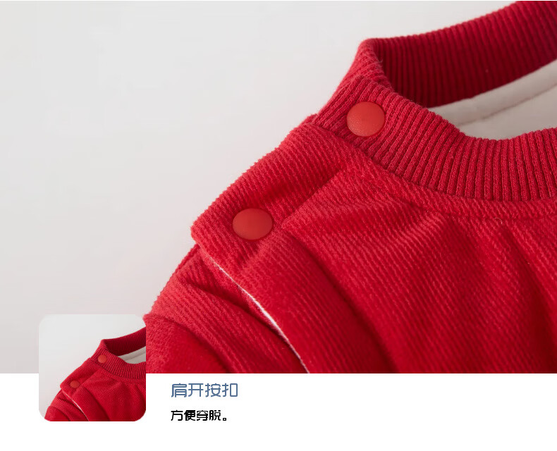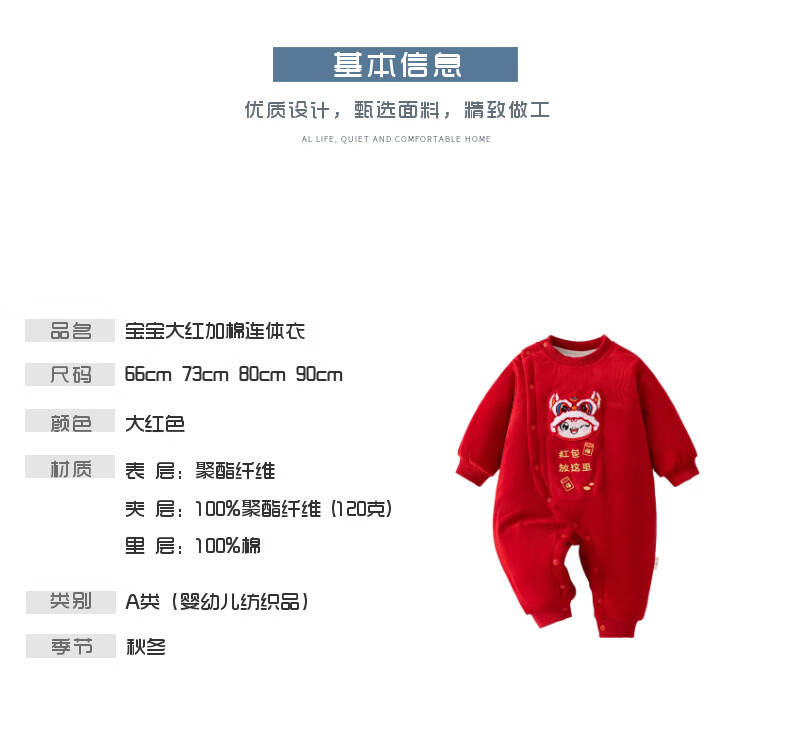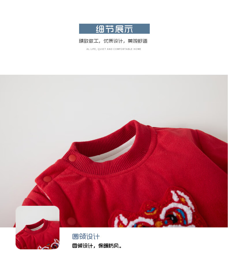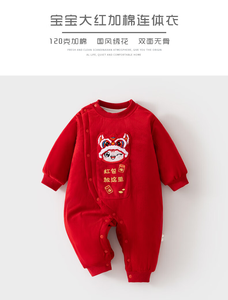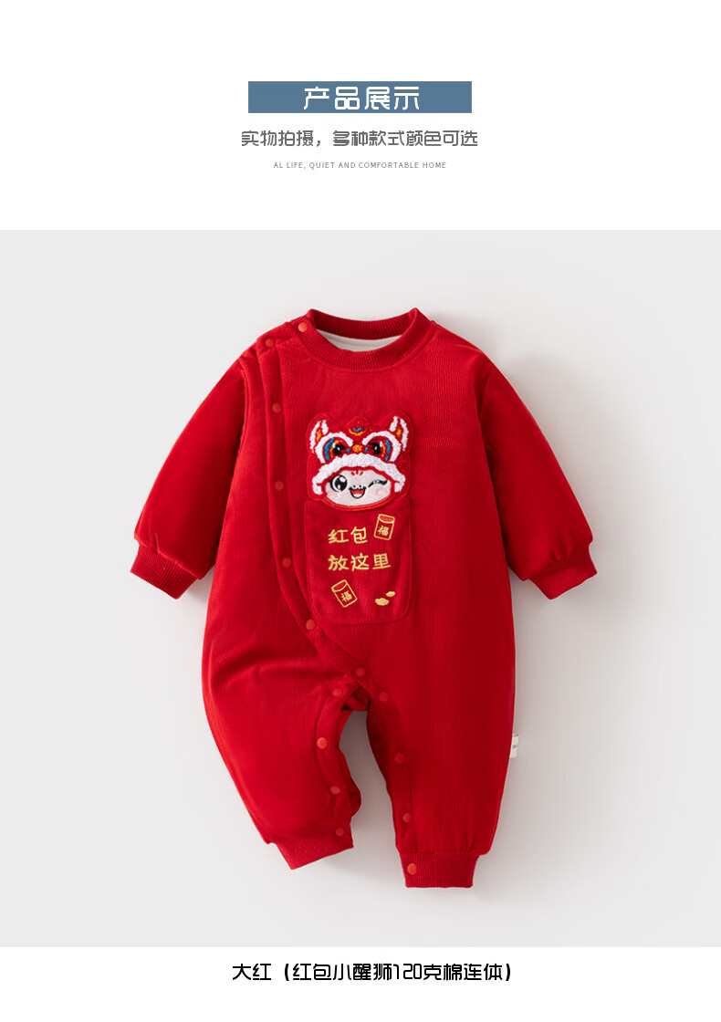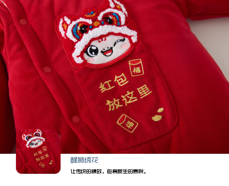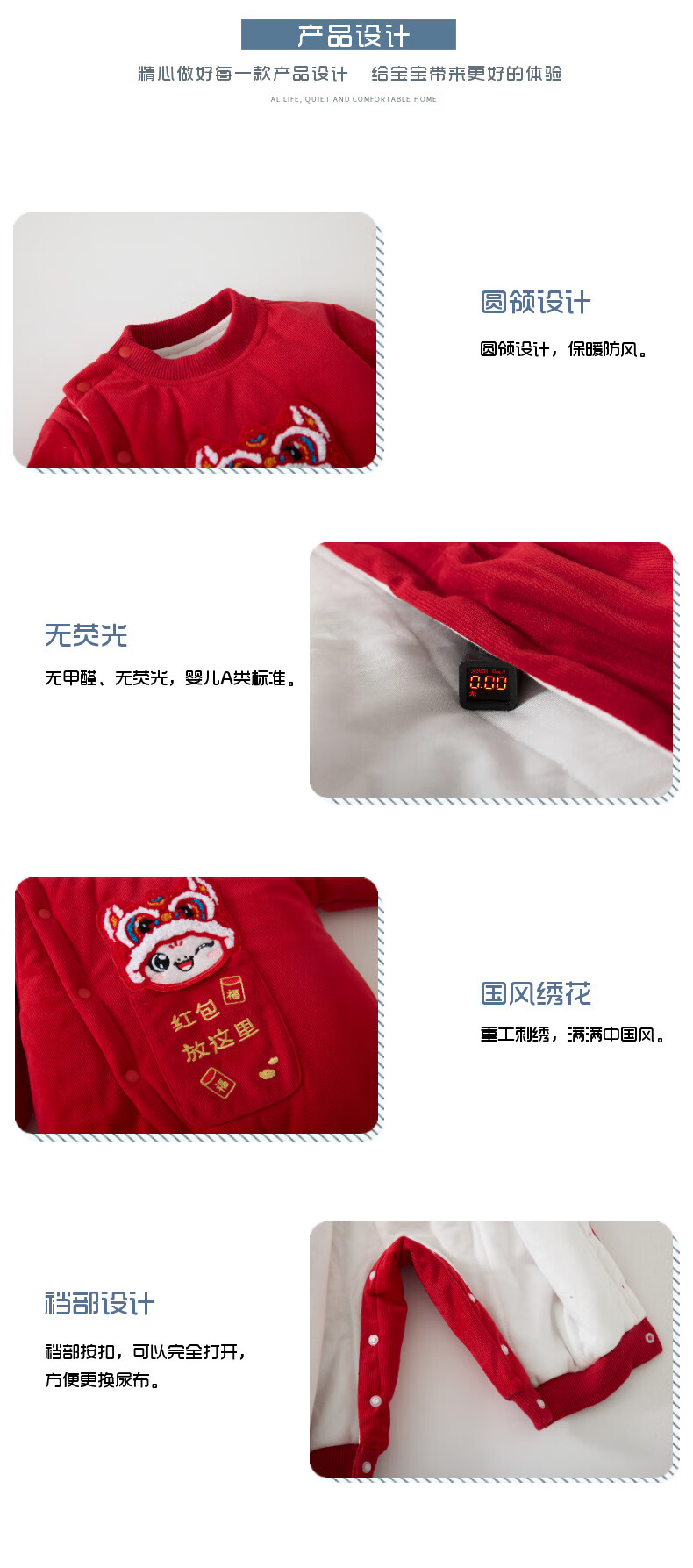 Wua wua baby jumpsuit one-year-old baby quilted autumn and winter outing clothes festive big red red envelope romper suit new year greeting suit big red (red envelope little lion 120g cotton one-piece) 73cm