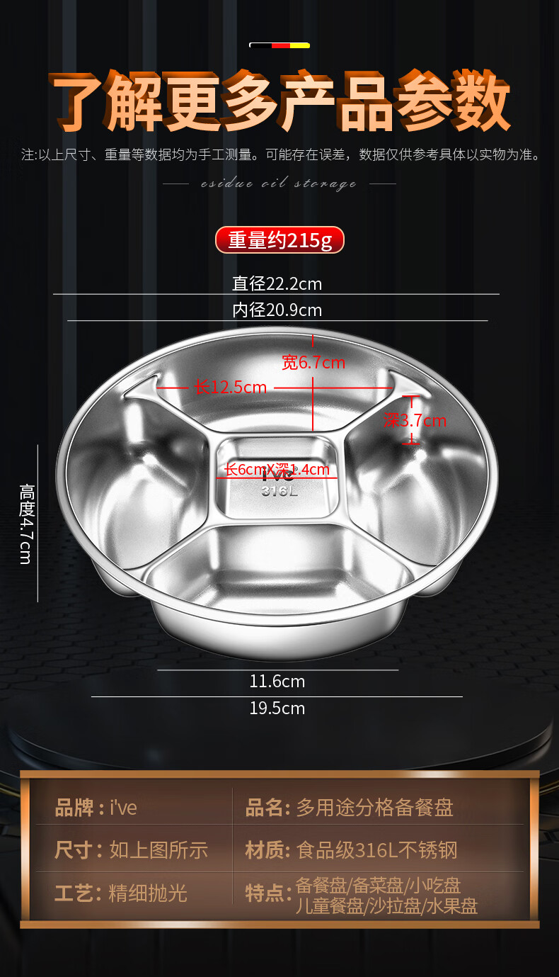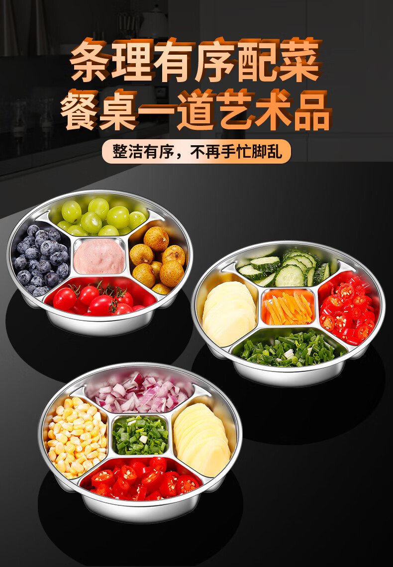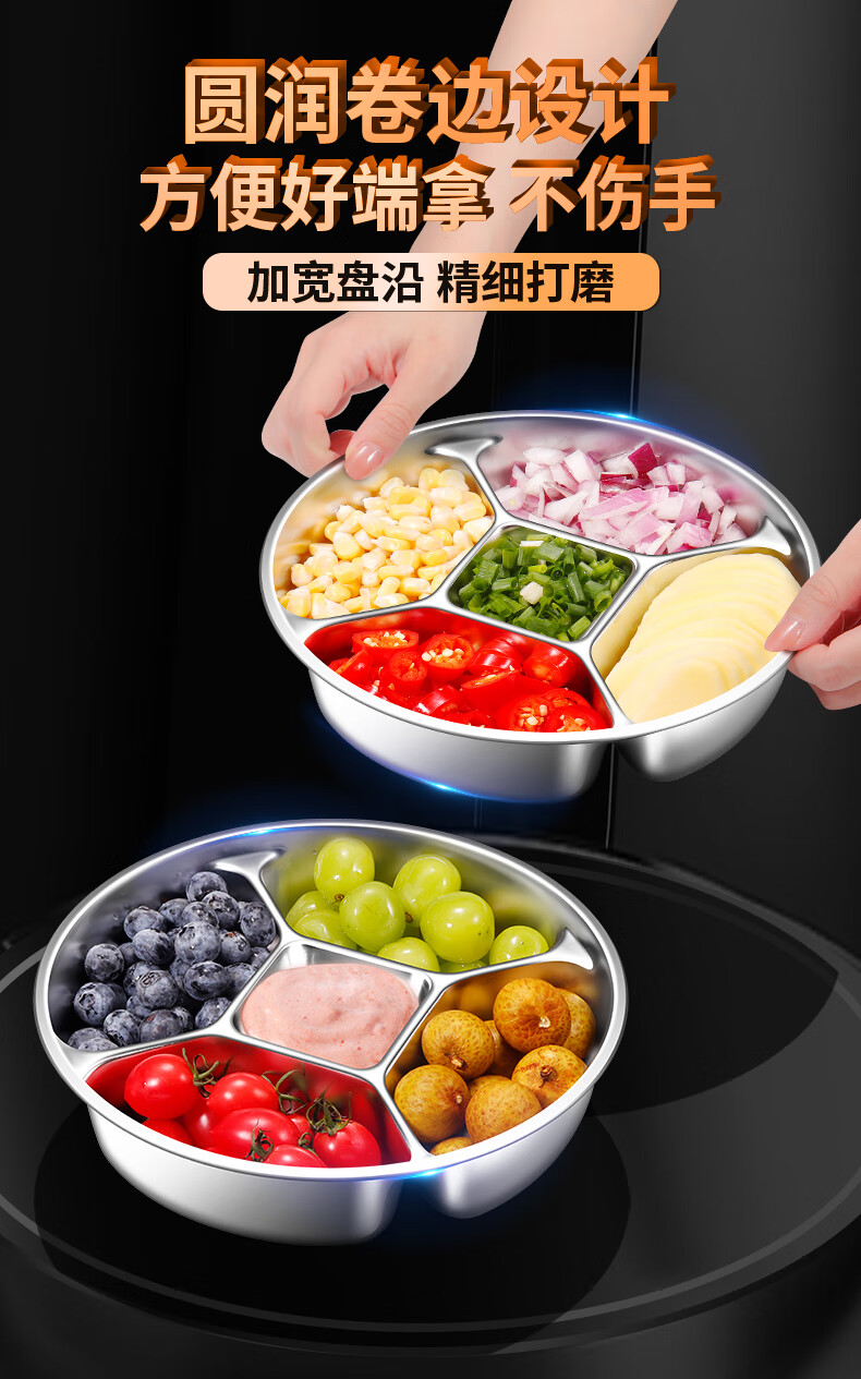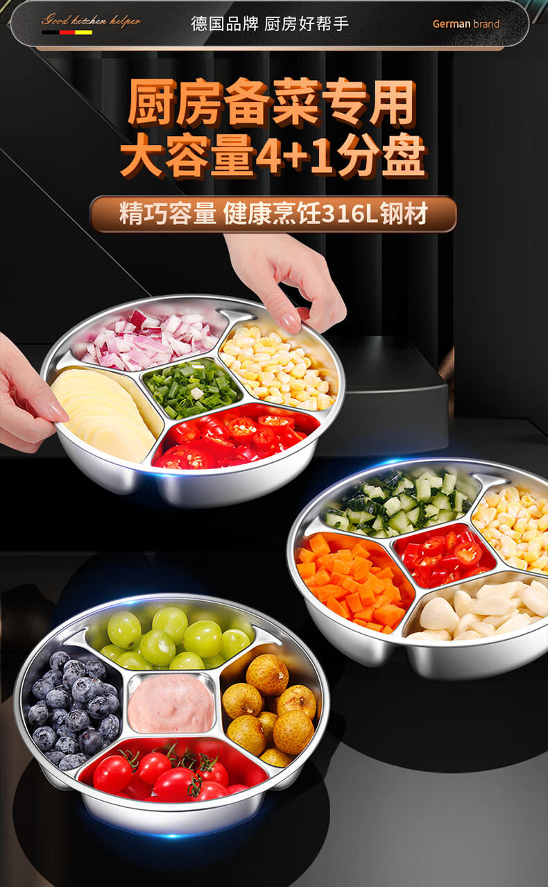 I VE316L stainless steel divided plate for kitchen onion, ginger and garlic ingredients divided plate for deepening hot pot side dish tray. Upgraded and thickened 316L all-steel-five-compartment plate for food preparation-dipping-separating-food supplement-steaming tray.