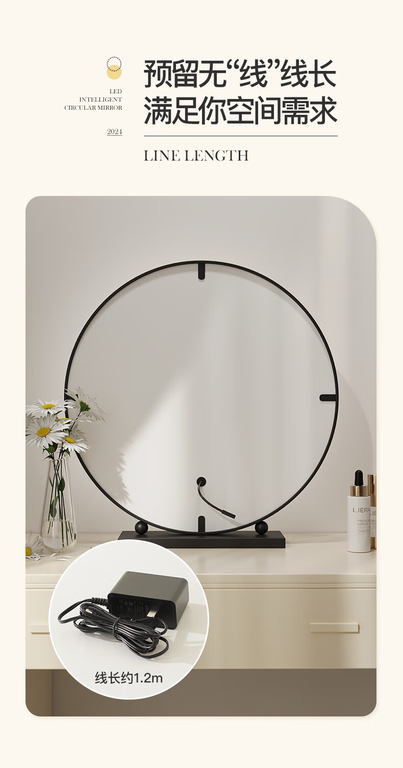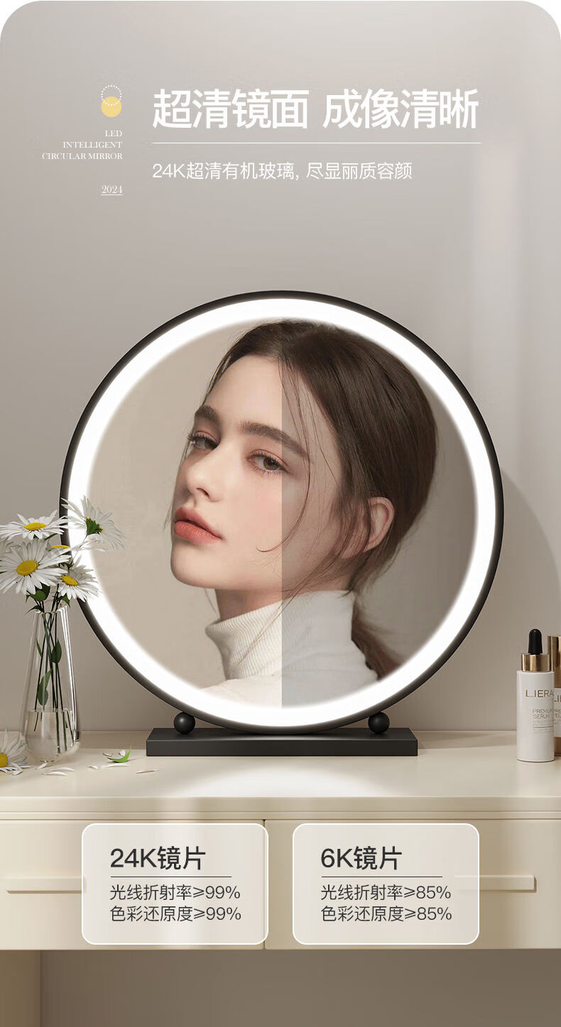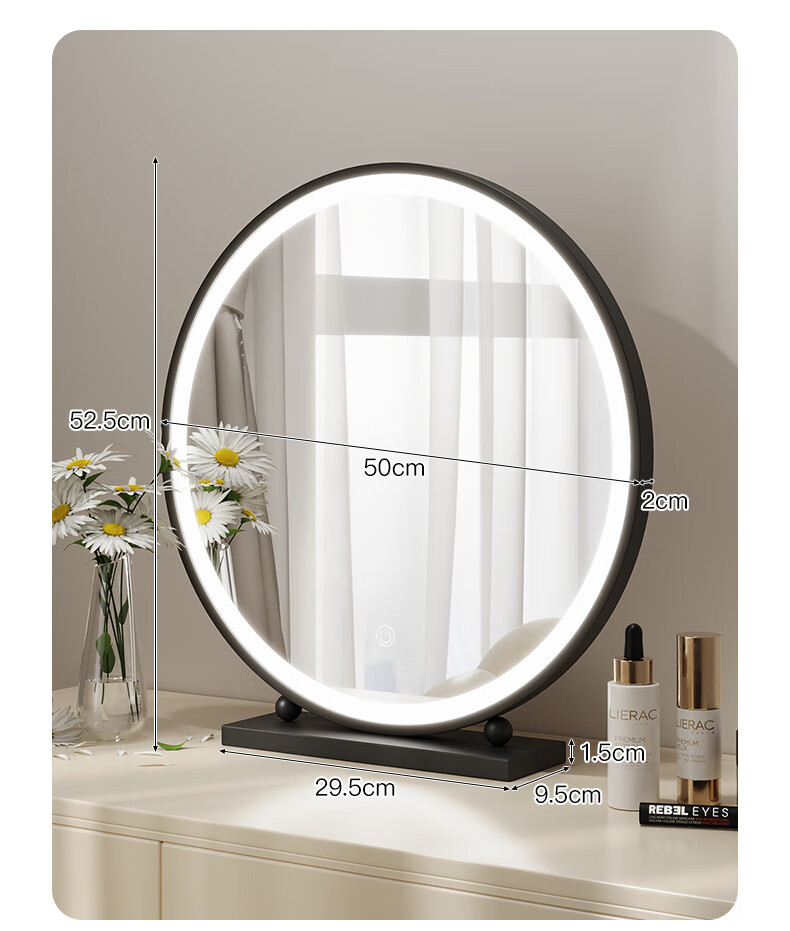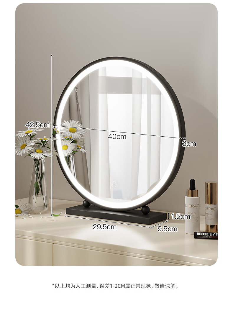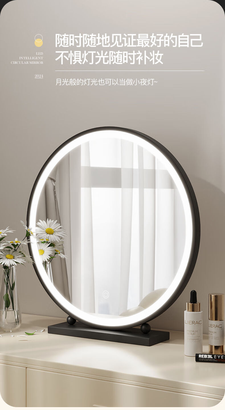 LED lighted makeup mirror desktop desktop makeup mirror dormitory bedroom supplementary light rechargeable round makeup table large mirror 60CM black fixed charging model