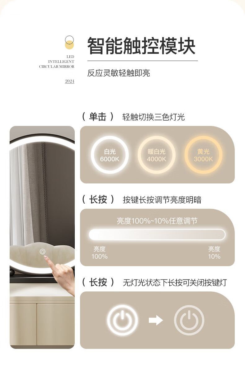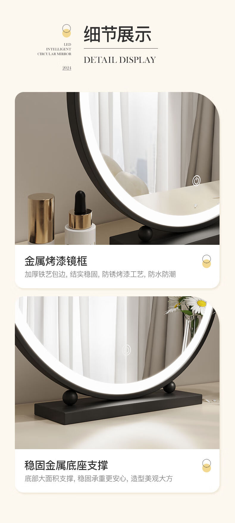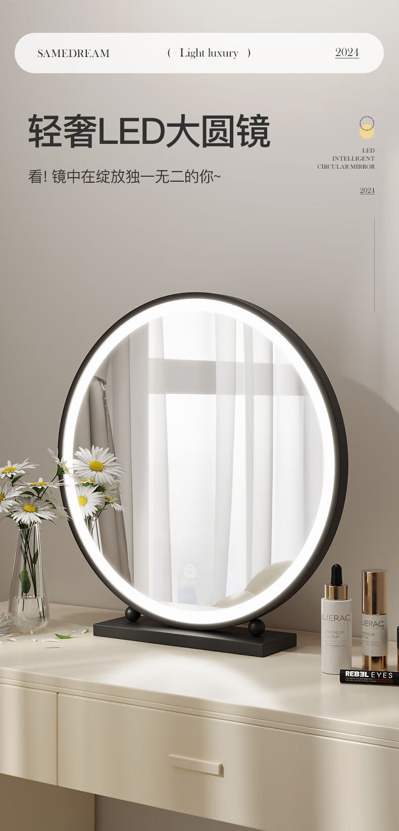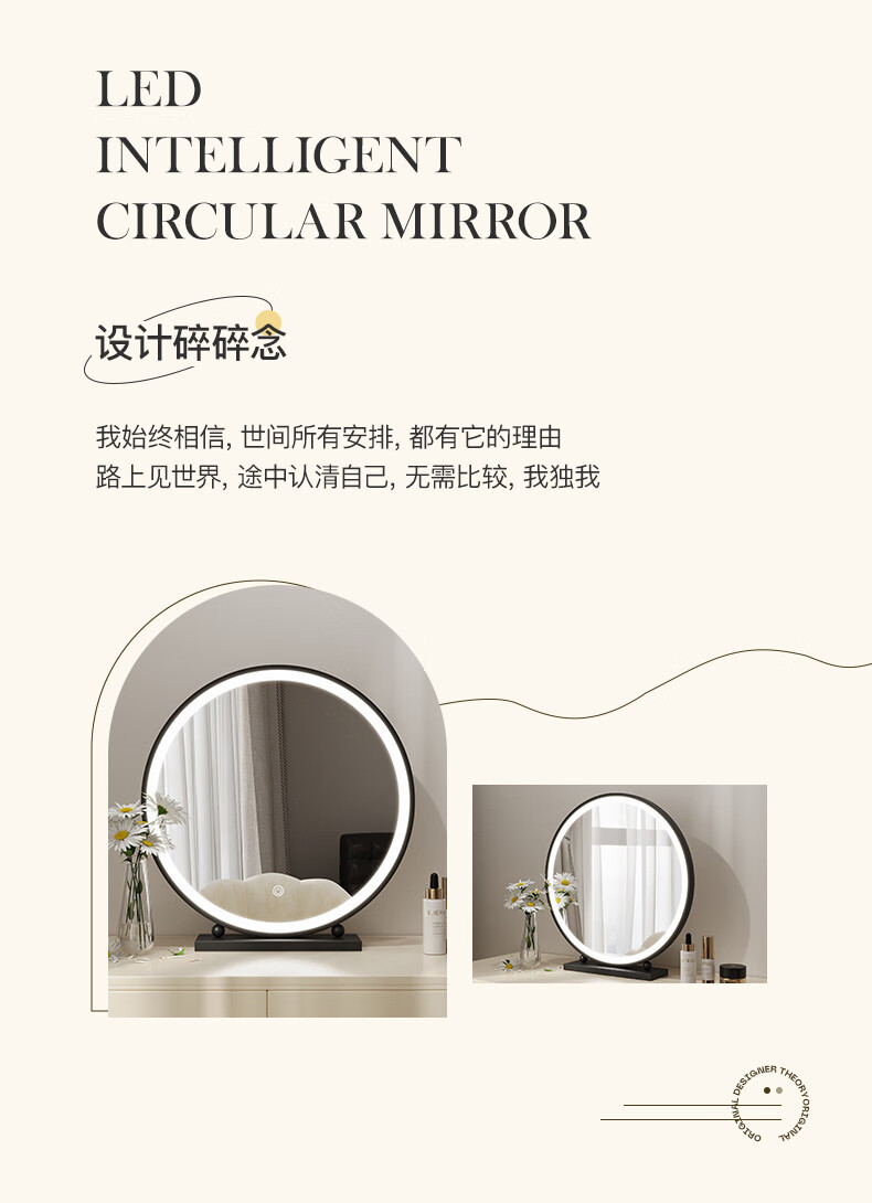 LED lighted makeup mirror desktop desktop makeup mirror dormitory bedroom supplementary light rechargeable round makeup table large mirror 60CM black fixed charging model