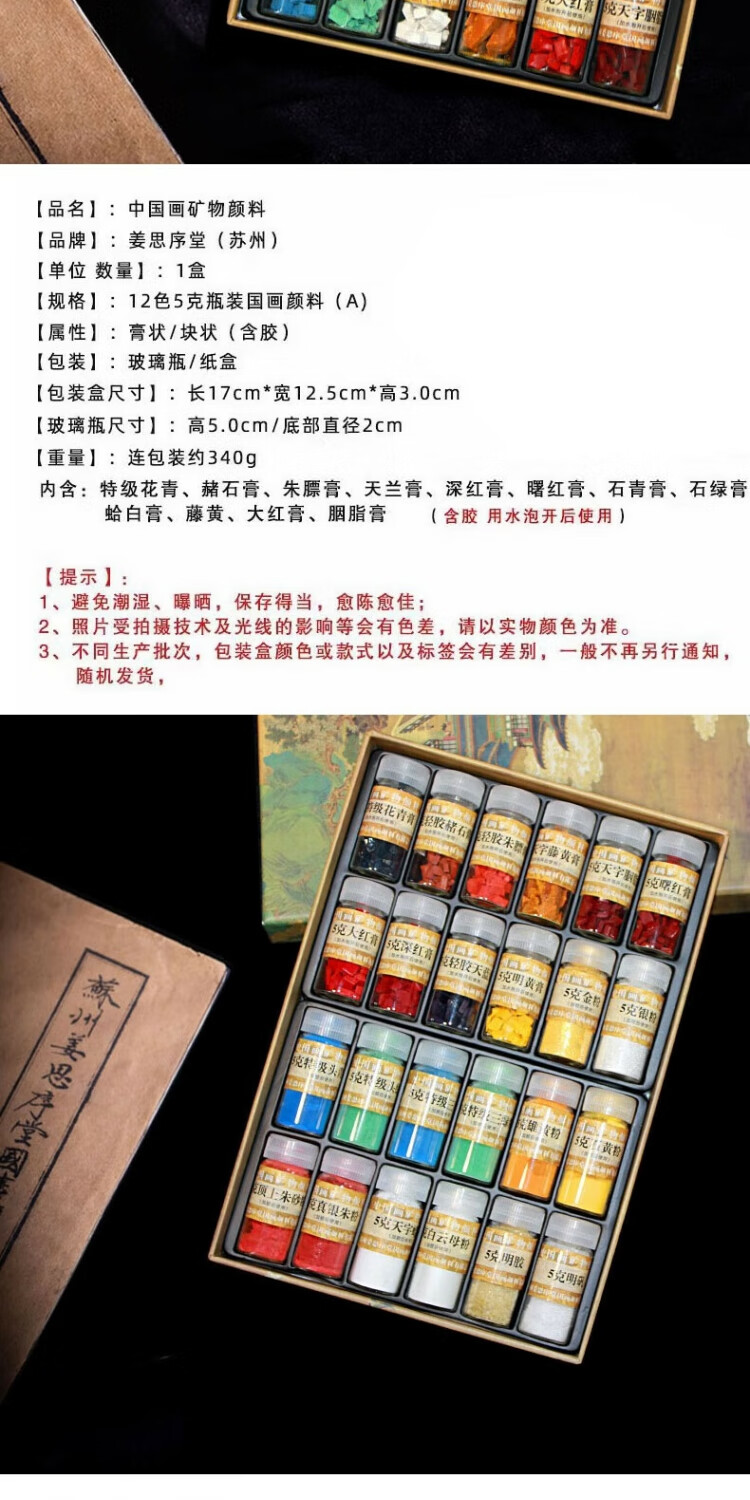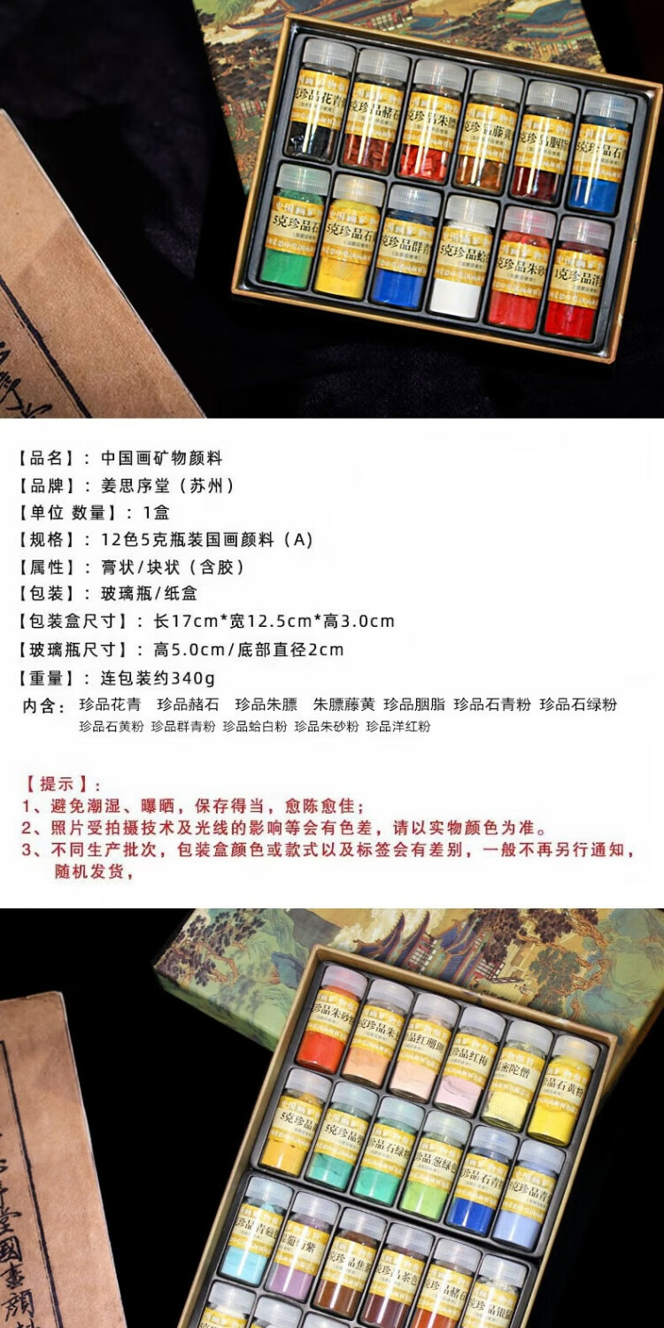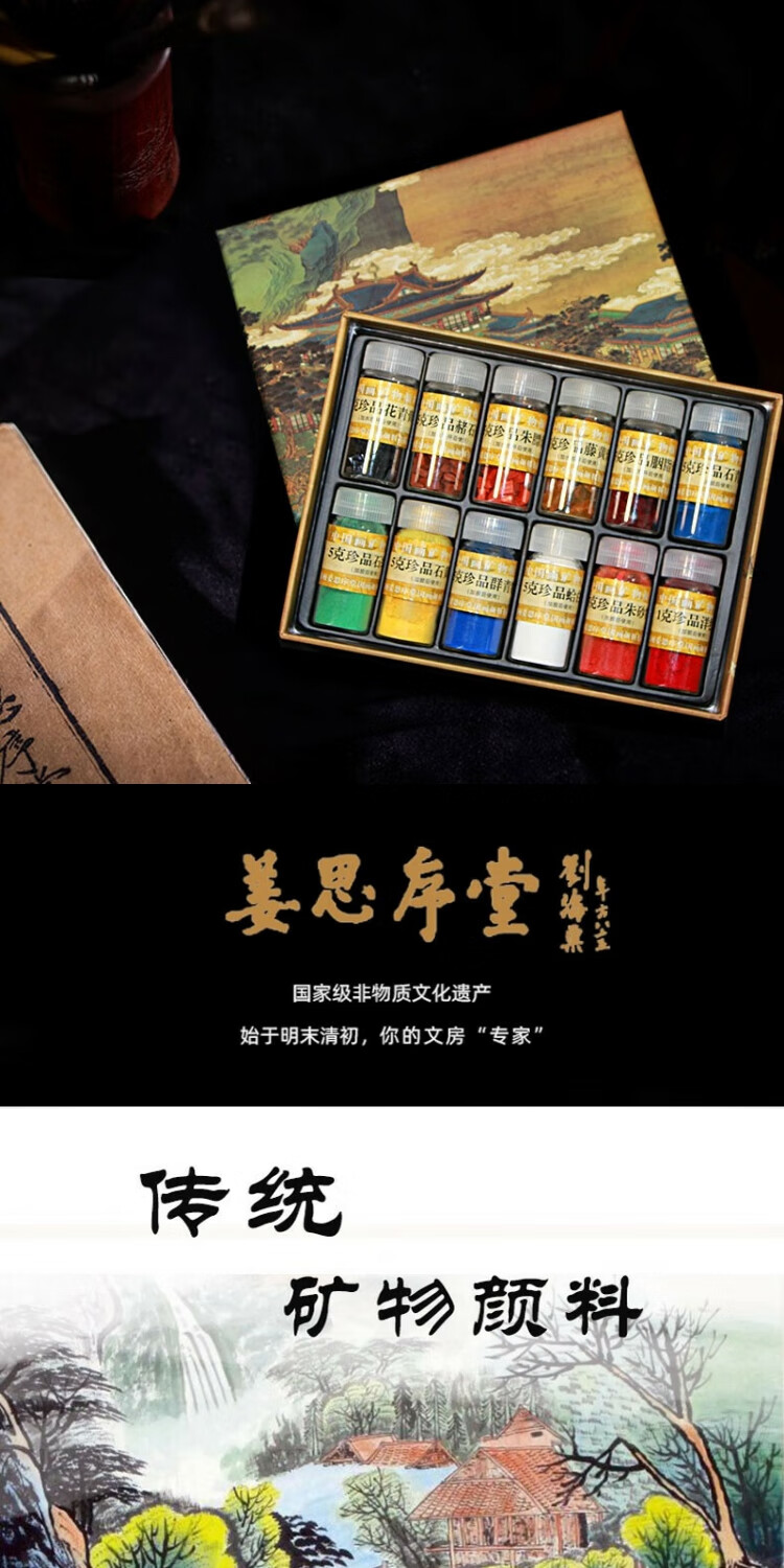 Jiang Sixu Tang 5g bottled 12-color Chinese painting pigments natural mineral plant pigments Chinese painting freehand brushwork ink painting block pigment high-end gift gift 12-color 5g bottled Chinese painting pigments (treasure)