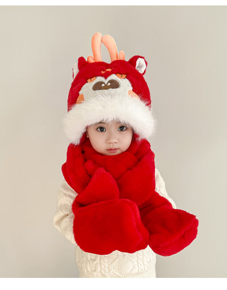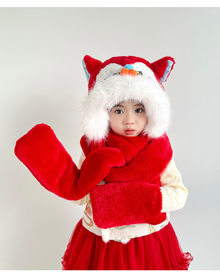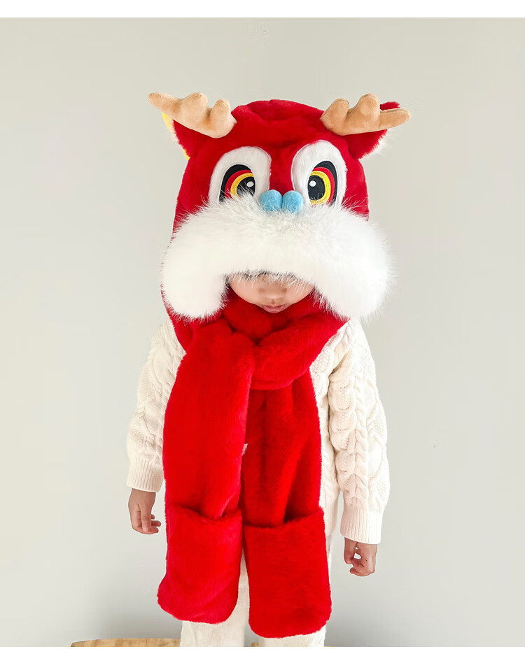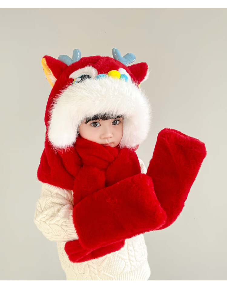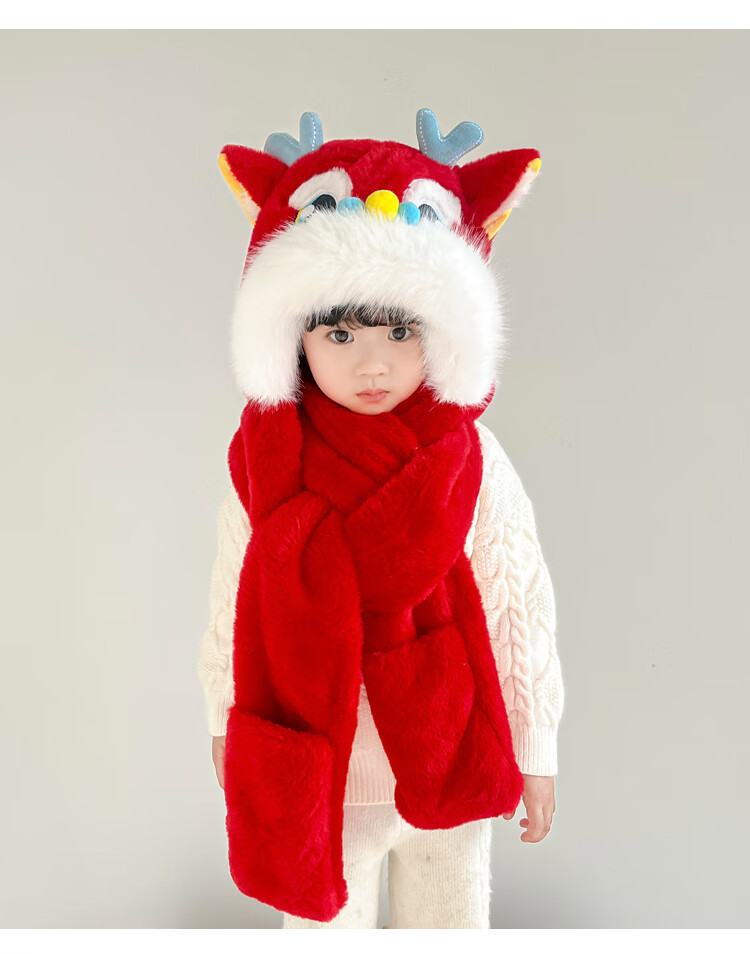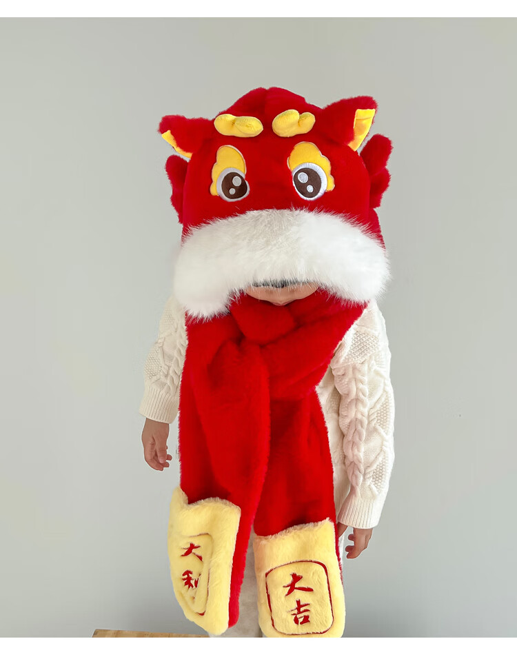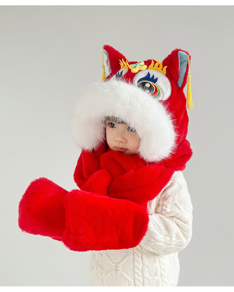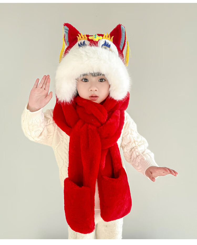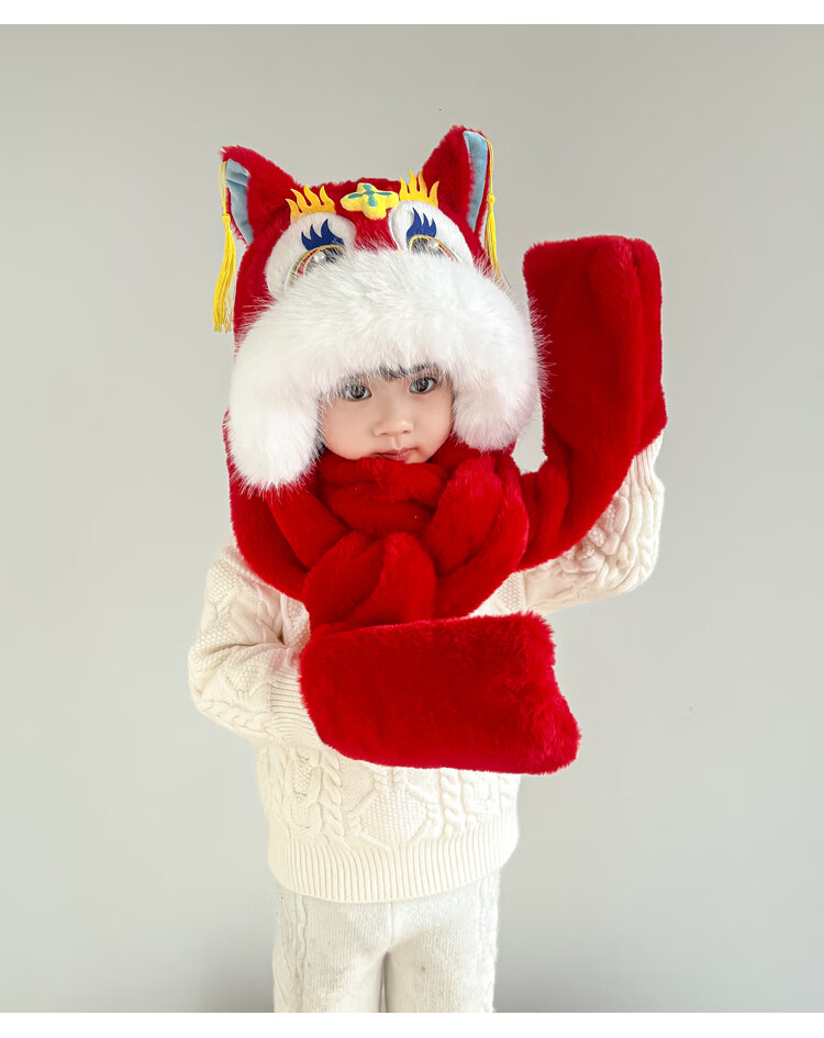 Disney national style red New Year's children's dragon head lion awakening plush hat, scarf and gloves in one winter for boys and girls to keep warm tiger head three-piece set with tassel lion awakening hat - red 6 years old and above to adults, one size fits all