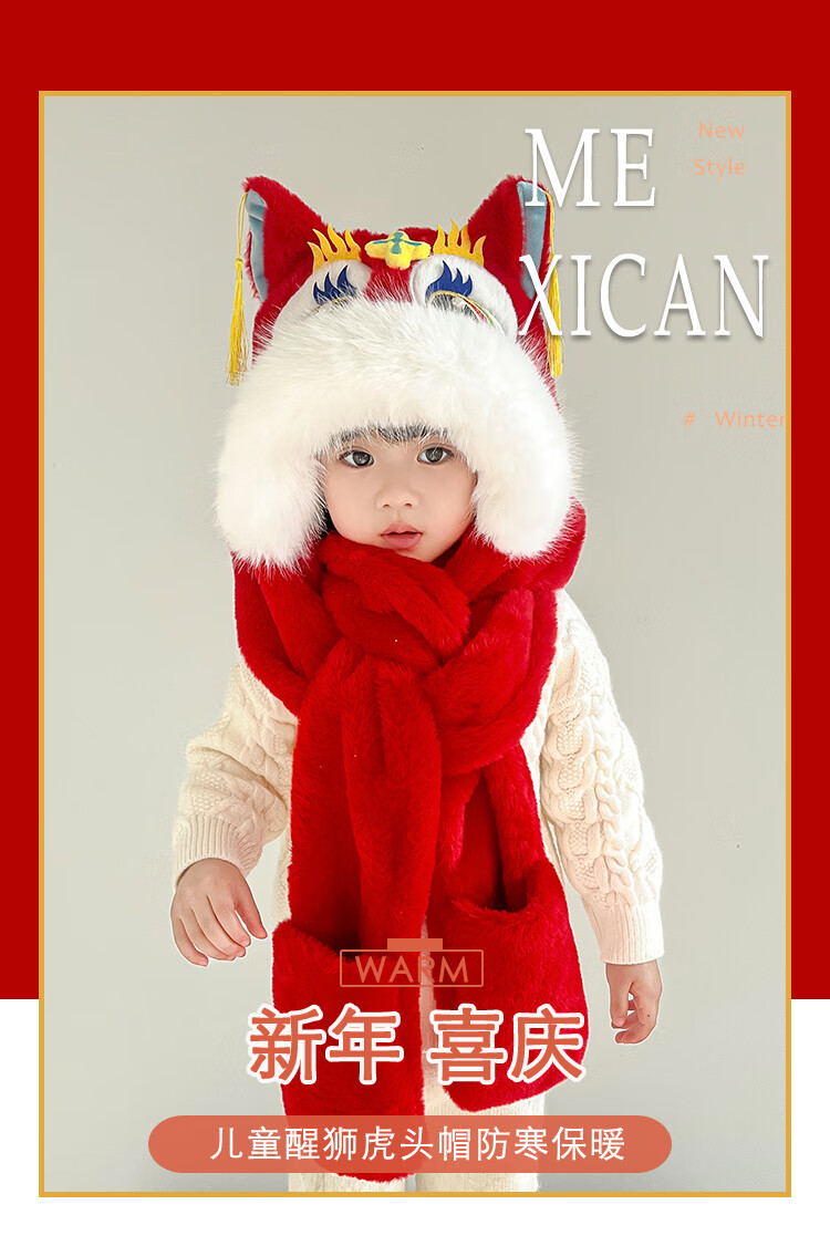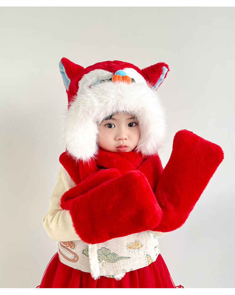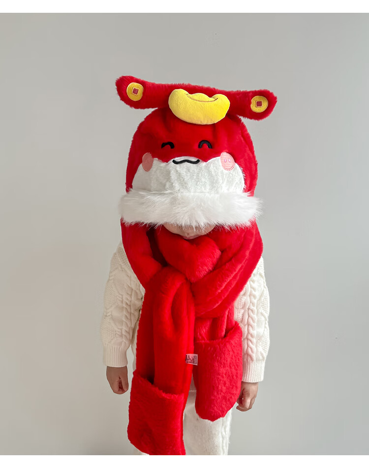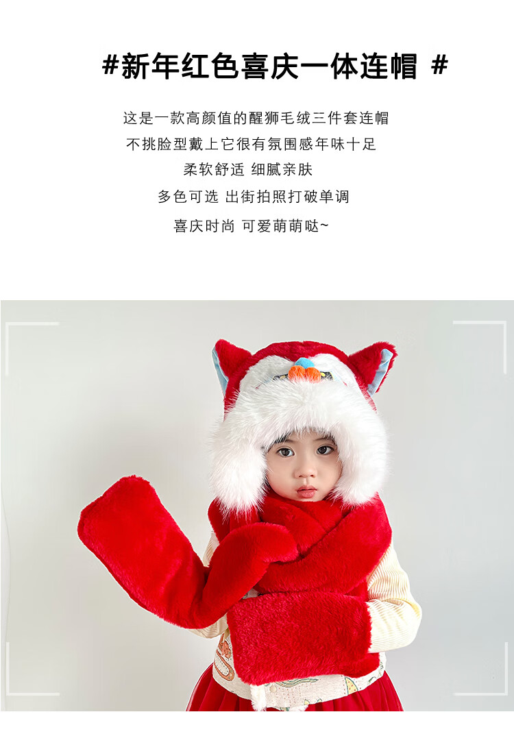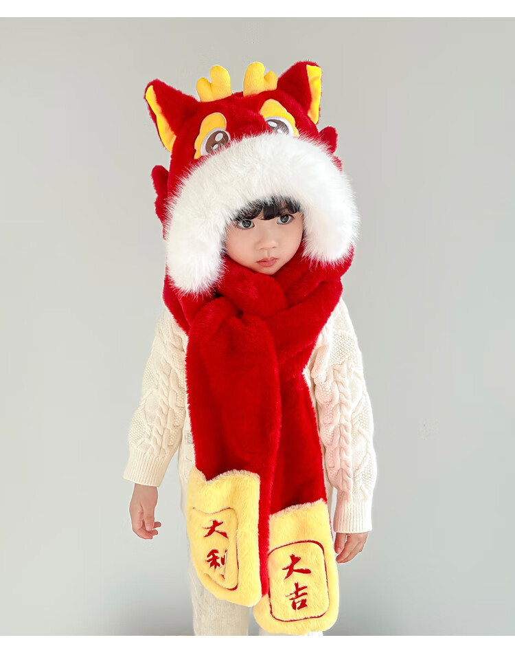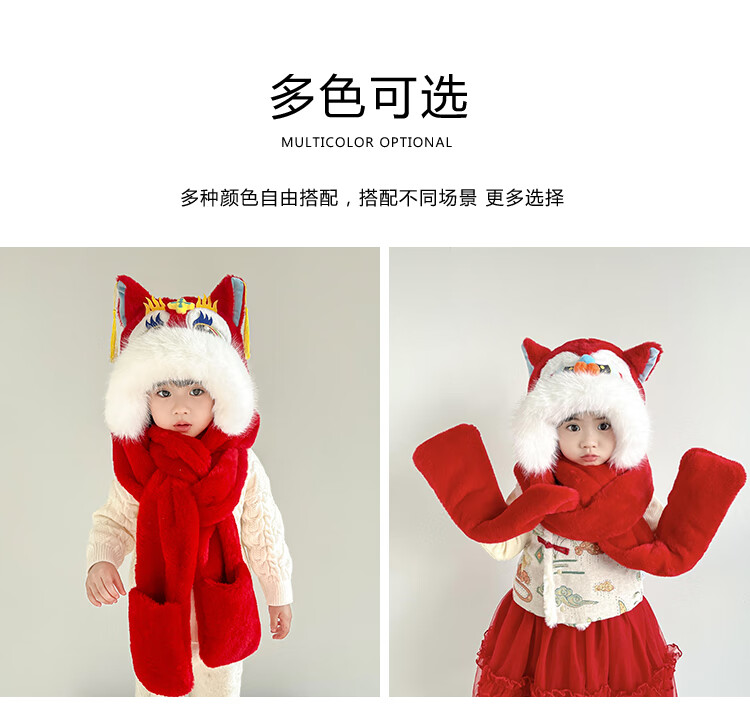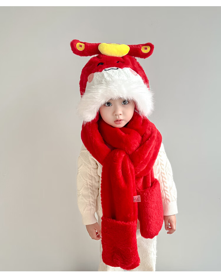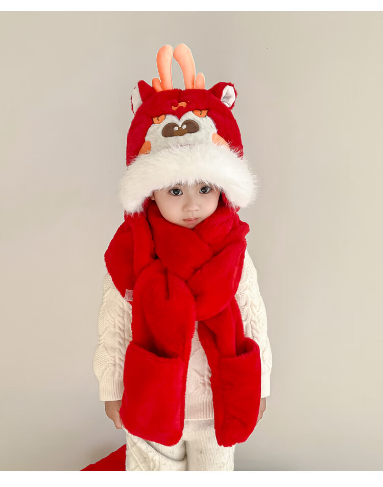 Disney national style red New Year's children's dragon head lion awakening plush hat, scarf and gloves in one winter for boys and girls to keep warm tiger head three-piece set with tassel lion awakening hat - red 6 years old and above to adults, one size fits all